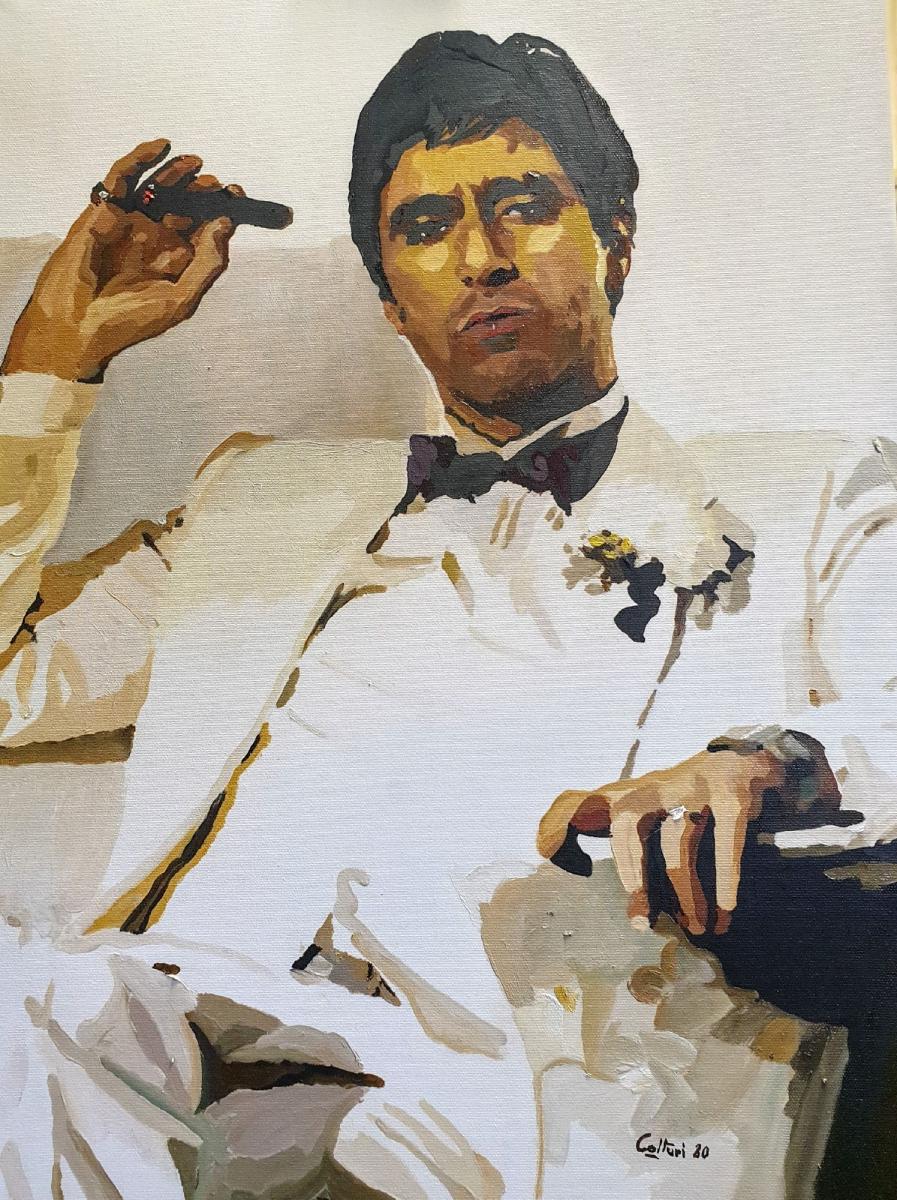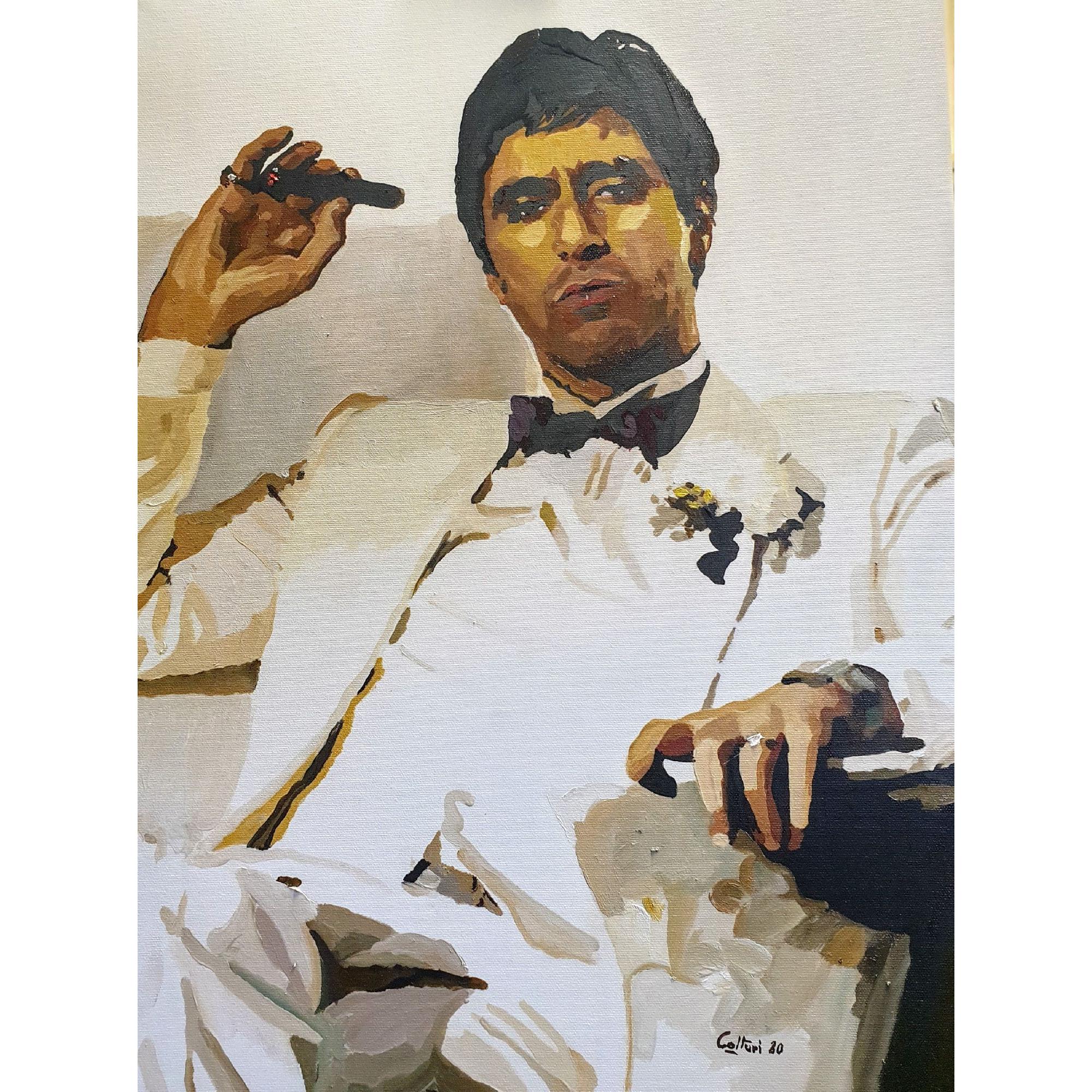 In questo ritratto pittorico di forte impatto visivo, l’artista restituisce la figura iconica di Tony Montana, alias Scarface, interpretato da Al Pacino, immortalato in una delle sue pose più celebri: completo bianco, fiore all’occhiello, sigaro tra le dita e sguardo sprezzante. L'opera, realizzata con una tecnica pittorica sintetica ma decisa, costruisce la forma attraverso campiture piatte e chiaroscuri netti, esaltando la drammaticità del personaggio senza cadere nel realismo fotografico.