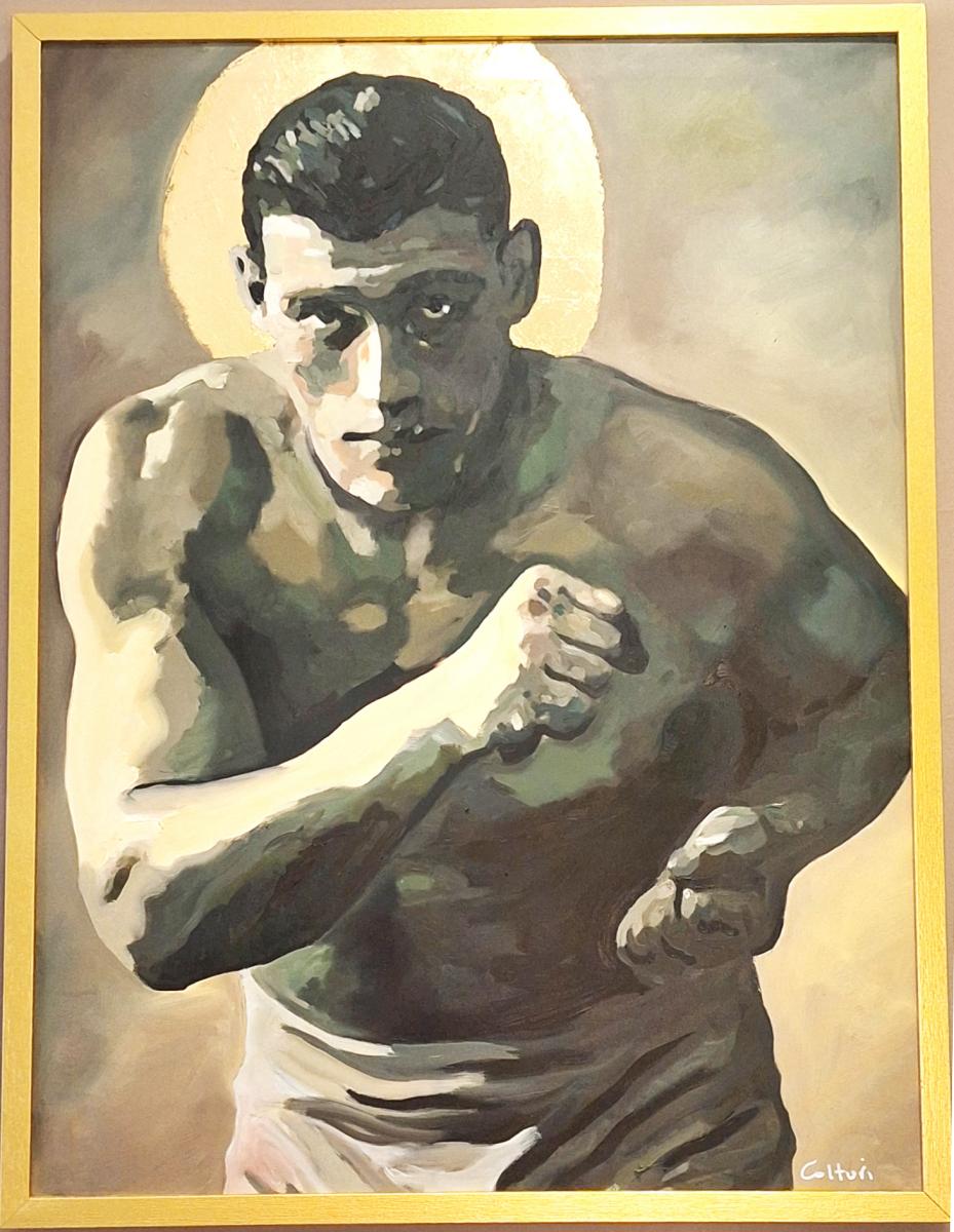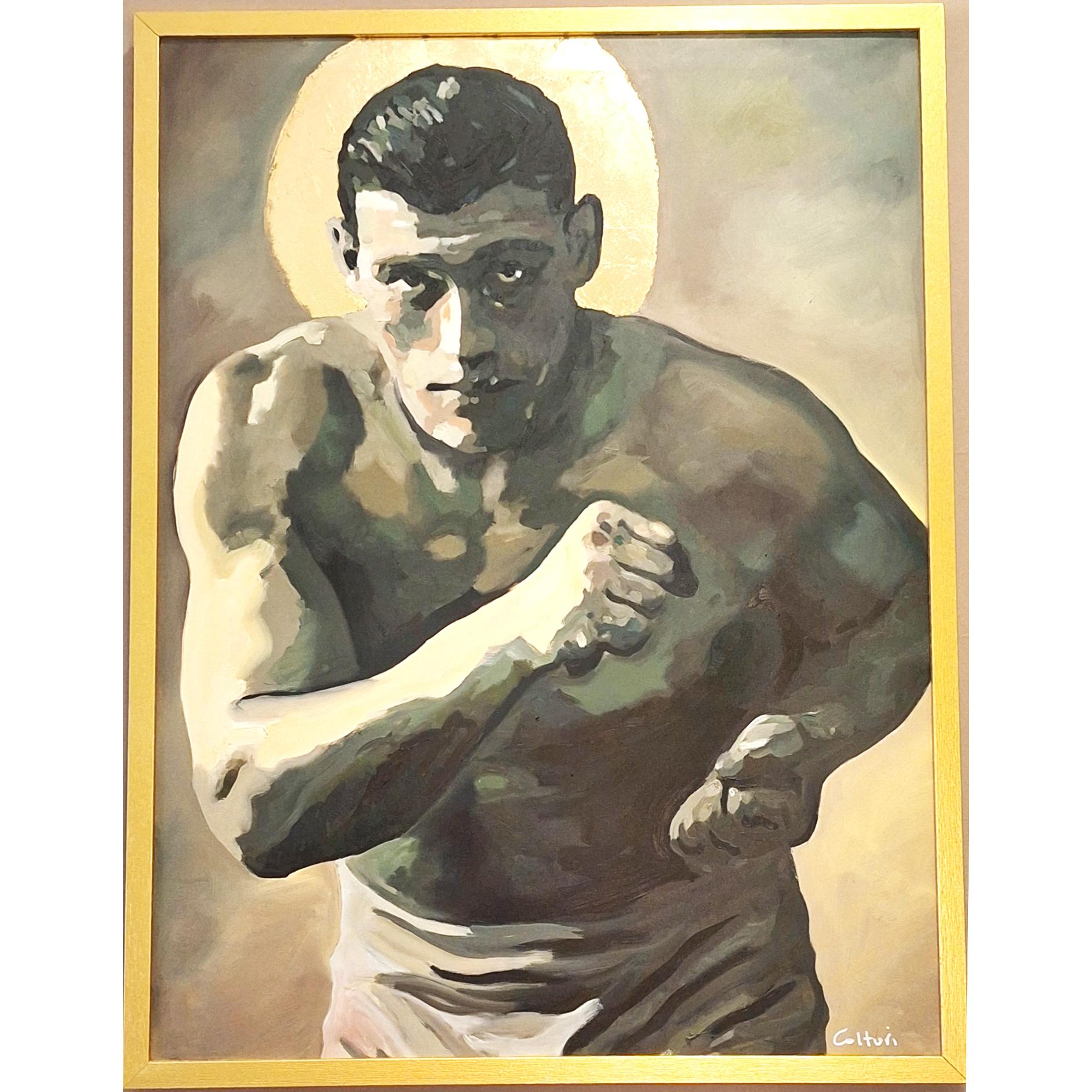 Questo dipinto raffigura il leggendario pugile italiano Primo Carnera in una posa combattiva, potente e fiera. L'opera, utilizza una tavolozza di toni tenui e terrosi, con forti chiaroscuri che modellano la massa muscolare e l'intensità dello sguardo. Il tratto pittorico, pur essendo realistico, lascia spazio a una certa stilizzazione espressiva che accentua la monumentalità della figura.