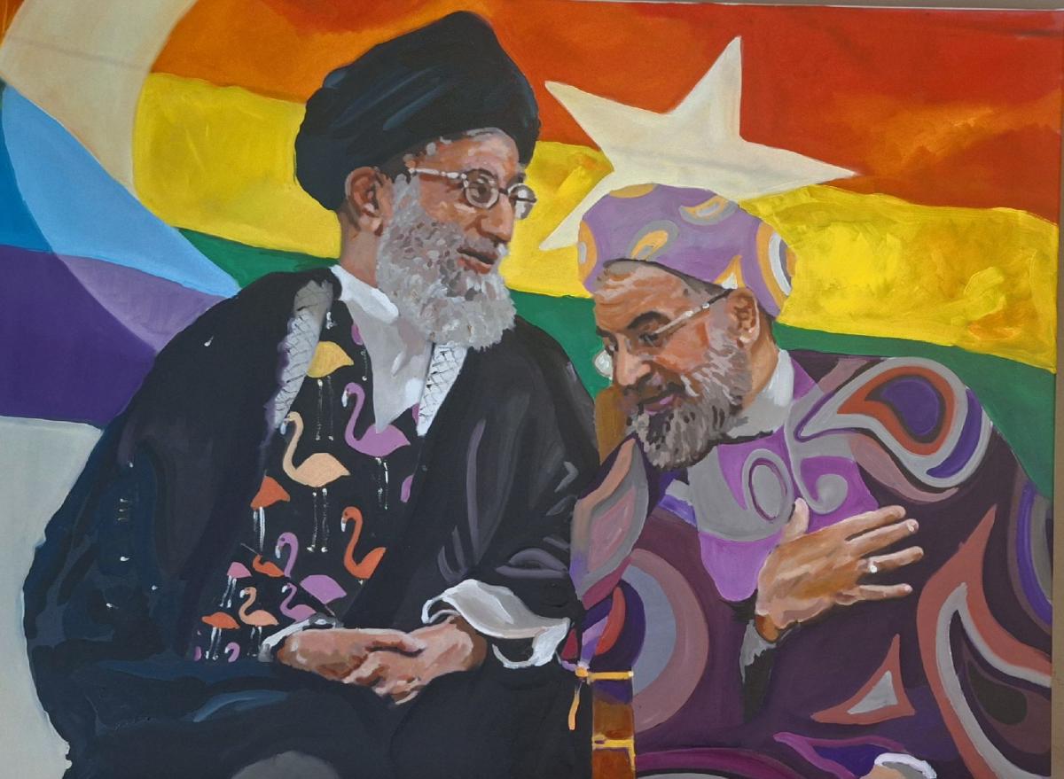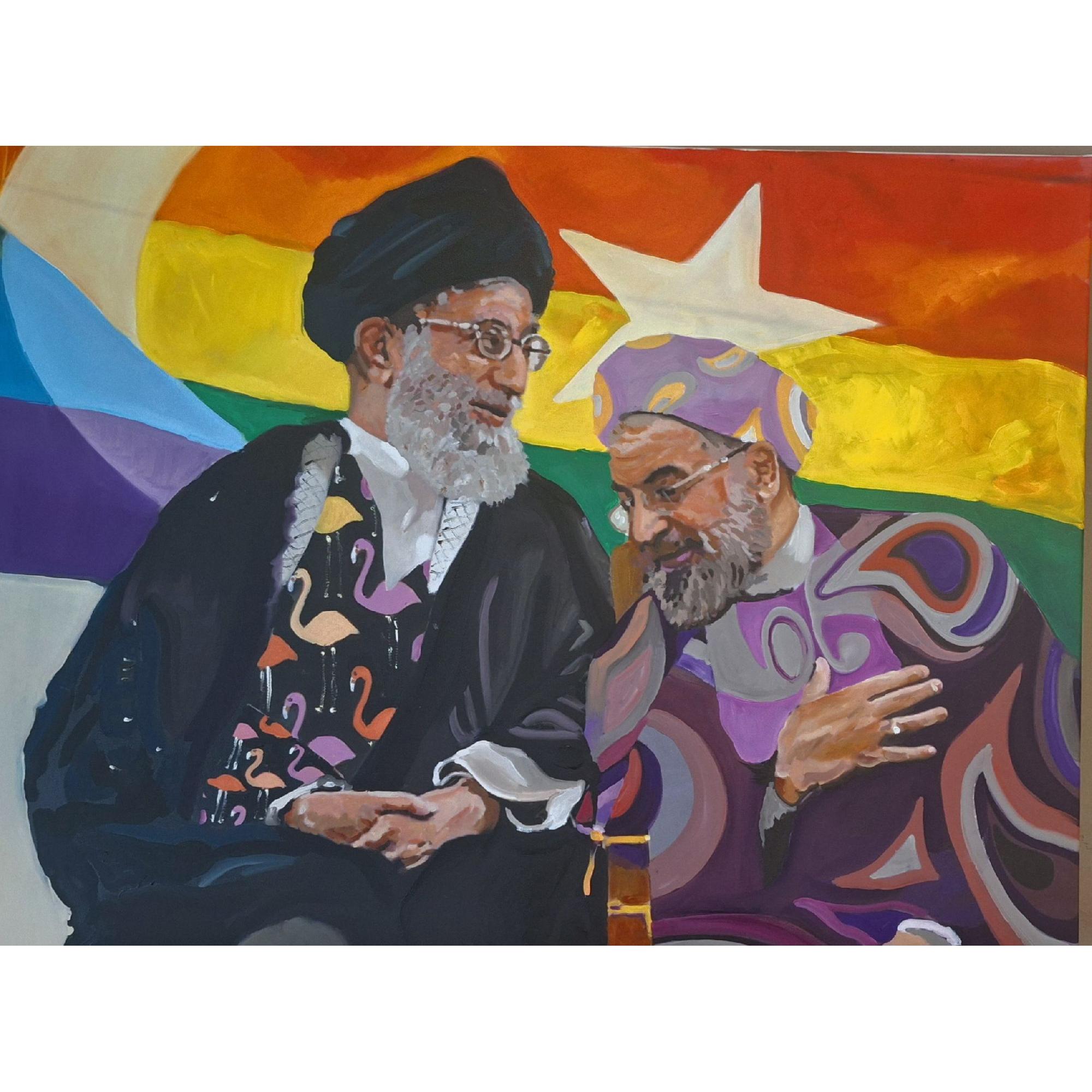 Quest’opera irriverente e satirica mette in scena due leader religiosi iraniani in un contesto completamente ribaltato rispetto all’iconografia ufficiale. Vestiti con abiti sgargianti, dai motivi pop e camp, immersi in una tavolozza psichedelica, i protagonisti sono rappresentati in atteggiamento complice, seduti davanti a una bandiera arcobaleno che unisce i colori LGBTQ+ a elementi della progress pride flag. È un gesto artistico volutamente iconoclasta, che scardina simboli del potere teocratico per metterli a confronto con i valori dell'inclusività e della libertà d’espressione.