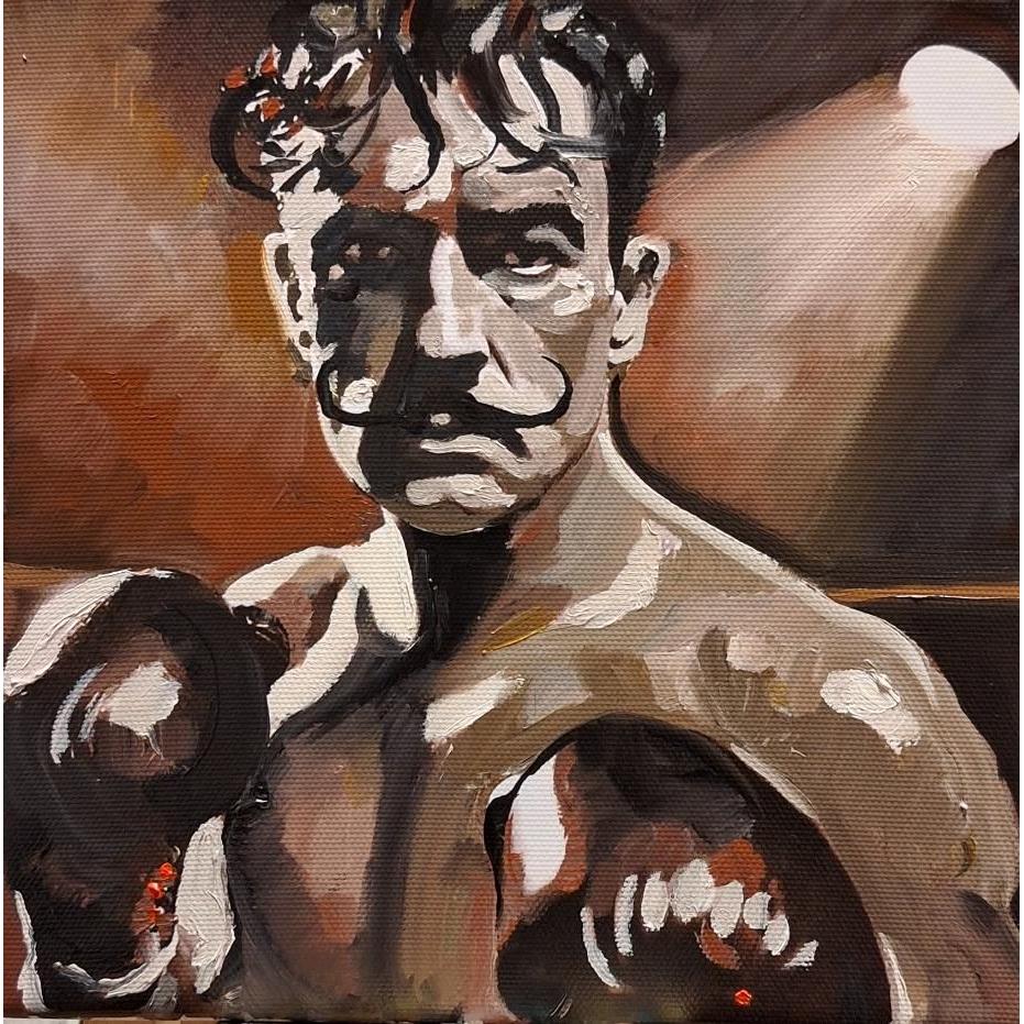 Il volto, illuminato da un fascio drammatico di luce, riprende i tratti classici del boxeur anni ’30, ma l’inconfondibile baffo alla Dalì spezza ogni possibile lettura realistica, trasformando la scena da ring in un palcoscenico dell’assurdo. Lo sguardo è magnetico, penetrante e orgoglioso, sospeso tra determinazione sportiva e follia creativa.