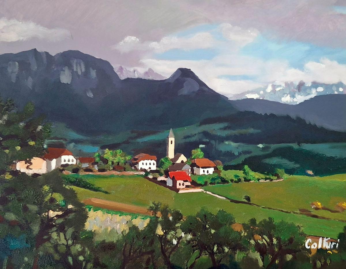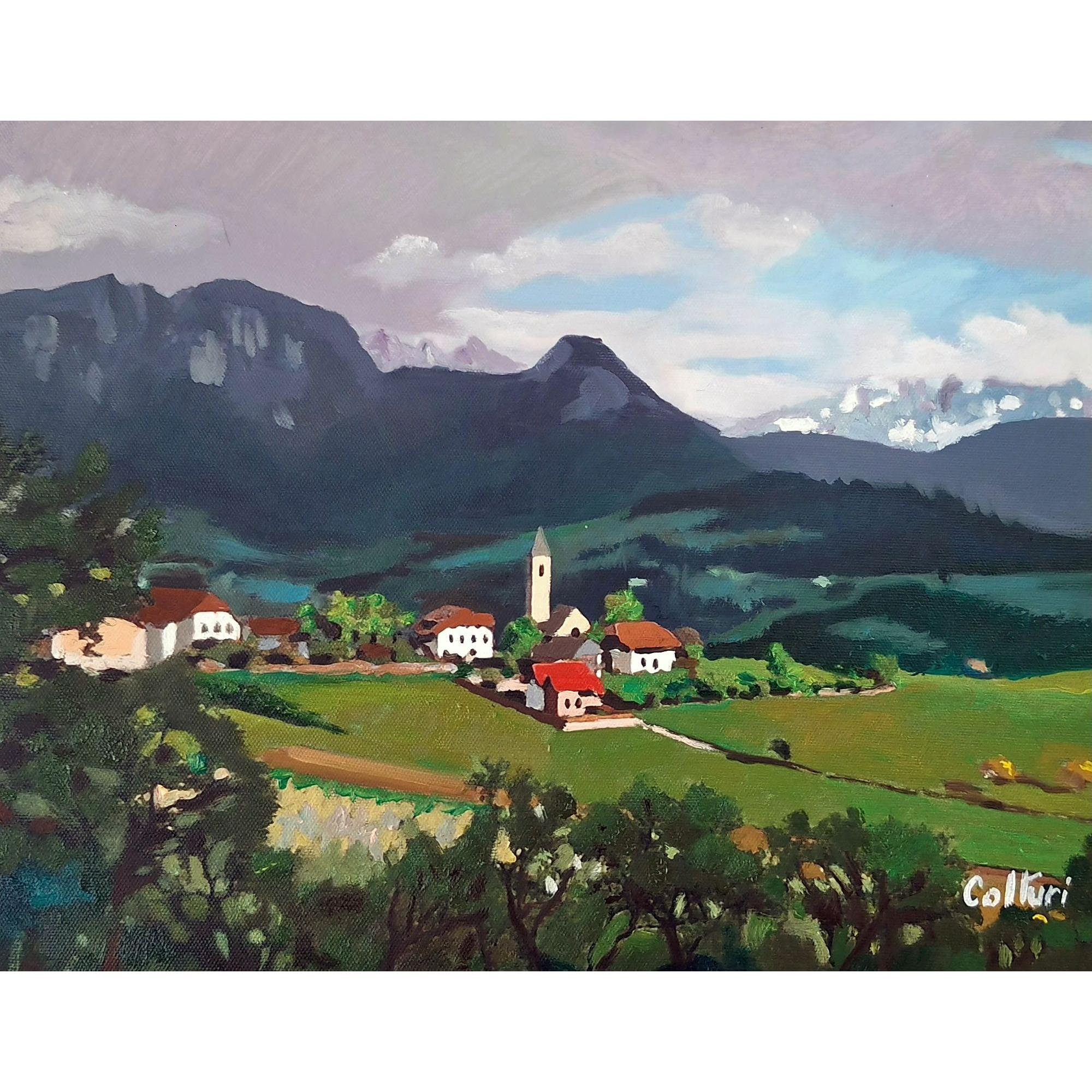 Questo quadro a olio raffigura un pittoresco paesaggio dell’Alto Adige, con un piccolo borgo alpino immerso nella natura. In primo piano si estendono prati verdi punteggiati da alberi, mentre al centro del dipinto spicca un campanile slanciato circondato da case dai tetti rossi e bianchi. Sullo sfondo, maestose montagne scure creano un netto contrasto con il cielo parzialmente nuvoloso, che lascia intravedere squarci di azzurro e cime innevate in lontananza. L’atmosfera trasmette serenità e il fascino tipico dei villaggi di montagna.