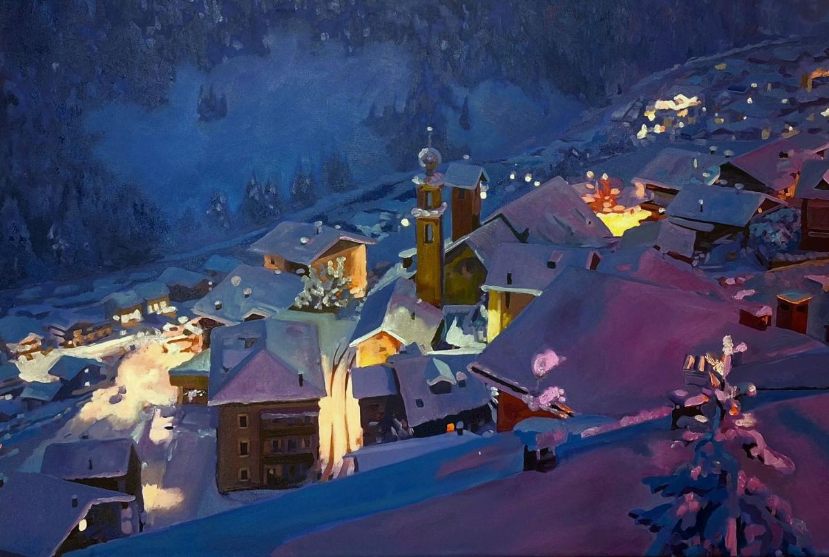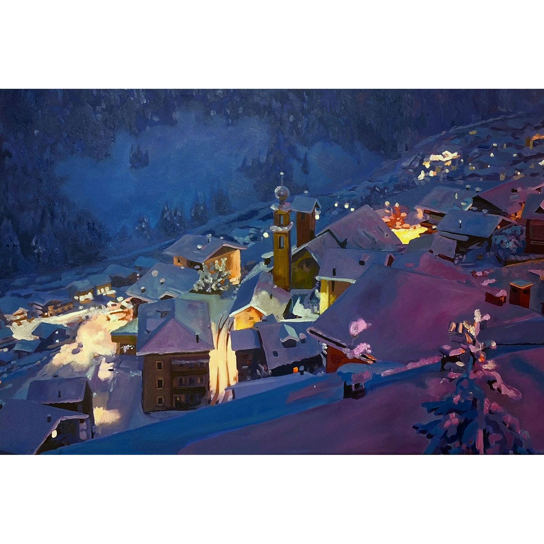 Il dipinto raffigura il borgo valtellinese di Madonna dei Monti in una suggestiva atmosfera invernale. Le case, coperte da un soffice manto di neve, si raccolgono attorno al campanile della chiesa illuminata, mentre le luci calde delle abitazioni contrastano con le tonalità fredde del paesaggio notturno. L’opera trasmette un senso di intimità e quiete, evocando la magia serale di un piccolo paese alpino immerso nel silenzio della neve.