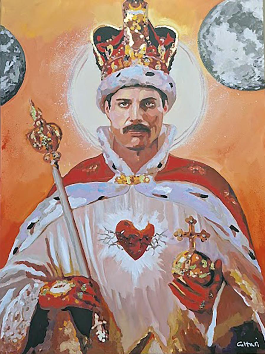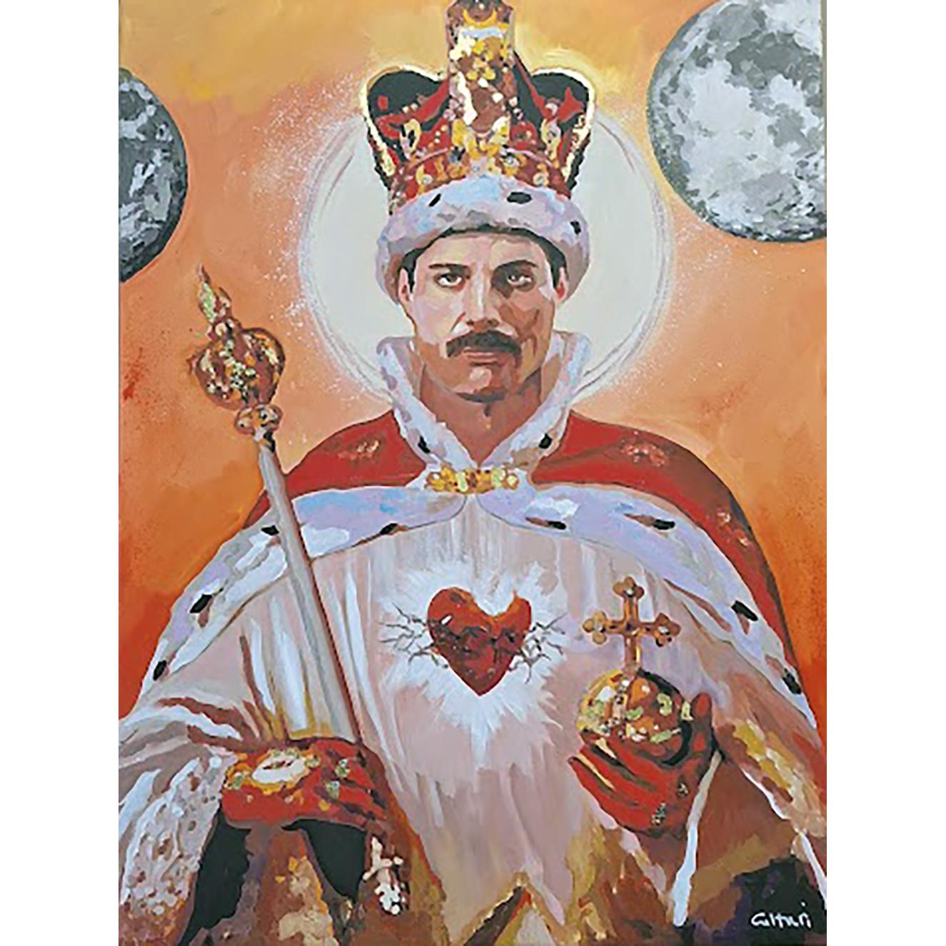 Il dipinto a olio raffigura Freddie Mercury in una potente reinterpretazione iconografica che fonde il sacro con il pop. L’artista lo ritrae come un sovrano carismatico, avvolto in un manto regale e incoronato di luce, simbolo del suo dominio assoluto sulla scena musicale e del suo spirito indomabile. Le tinte calde e dorate esaltano la sua aura divina, mentre il cuore fiammeggiante al centro richiama la passione e l’intensità che hanno reso unica la sua voce e la sua presenza. L’opera celebra Mercury come icona eterna, re della musica e dell’immaginazione.