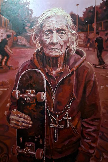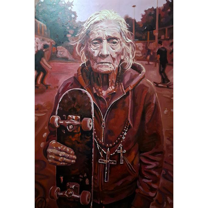 In quest’opera l’artista mette in scena una figura femminile anziana, emblema di una sacralità perduta e trasandata, al centro di un contesto giovanile che appare sfocato, distante, quasi inafferrabile. I rosari e le croci, ostentati con eccesso quasi grottesco, diventano simboli di un’identità spirituale disillusa ma ancora tenacemente esibita.