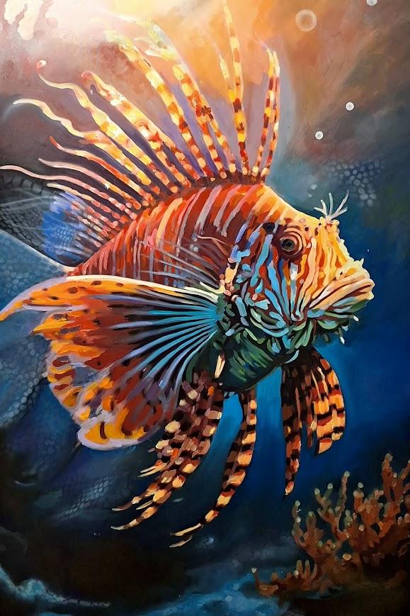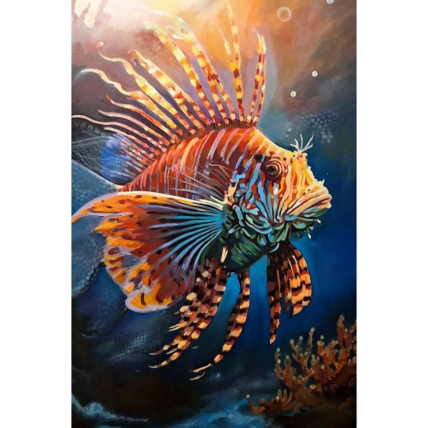 In questo dipinto a olio il linguaggio pittorico si fa più narrativo e drammatico, pur mantenendo una forte componente espressiva. Il soggetto, un pesce leone, è rappresentato con grande attenzione al dettaglio anatomico, ma reinterpretato attraverso una stilizzazione cromatica che ne amplifica il carattere fiero e quasi regale. Le pinne, aperte come un ventaglio, dominano la composizione e conferiscono all’opera un ritmo radiale che trasmette tensione e potenza. La luce, sapientemente modulata, scolpisce il corpo del pesce emergendo dal fondo marino scuro e profondo, creando un efficace gioco di chiaroscuri. I colori caldi e freddi dialogano in equilibrio, mentre la pennellata, più strutturata rispetto alla prima opera, rafforza il senso di presenza e autorità del soggetto. Il dipinto restituisce una visione intensa e quasi monumentale del mondo marino, trasformando la creatura in un’icona di forza e bellezza primordiale.