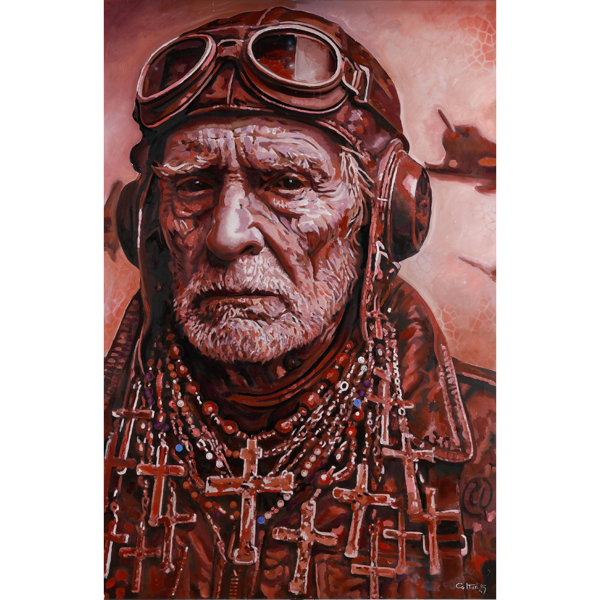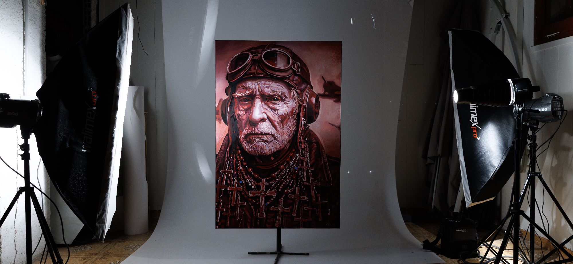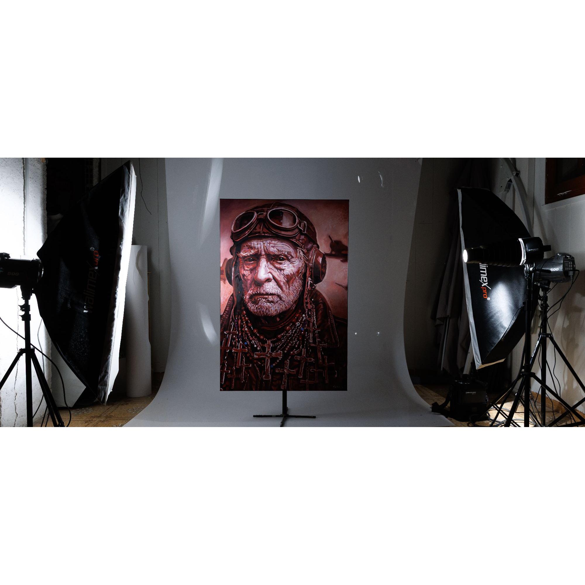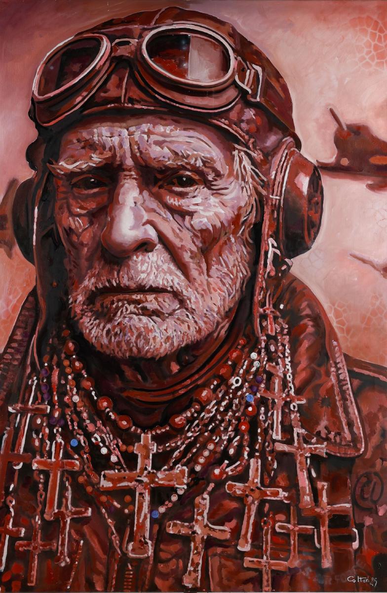 Il dipinto raffigura un anziano aviatore, figura sospesa tra memoria storica e disillusione contemporanea. Il volto scavato, reso con una pittura densa e materica, restituisce uno sguardo lucido e sopravvissuto, privo di eroismo. L’accumulo ossessivo di croci e rosari trasforma la fede in un peso più che in una salvezza. Tecnologia, guerra e religione convivono senza offrire redenzione, lasciando l’uomo solo di fronte al fallimento delle grandi promesse.