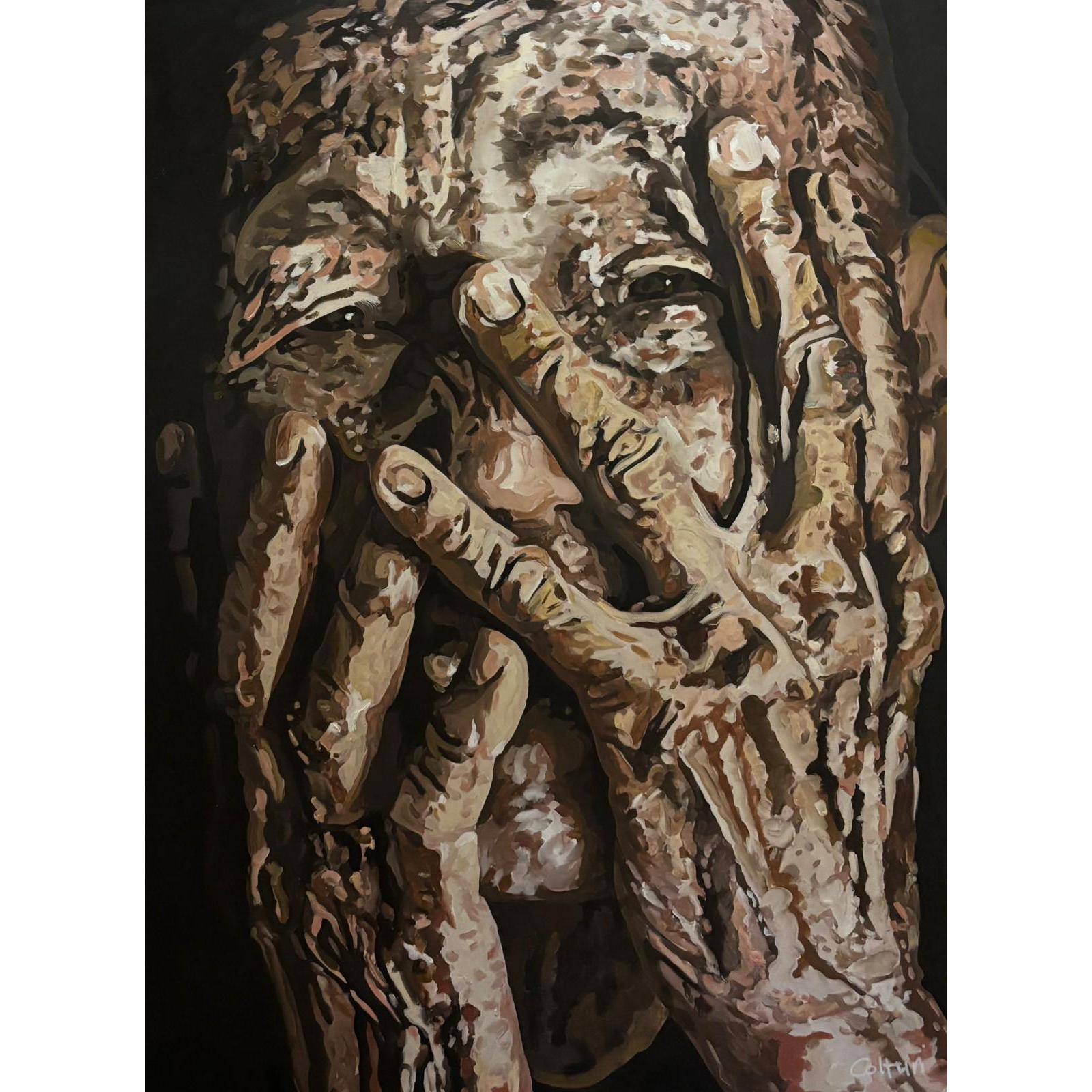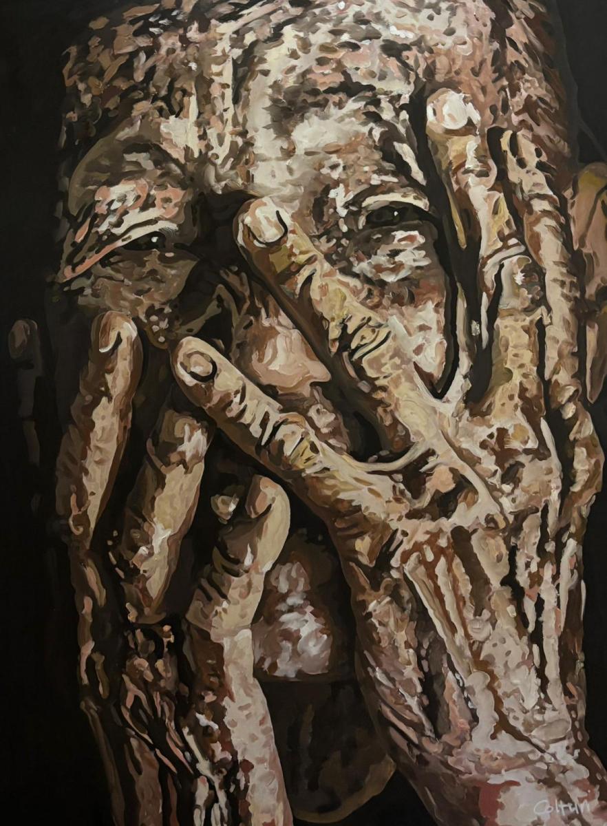 L’opera indaga il tema dell’identità attraverso una figura che si sottrae allo sguardo, schermandosi il volto con le proprie mani. La materia pittorica, densa e frammentata, costruisce una pelle segnata dal tempo, dove luci e ombre si insinuano come tracce di memoria. Il gesto non è difensivo ma introspettivo: un atto di sospensione tra rivelazione e occultamento. Il fondo scuro isola il soggetto, amplificando una tensione emotiva che trasforma il ritratto in una riflessione silenziosa sulla fragilità e sulla resistenza dell’essere.