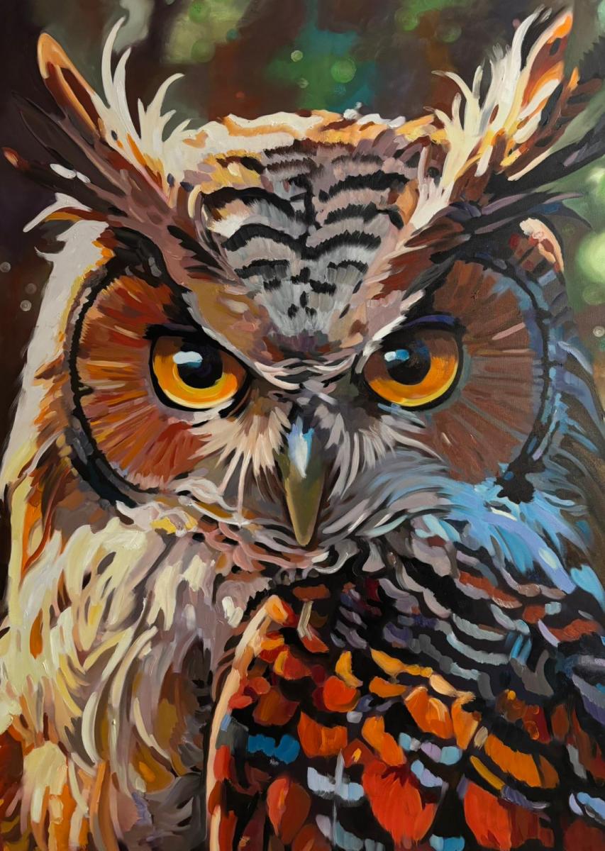 Il gufo è raffigurato frontalmente, con uno sguardo diretto e immobile che domina la composizione. La pennellata energica e stratificata costruisce una materia vibrante, dove il colore non descrive ma interpreta, trasformando il piumaggio in un campo emotivo. Gli occhi, intensi e luminosi, diventano il fulcro simbolico dell’opera: non osservano, ma vigilano. Il fondo scuro e indefinito amplifica la tensione tra presenza e mistero, restituendo un’immagine sospesa tra istinto e consapevolezza, natura e archetipo. Il gufo emerge così come figura di conoscenza silenziosa e controllo interiore.
