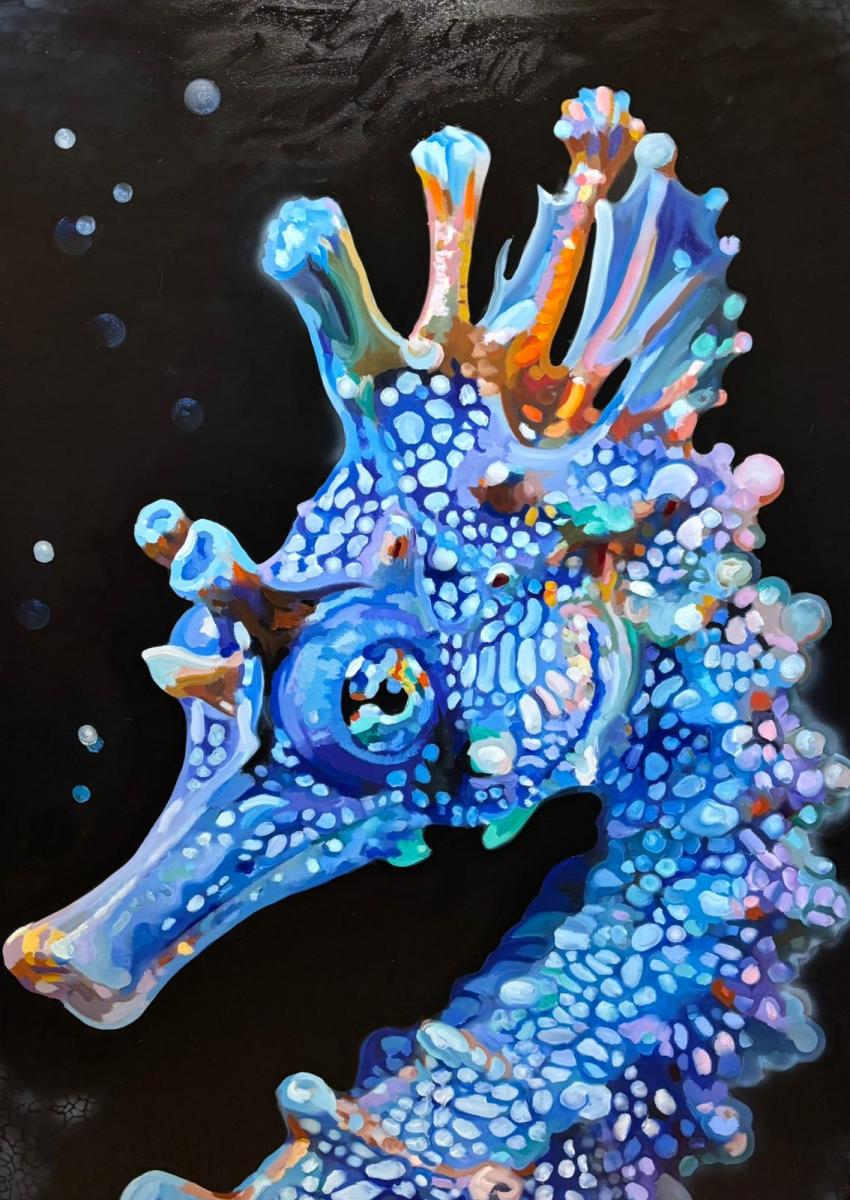 La figura emerge dal fondo nero come un’apparizione, sospesa tra realtà biologica e immaginazione. La materia pittorica, costruita per accumuli cromatici e pulsazioni luminose, trasforma il soggetto in una mappa sensibile, dove ogni punto di colore suggerisce movimento e vita latente. L’azzurro dominante rimanda a una dimensione acquatica e profonda, mentre la composizione isola la creatura in uno spazio senza coordinate, accentuandone il carattere enigmatico. Non è un ritratto naturalistico, ma una presenza simbolica: un frammento di natura che diventa metafora di alterità, silenzio e resistenza primordiale.