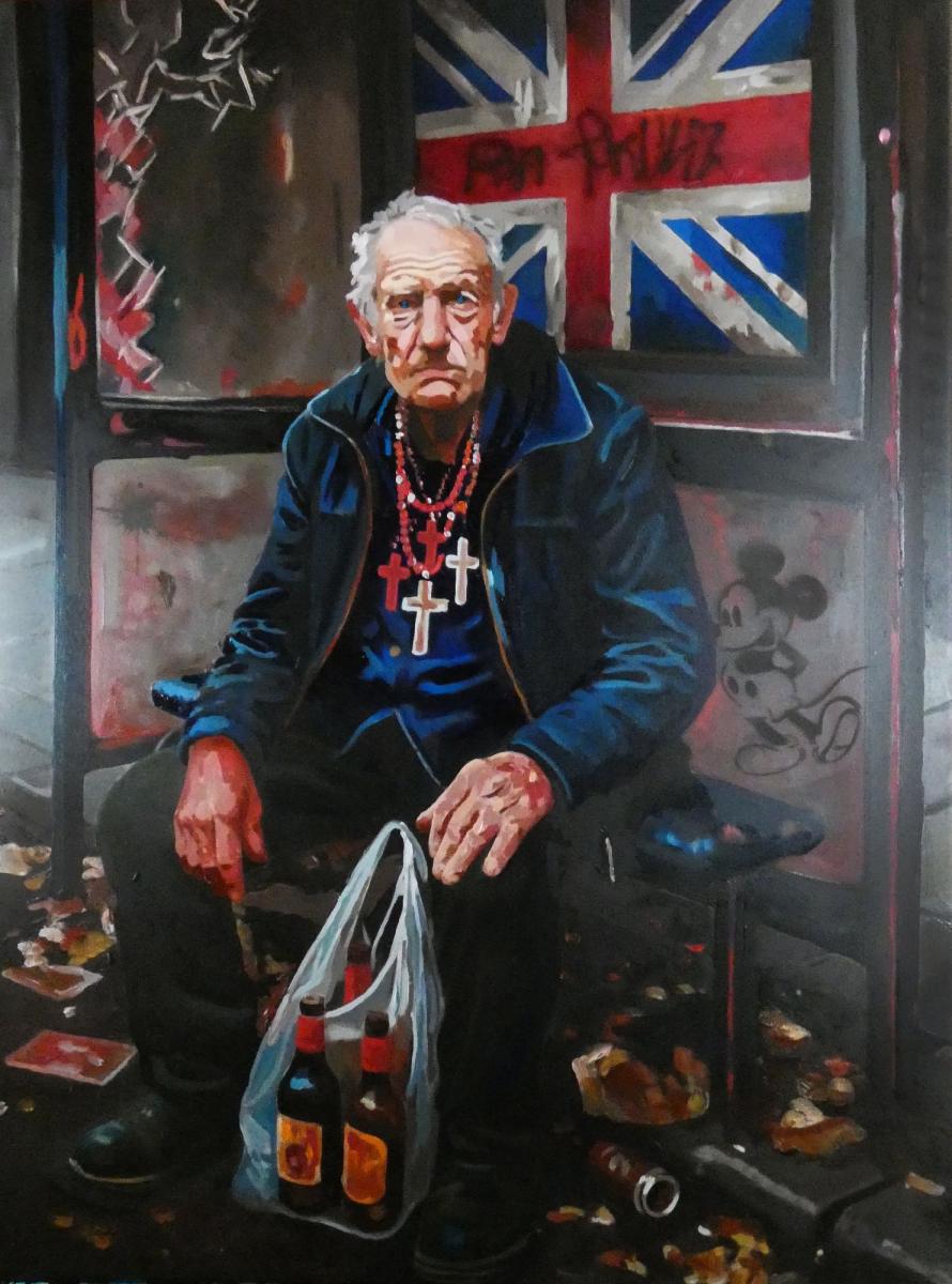 In questo ritratto il mondo decadente inglese si condensa in una scena di marginalità silenziosa. Un uomo anziano siede davanti a un fondale che un tempo rappresentava potenza e appartenenza — la Union Jack — ora sporca, graffiata, quasi svuotata di significato.
