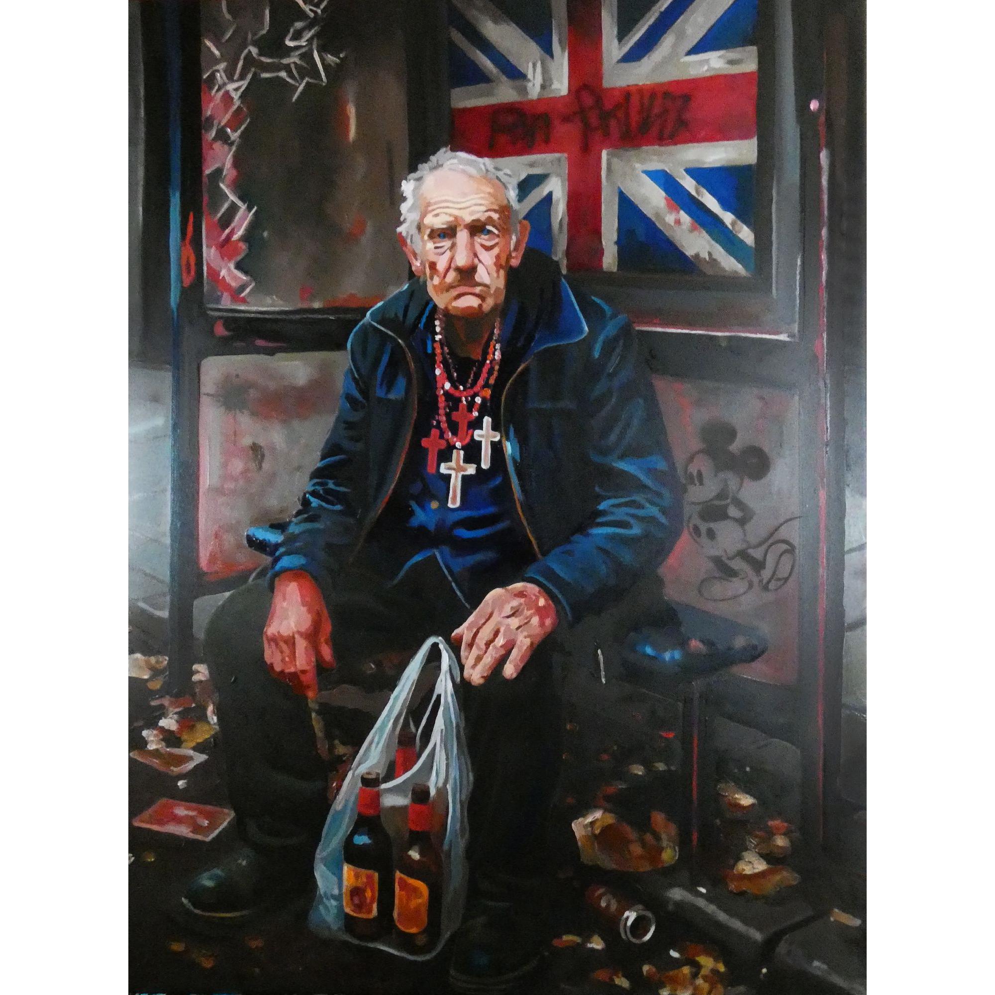 La figura, carica di croci al collo come reliquie private, diventa emblema di una fede che sembra più superstizione che salvezza. Le bottiglie nella borsa, i detriti a terra, il pavimento sporco raccontano un’Inghilterra periferica, lontana dall’immagine istituzionale e turistica, immersa in una malinconia urbana che sa di pub chiusi e sogni esauriti.