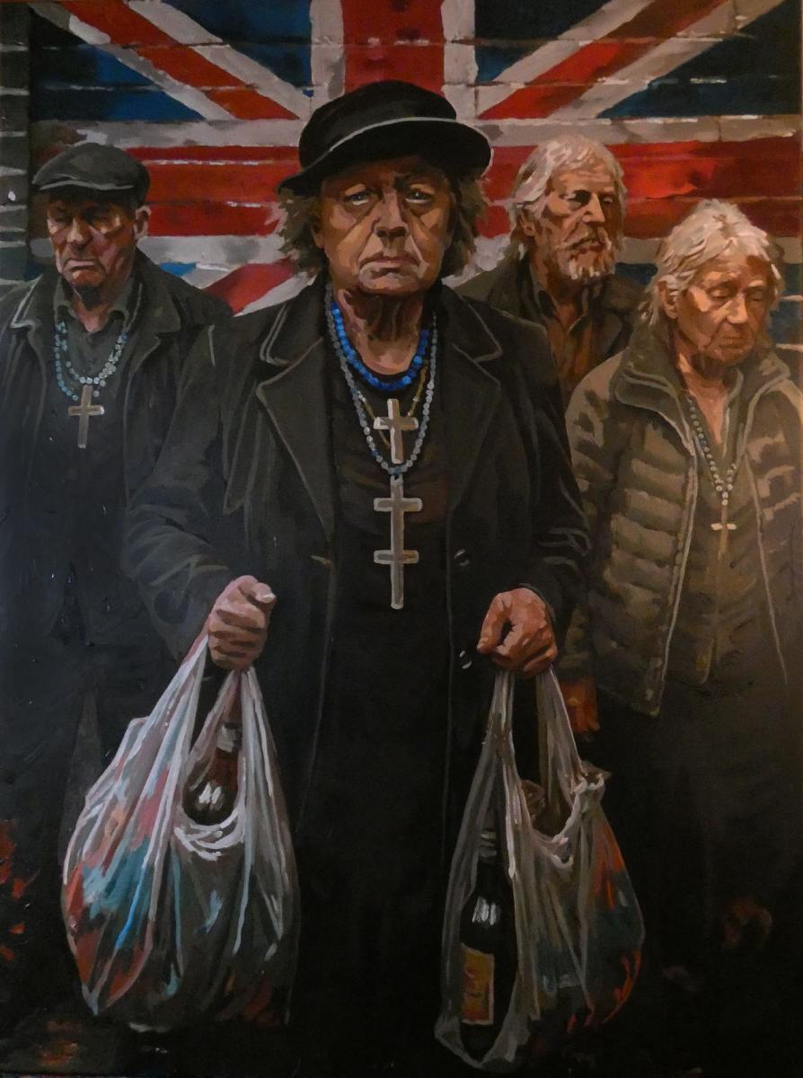 In The Last Loyalists Andrea Colturi mette in scena una comunità silenziosa, compatta ma svuotata, che avanza sotto una Union Jack ormai ridotta a fondale teatrale. I volti sono duri, segnati, impermeabili alla retorica patriottica che incombe alle loro spalle. Le croci, le bottiglie, i sacchetti della spesa diventano simboli di una quotidianità fragile, sospesa tra fede, sopravvivenza e disillusione.