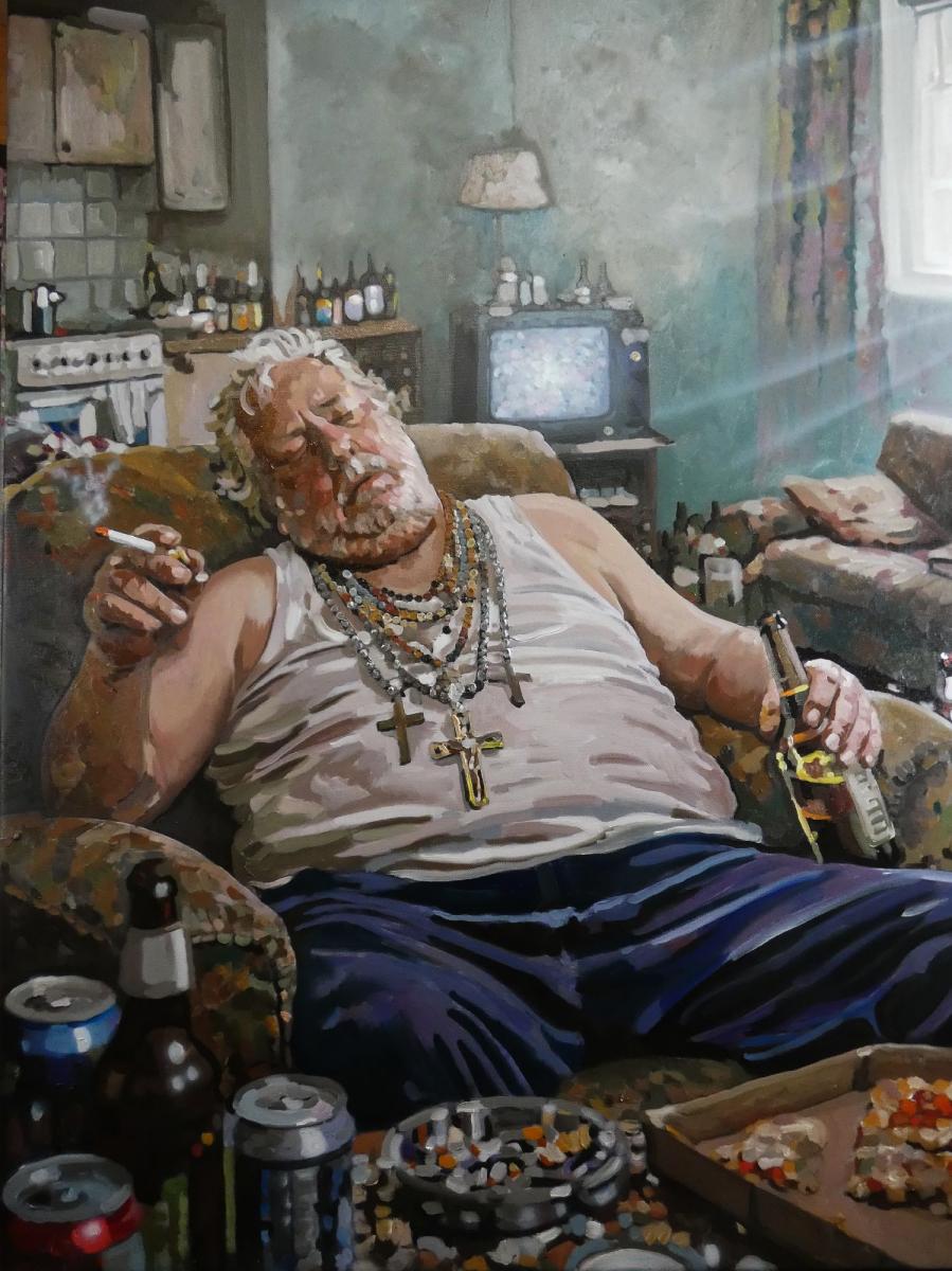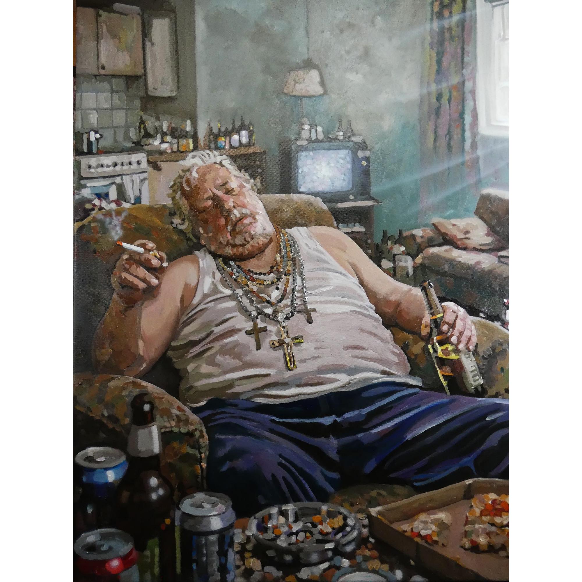 Le croci sul petto non evocano più fede, ma peso. Il gesto sospeso tra sigaretta e bottiglia racconta una sopravvivenza lenta, anestetizzata. La luce che filtra dalla finestra, quasi caravaggesca, introduce un’ironia silenziosa: un barlume di sacralità in un ambiente dove ogni simbolo è ormai svuotato.