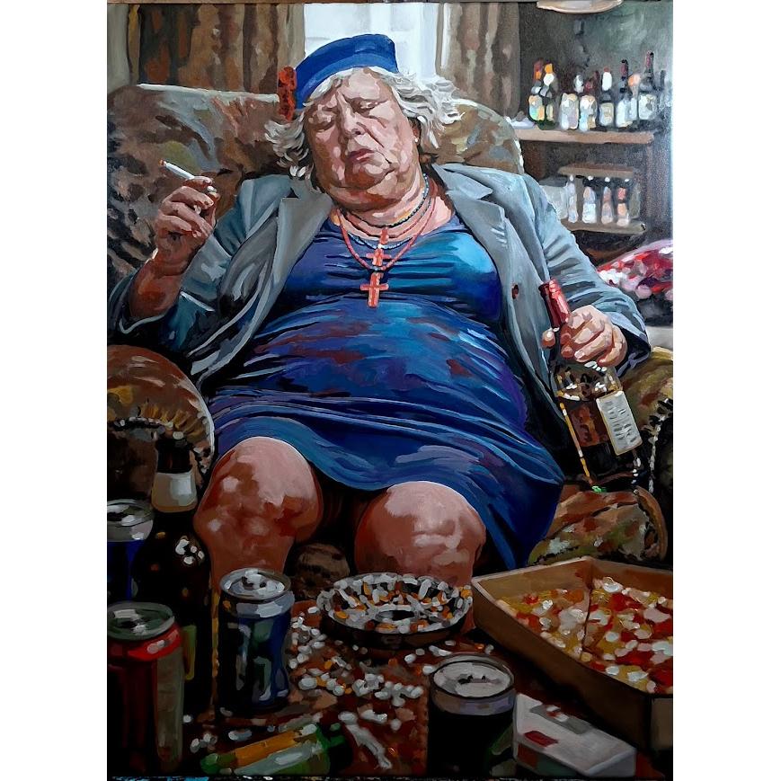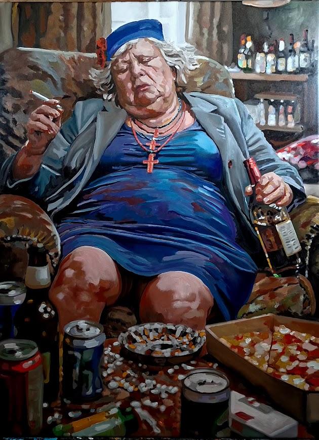 In questa opera scelgo di entrare nello spazio più intimo del mio racconto sul declino: l’interno domestico. La figura femminile, abbandonata su una poltrona consunta, è immersa in un ambiente saturo di oggetti, bottiglie e tracce di quotidianità ripetuta. Il gesto sospeso tra sigaretta e alcol non è provocazione, ma racconto di una stanchezza esistenziale che si sedimenta nel tempo.