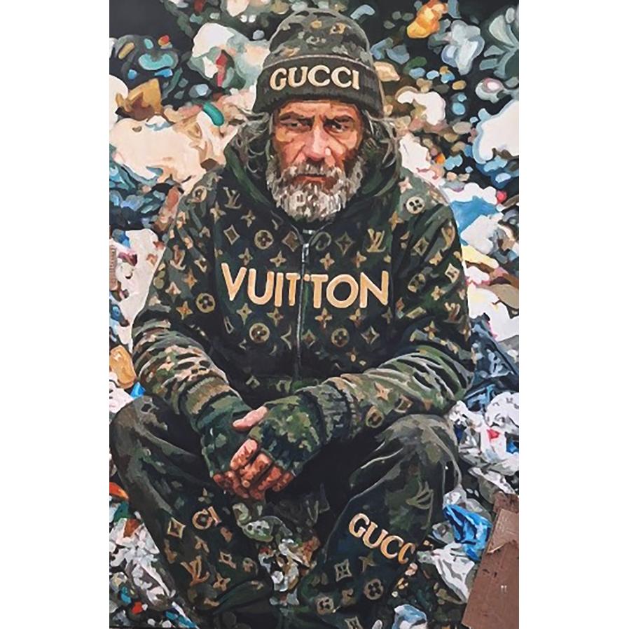 In quest’opera metto in scena una contraddizione visiva volutamente esplicita: una figura ai margini, seduta tra i rifiuti, indossa abiti segnati da marchi iconici del lusso. Il volto, scavato e stanco, guarda frontalmente lo spettatore senza mediazioni, mentre il corpo raccolto accentua una condizione di chiusura e resistenza.