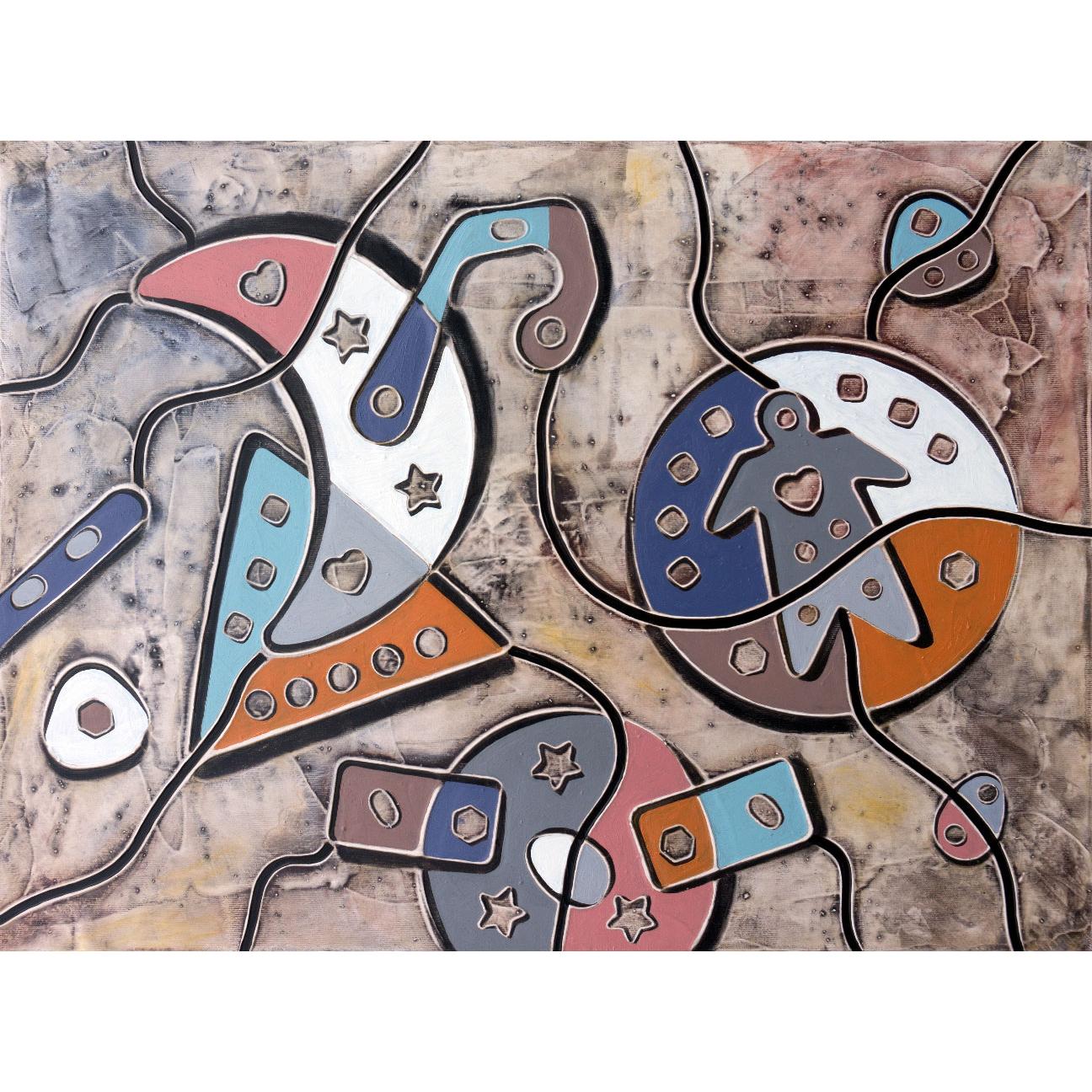 L'opera nasce con un bassorilievo realizzato col fondo gesso sulla tela, poi pigmentato con ossidi e dopo averla ricoperta con un sottilissimo strato di resina, l'opera è dipinta in alcune parti coi colori ad olio.