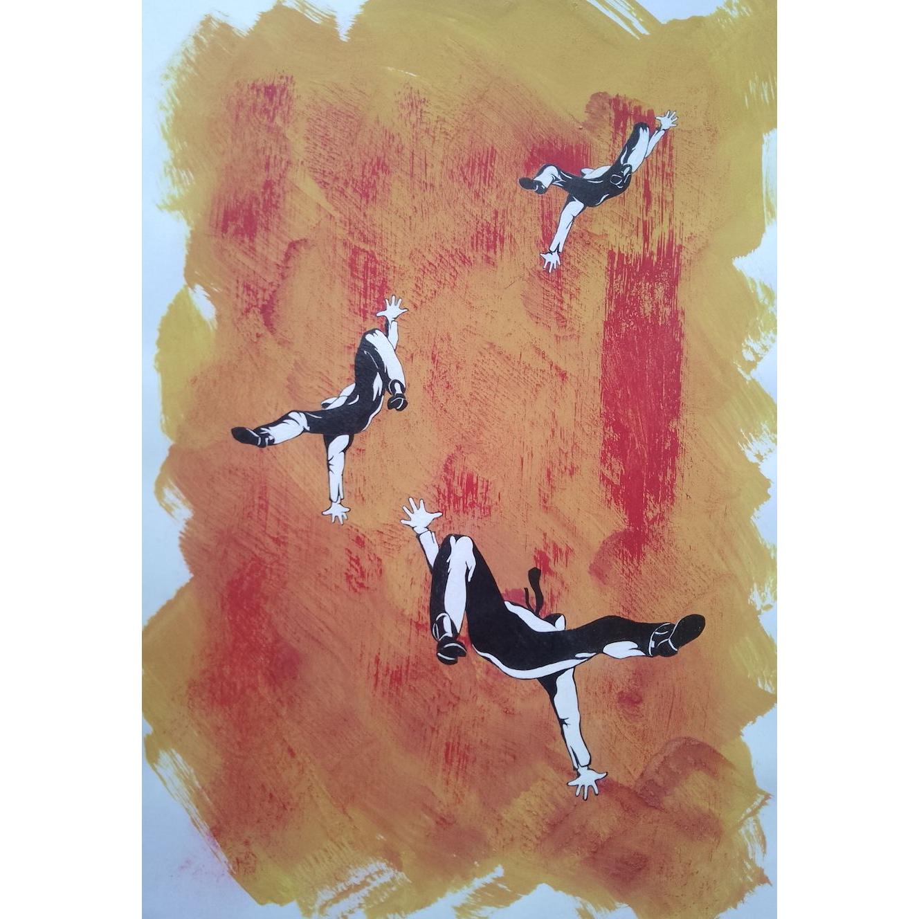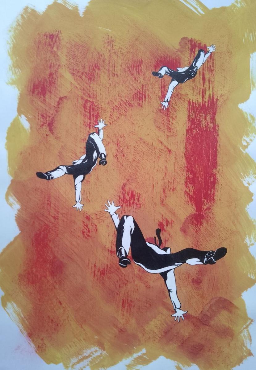 Su uno sfondo dinamico i corpi di tre uomini volteggiano in una caduta senza fine. Simbolico della caduta delle certezze del maschio e della attuale mancanza di una elaborazione alternativa dei rapporti tra i generi.