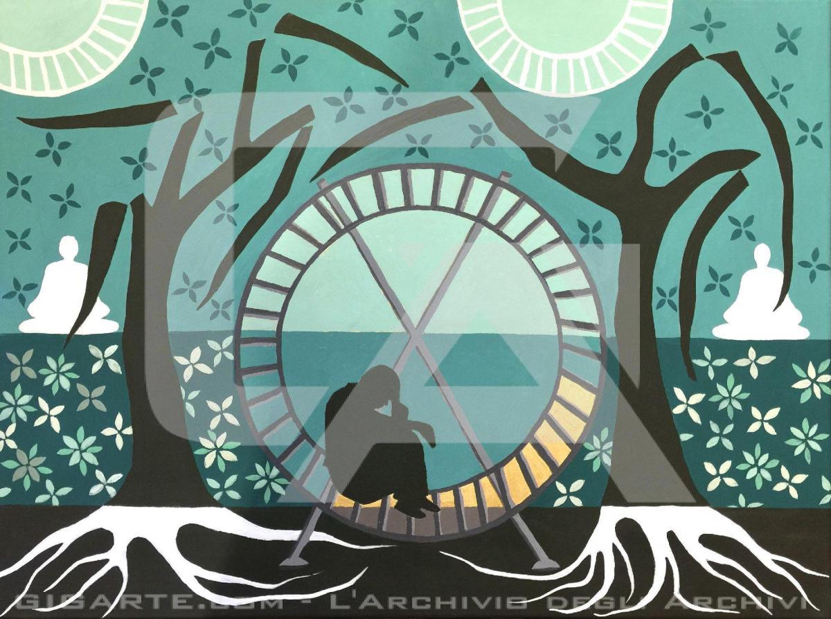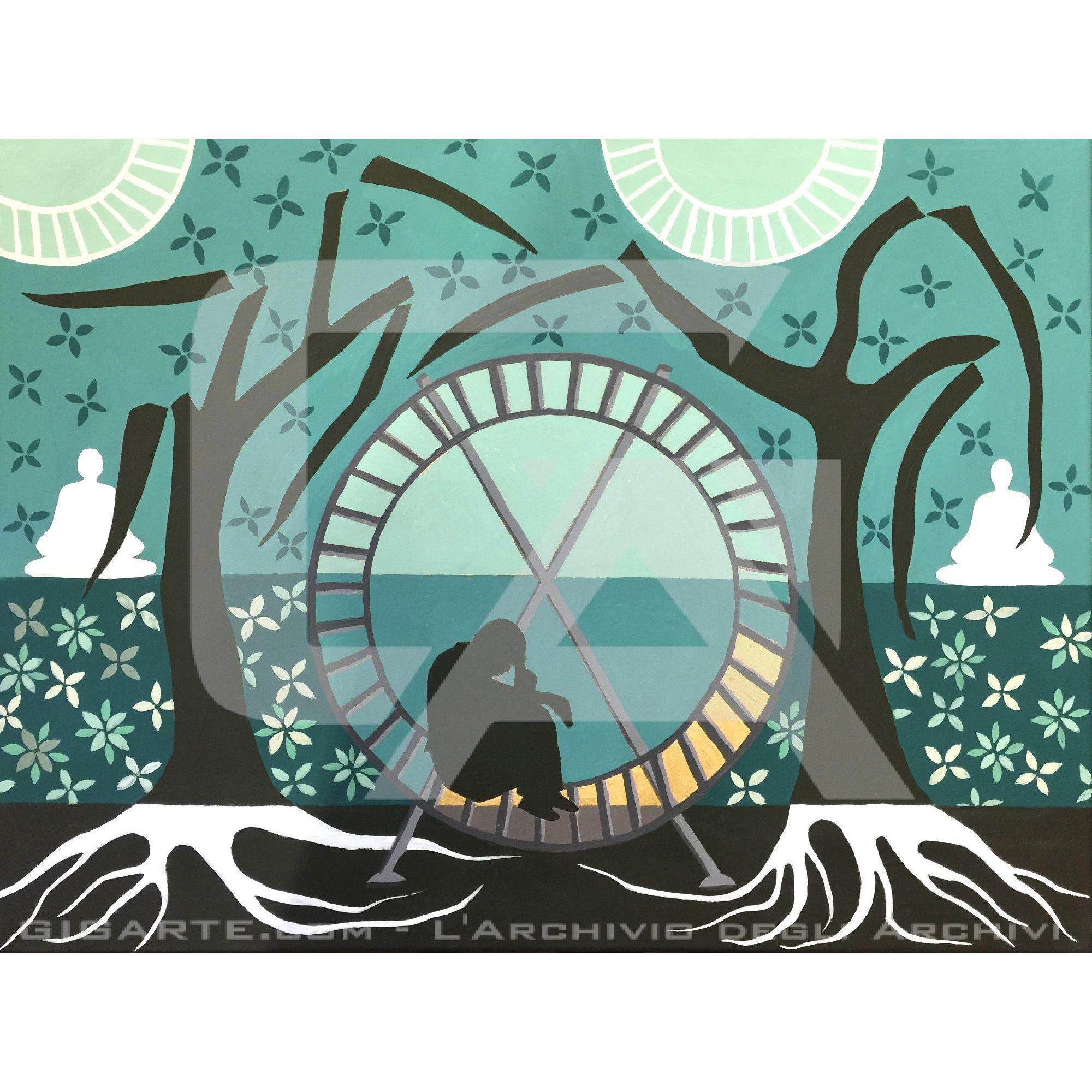 Nelle mie opere cerco di catturare la dualità tra immobilità e movimento. La scena raffigura una figura seduta su un oggetto circolare, circondata dalla natura e da elementi simbolici che suggeriscono sia il tempo che l'eternità. L'uso di colori audaci e contrastanti sottolinea la profondità emotiva e il simbolismo del momento. Questa immagine è pensata per stimolare sia riflessione che ispirazione nello spettatore, portando un'atmosfera di calma mistica e profonda connessione con la natura in ogni stanza.