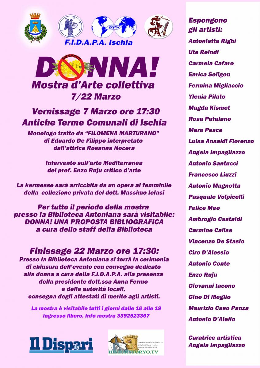 Questo progetto di natura artistico culturale non vuole solo essere un omaggio alla Donna nel mese a lei dedicato, bensì un vero e proprio modo di accendere i riflettori sul complesso ed eterogeneo universo femminile attraverso un viaggio nell’arte visiva. L’arte come forma di espressione e veicolo efficace per divulgare e porre l’accento su tematiche di interesse sociale e comunitario riguardanti anche il nostro territorio. Tale mostra si pone questo intento; il tema proposto agli artisti partecipanti è appunto la Donna, ogni artista realizzerà un opera dedicata, secondo la propria sensibilità e percorso stilistico. Vernissage 7 Marzo h 17:30 Antiche Terme di Ischia.