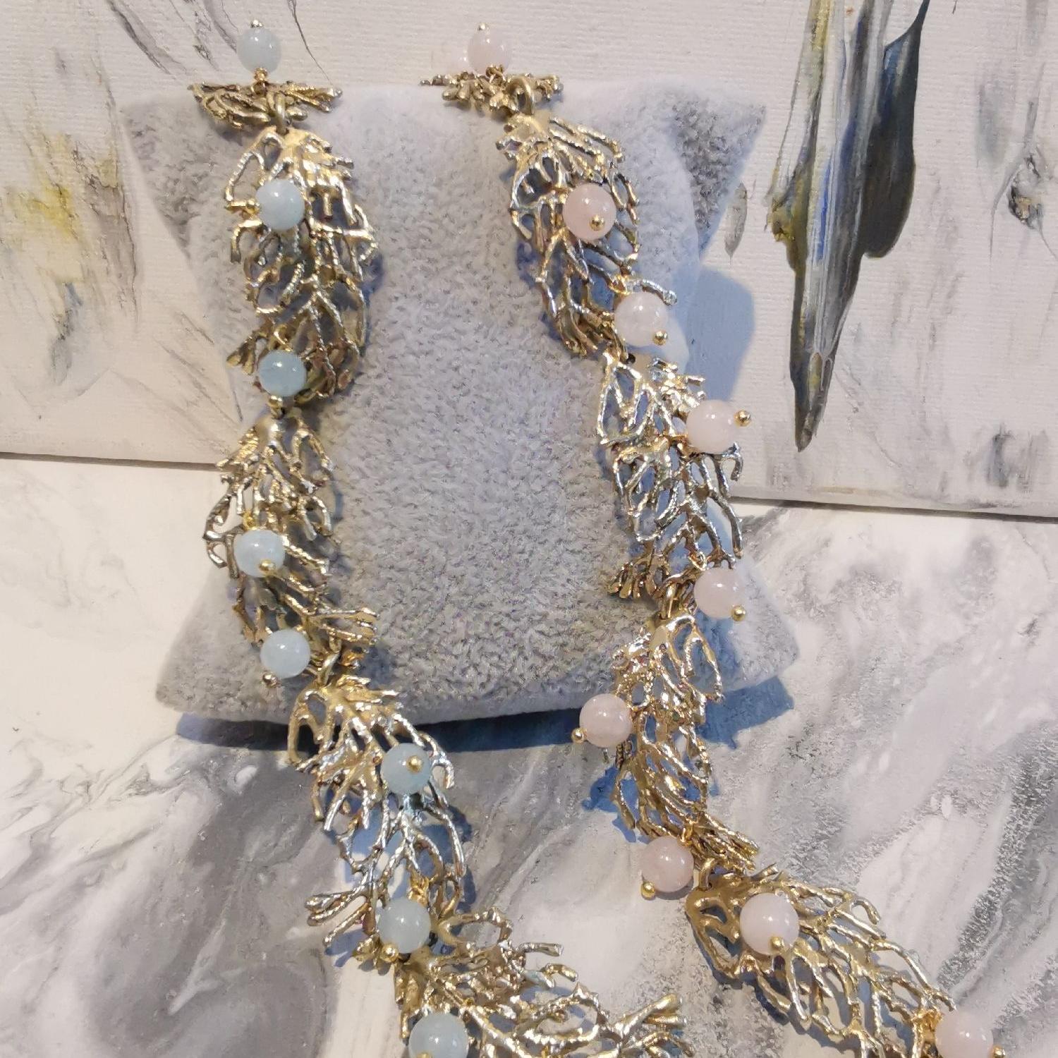 Bracciale in bronzo giallo con perle pesca, acque marine, agate indiane
