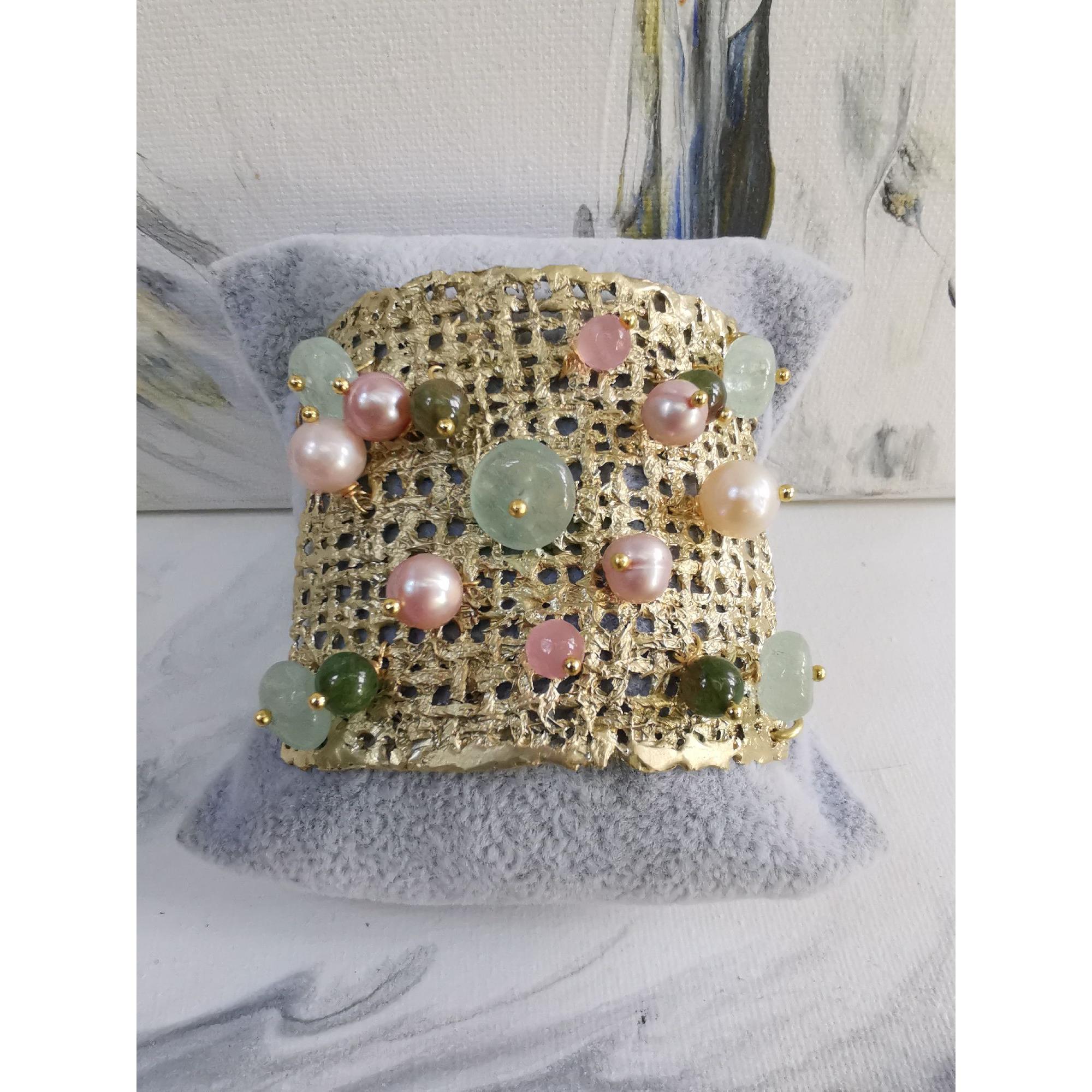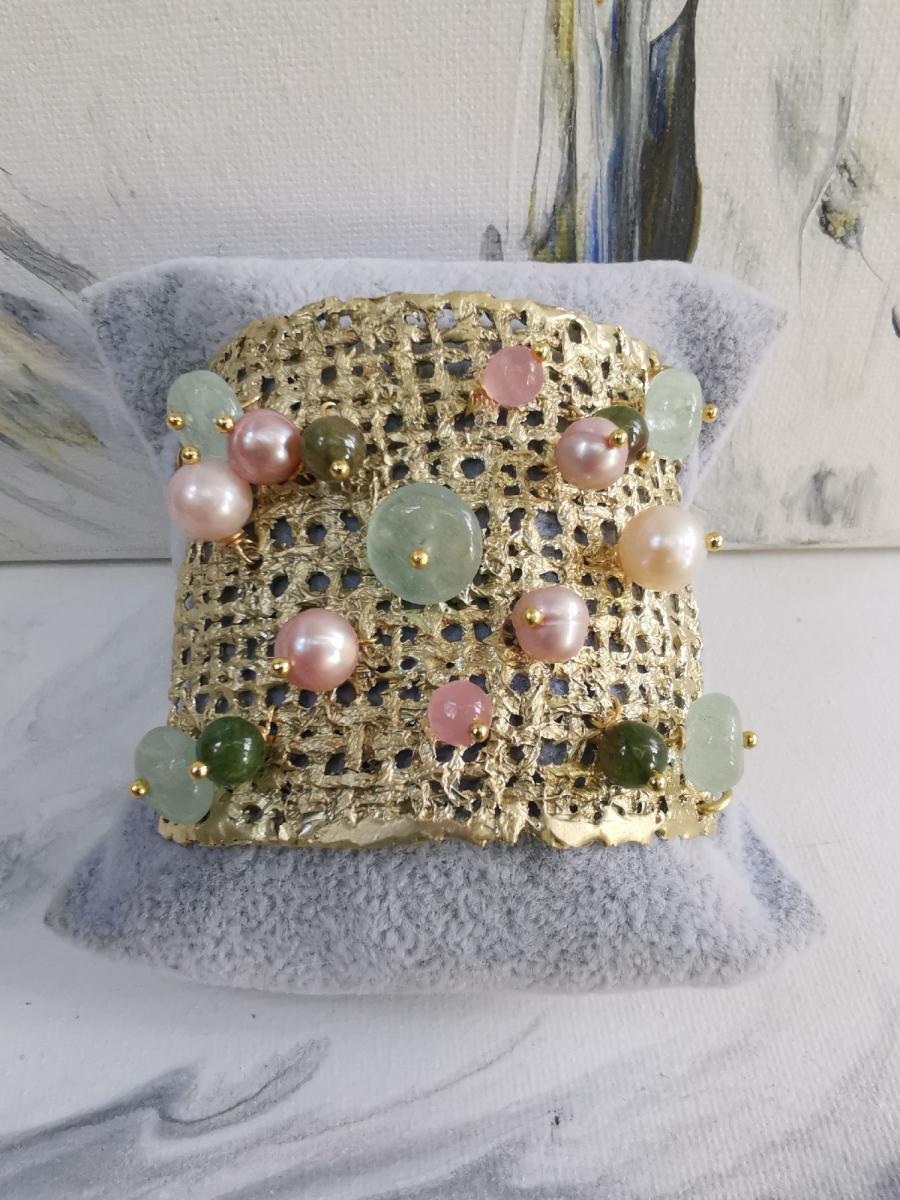Bracciale in bronzo giallo con perle pesca, acque marine, agate indiane