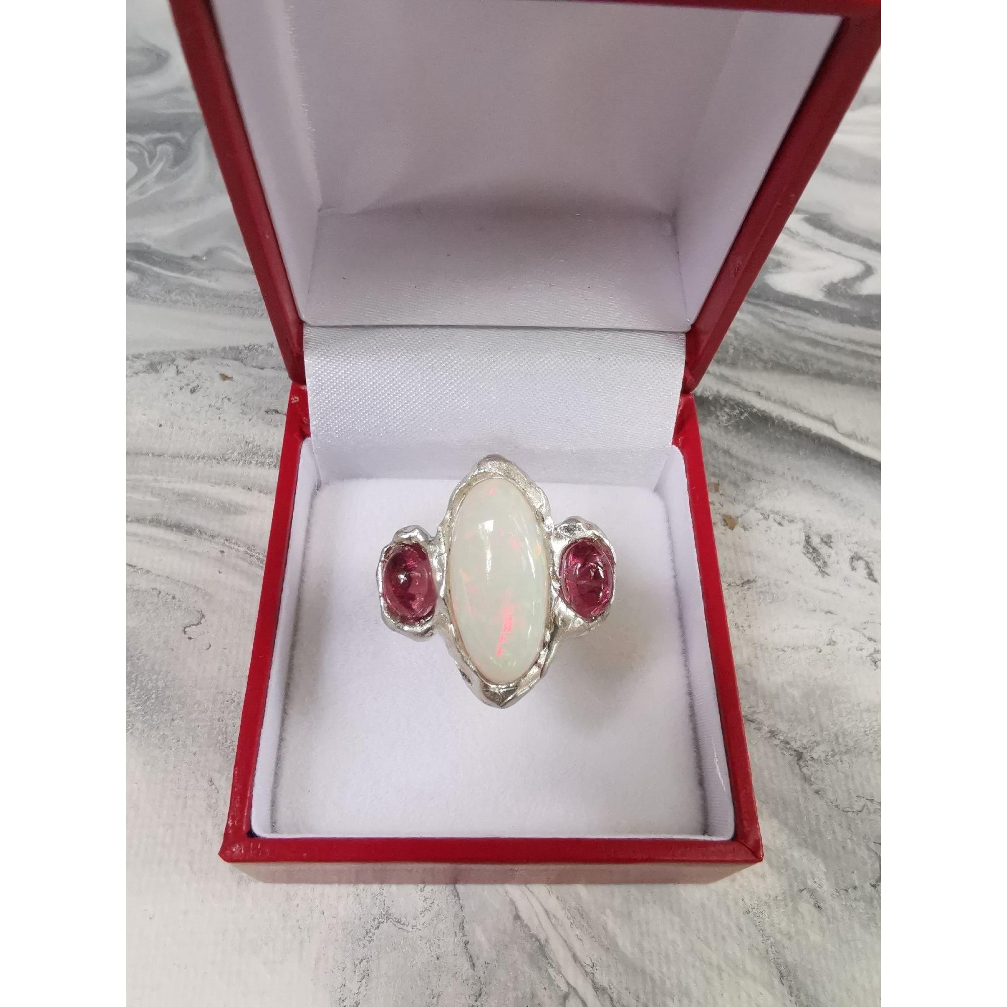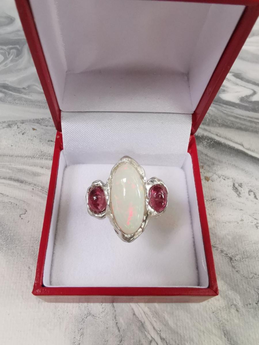 Anello in argento 925 regolabile con opale etiope AAA e rubini
