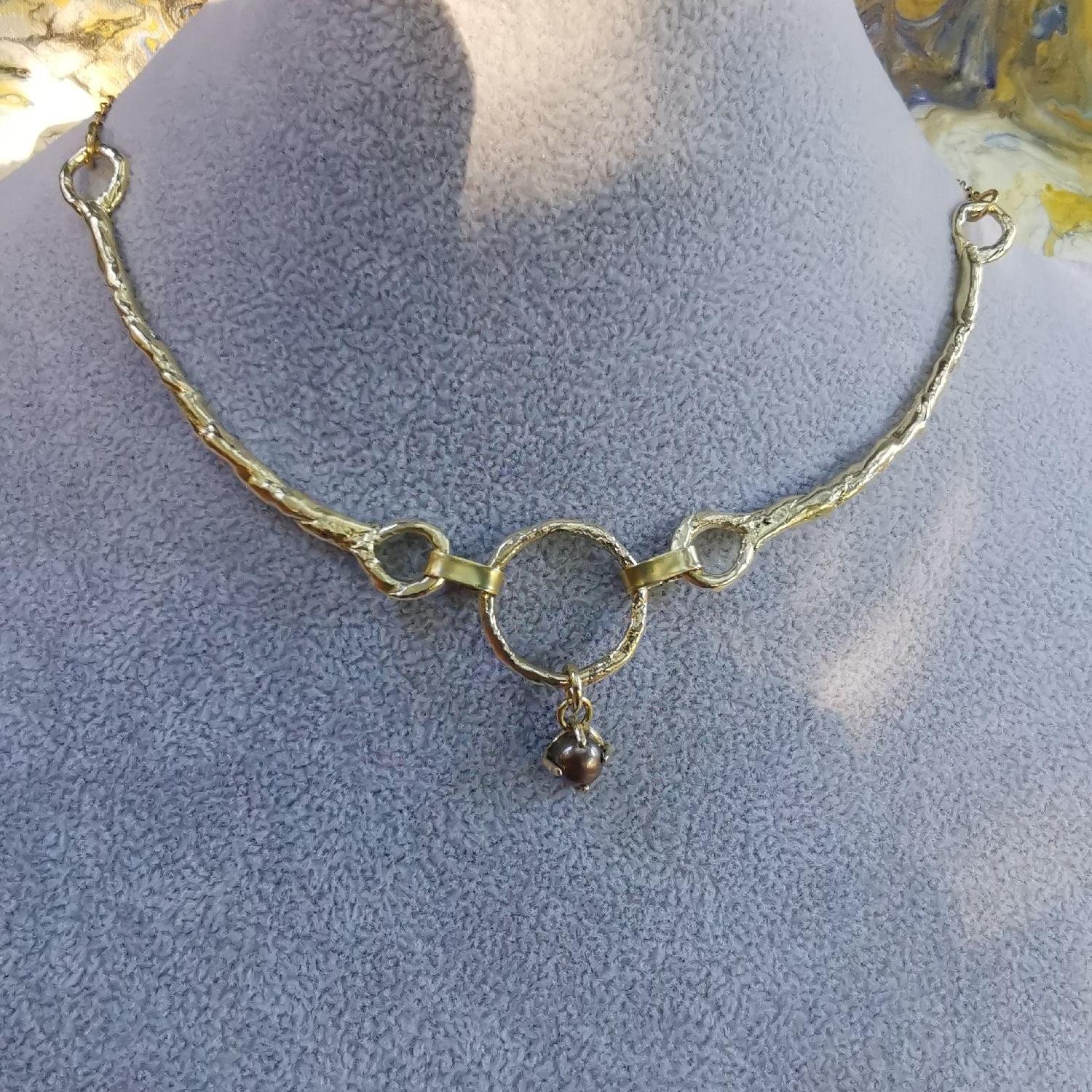 Collana cm 50 con perle barocche bianche ed elementi in bronzo giallo