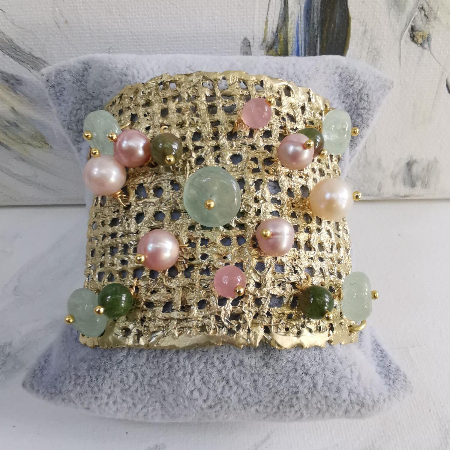 Bracciale in bronzo giallo con perle pesca, acque marine, agate indiane