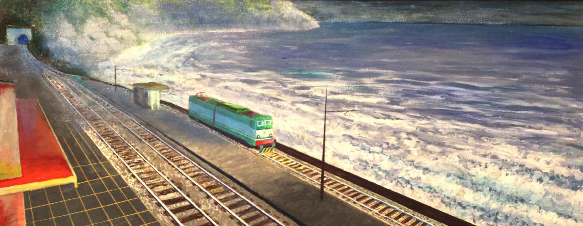 Un locomore solitario transita a Corniglia durante la mareggiata