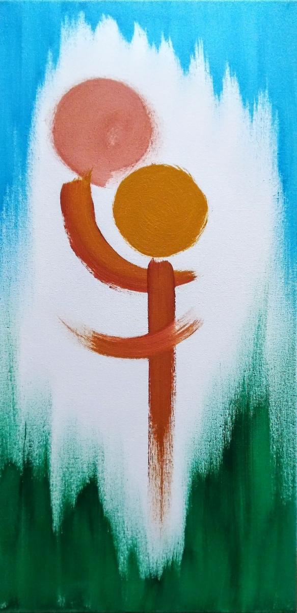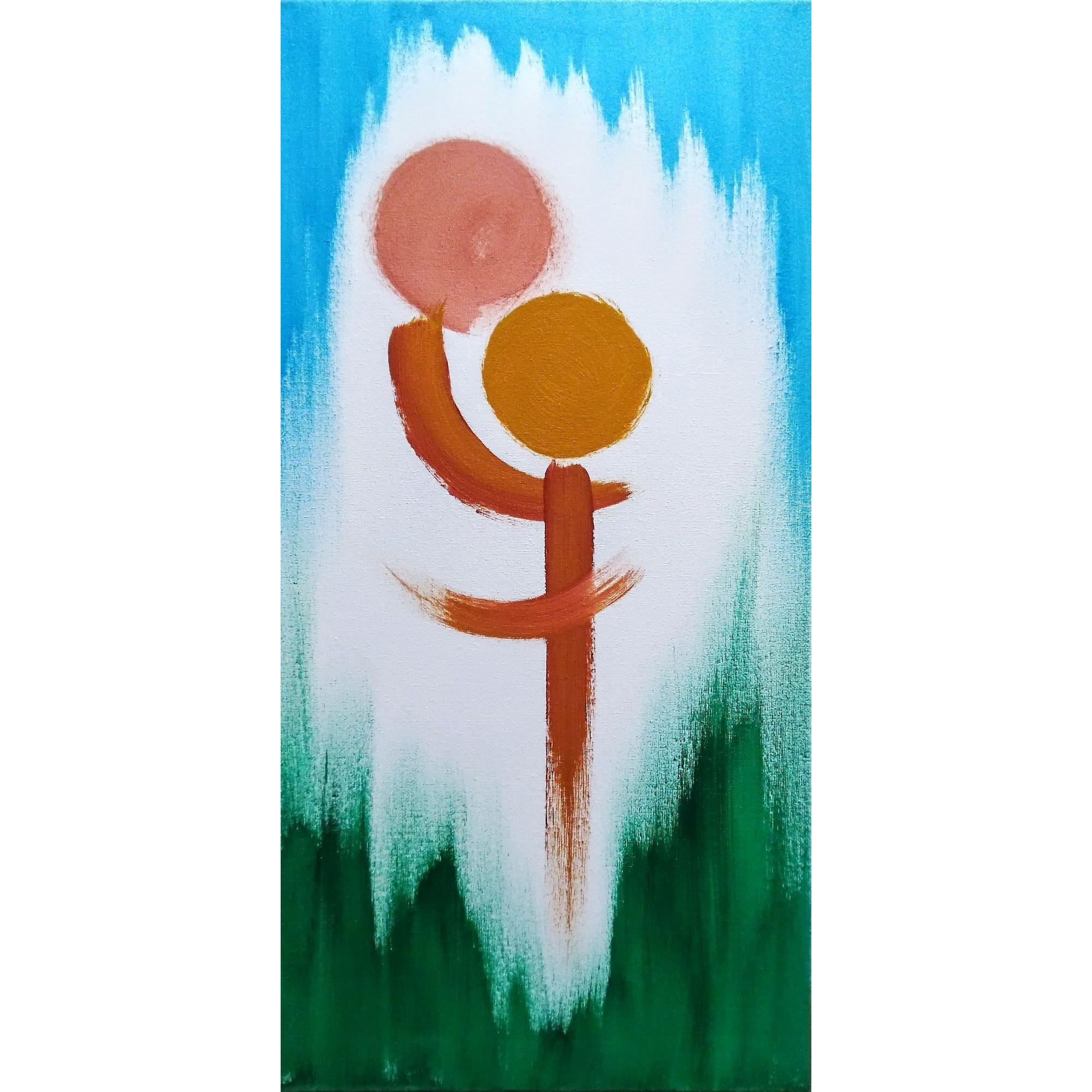 Quest'opera nasce dalla traduzione immediata di un gesto. Poche linee essenziali per rappresentare l'immensità emotiva che vive in un abbraccio. Alcune note cromatiche permettono di collocare l'immagine nello spazio, il verde che sale dal basso come erba e un azzurro cielo dall'alto racchiudono la complessa semplicità di un istinto atavico.