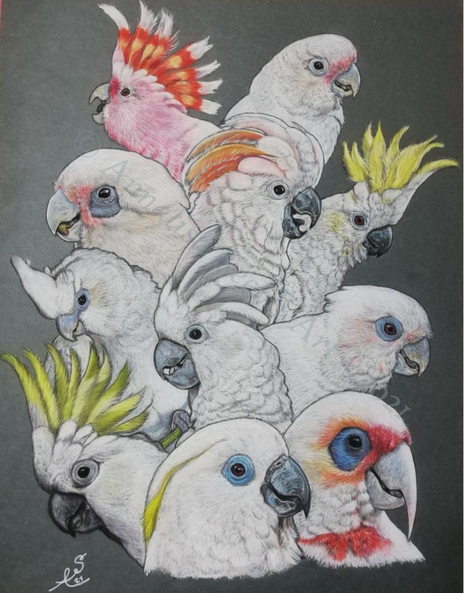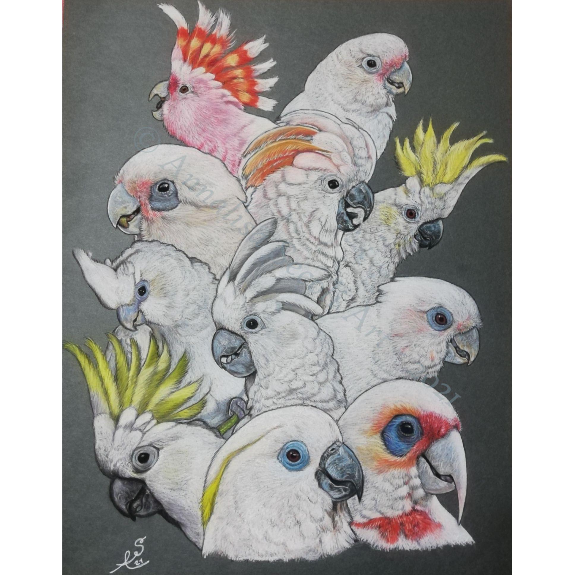 Illustrazione che raggruppa tutte le specie dei pappagalli cacatua, realizzato a pastelli secchi su foglio scuro. Stampe disponibili.