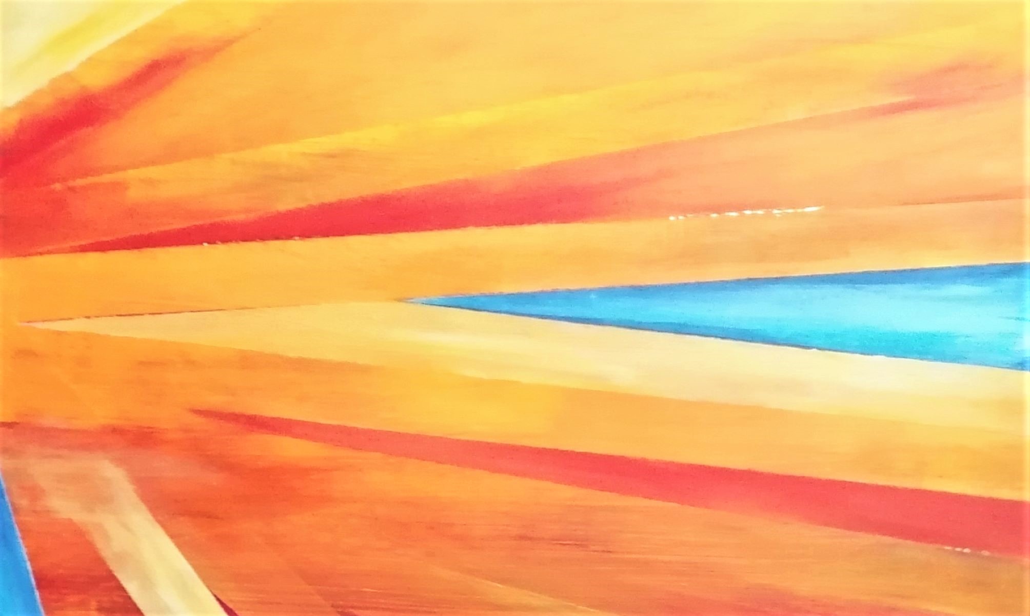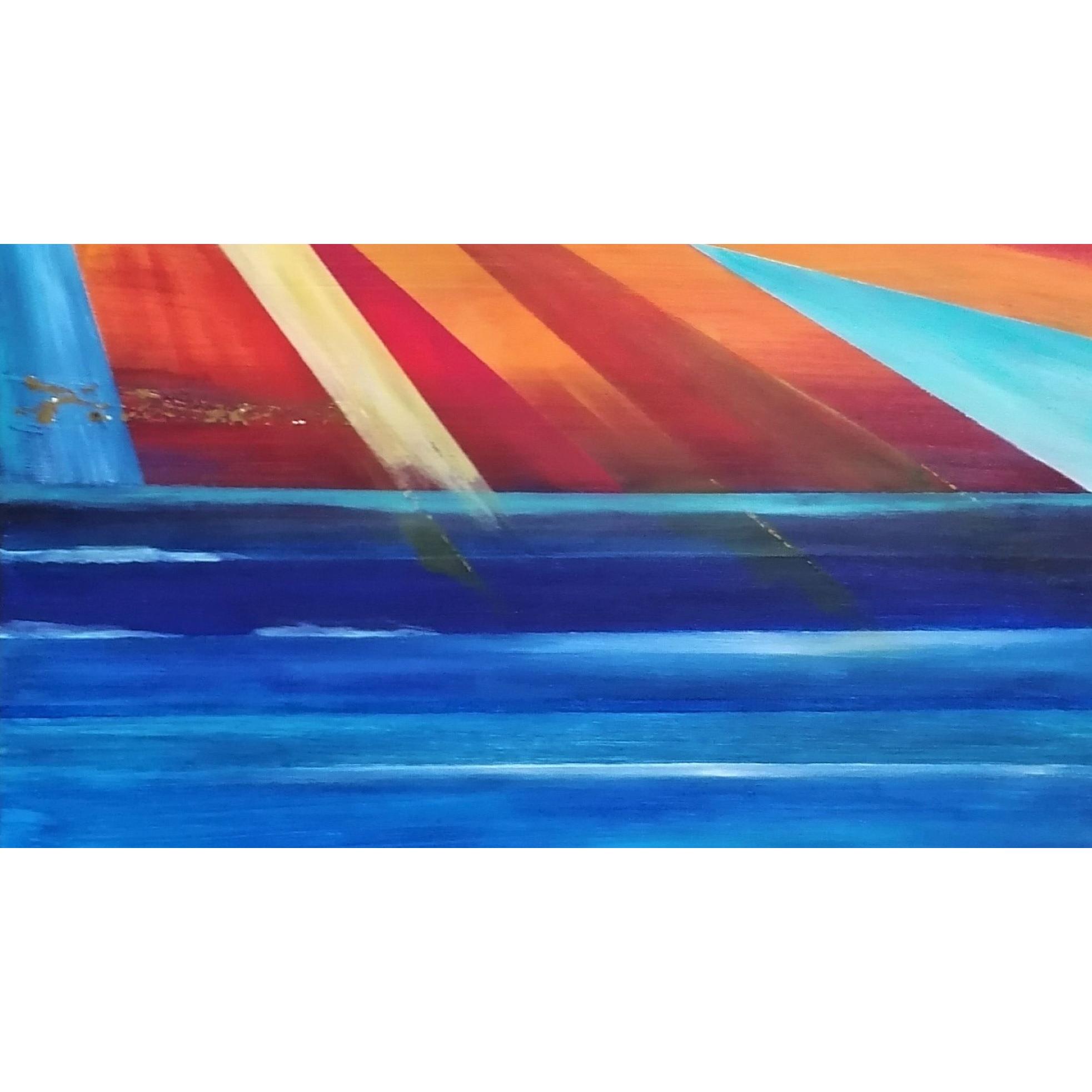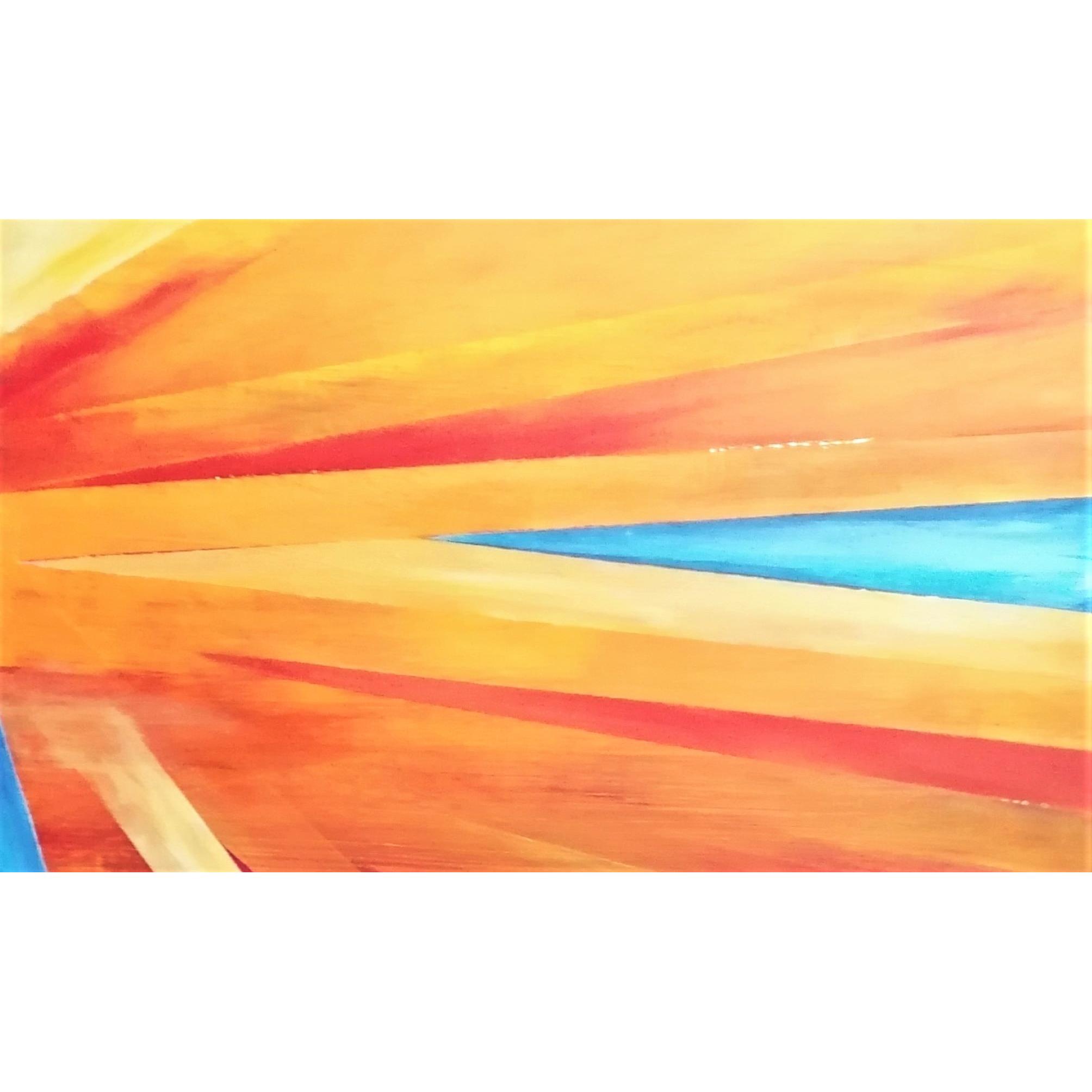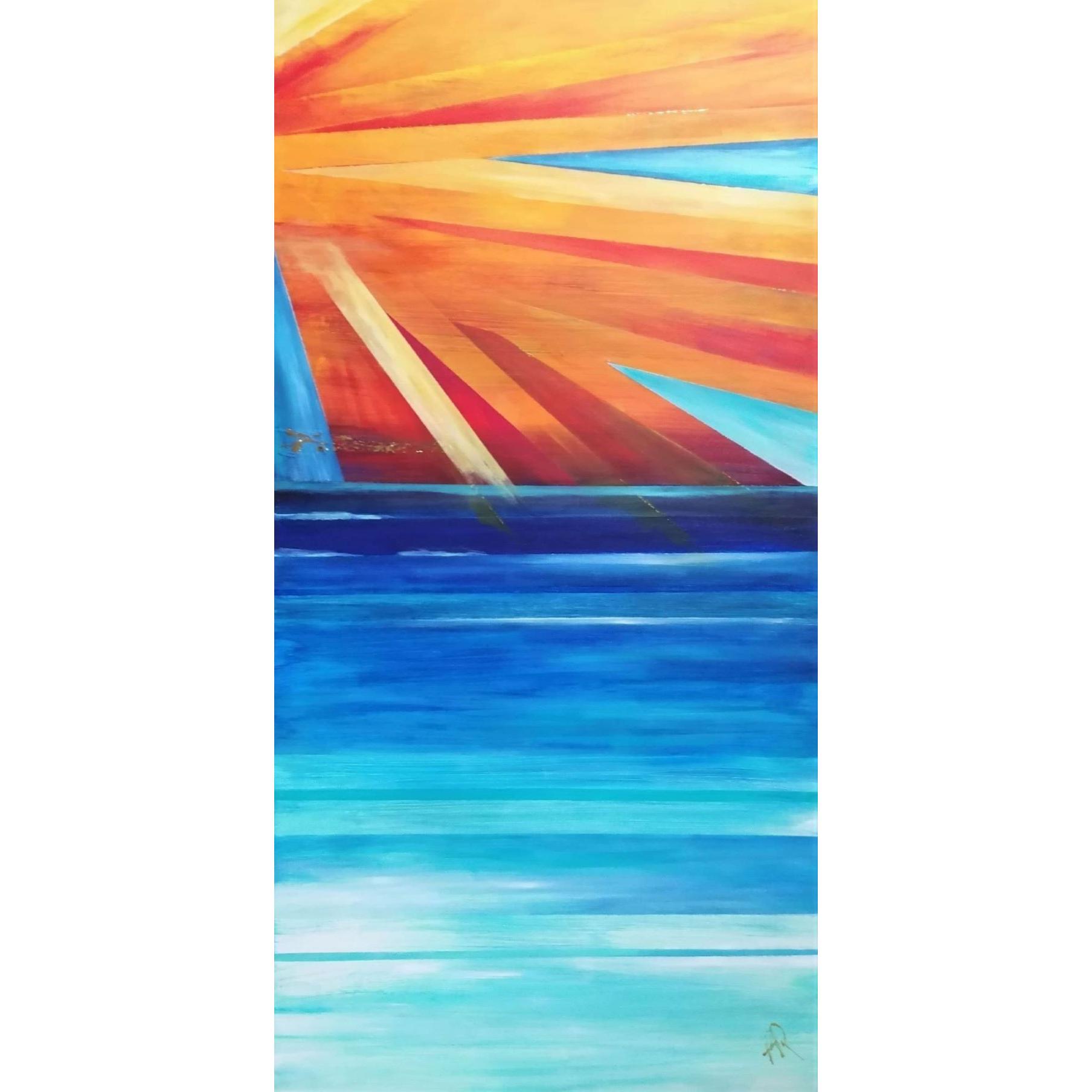 Acrylique sur châssis entoilé. Abstraction sur le thème du coucher de soleil sur la mer, tout en linéarité et en formes géométriques , donnant cet ensemble lumineux, moderne et attractif. Contraste de la partie supérieure en tons chauds principalement, et de la partie inférieure en couleurs froides rafraichissantes. Petites paillettes de feuille miroir or par endroits. Finition vernis.