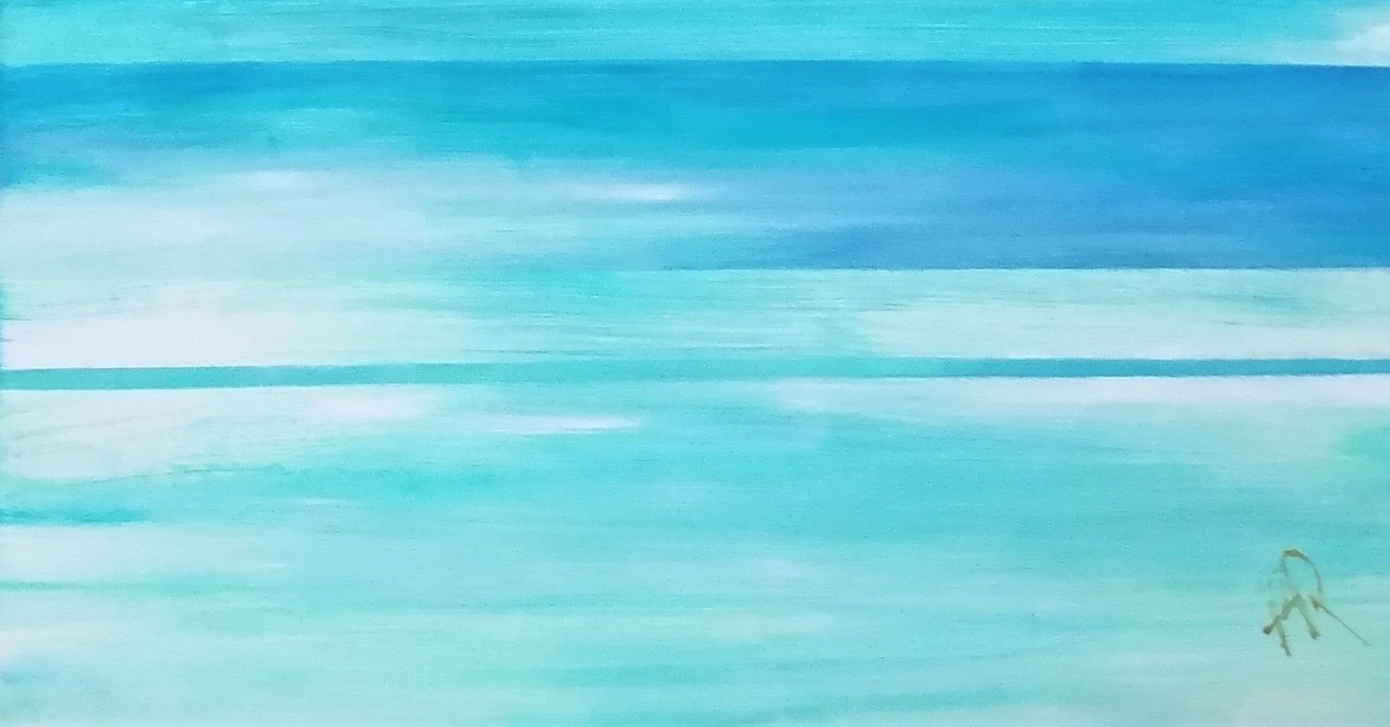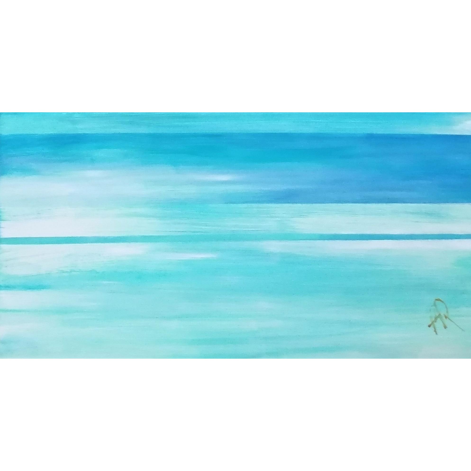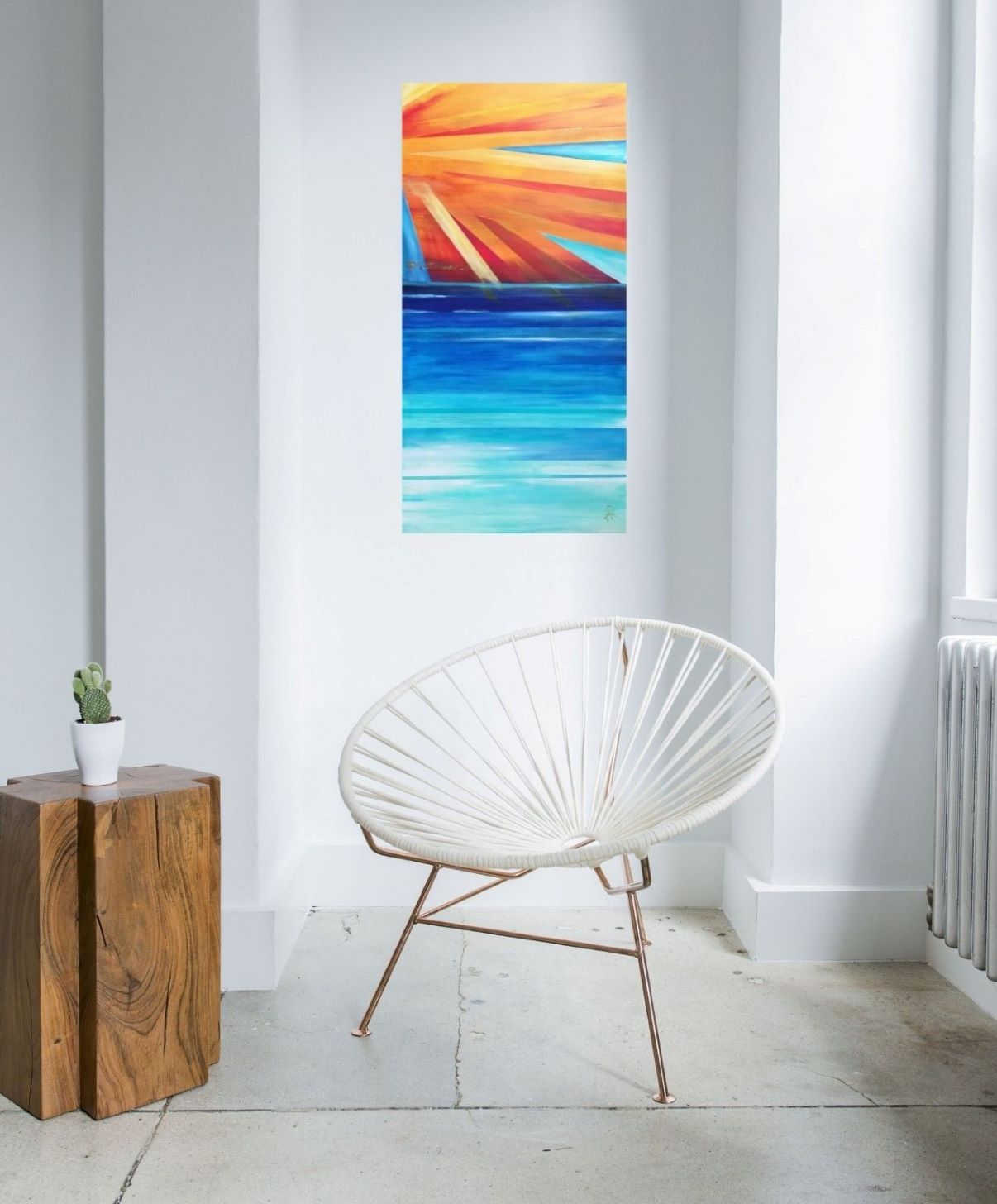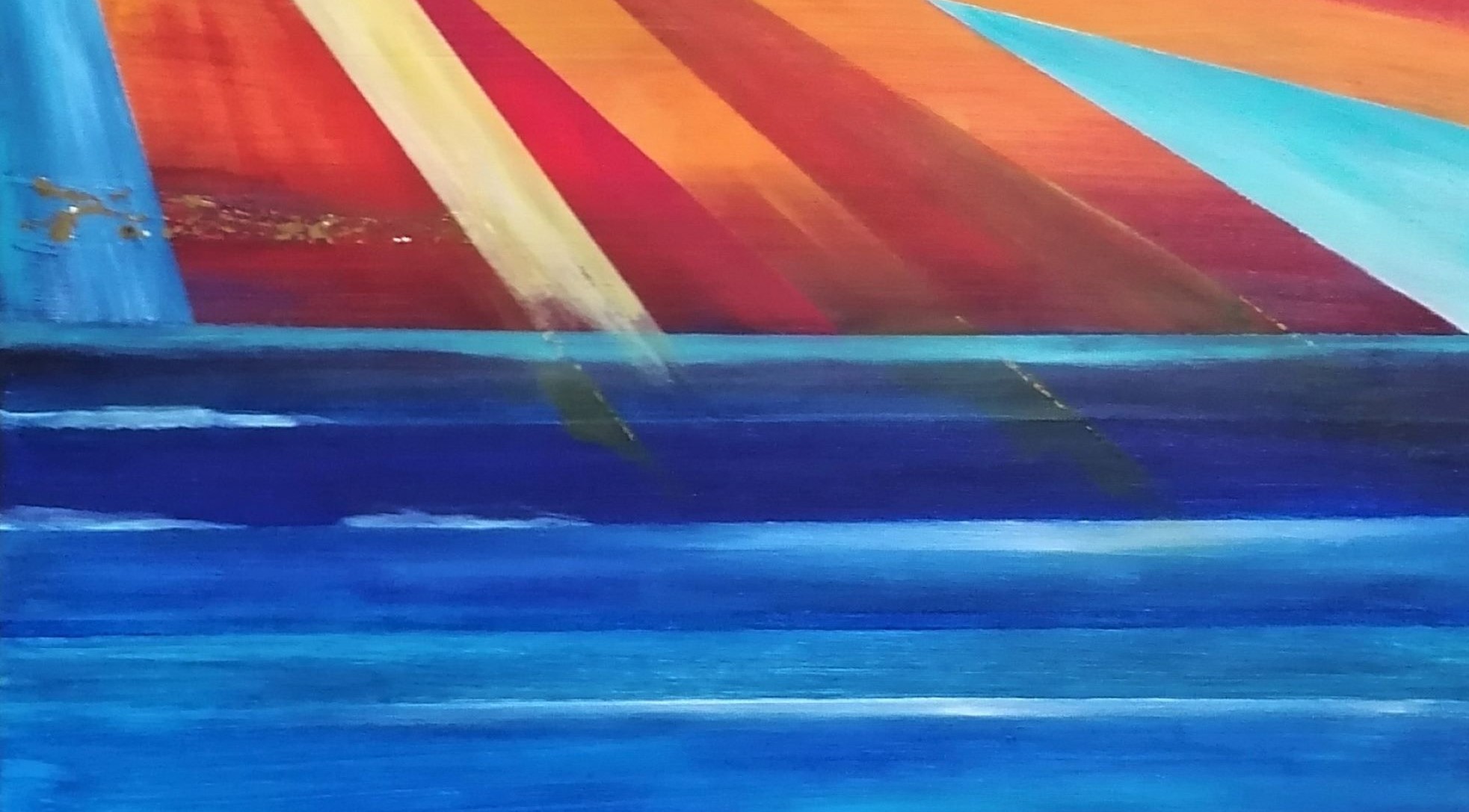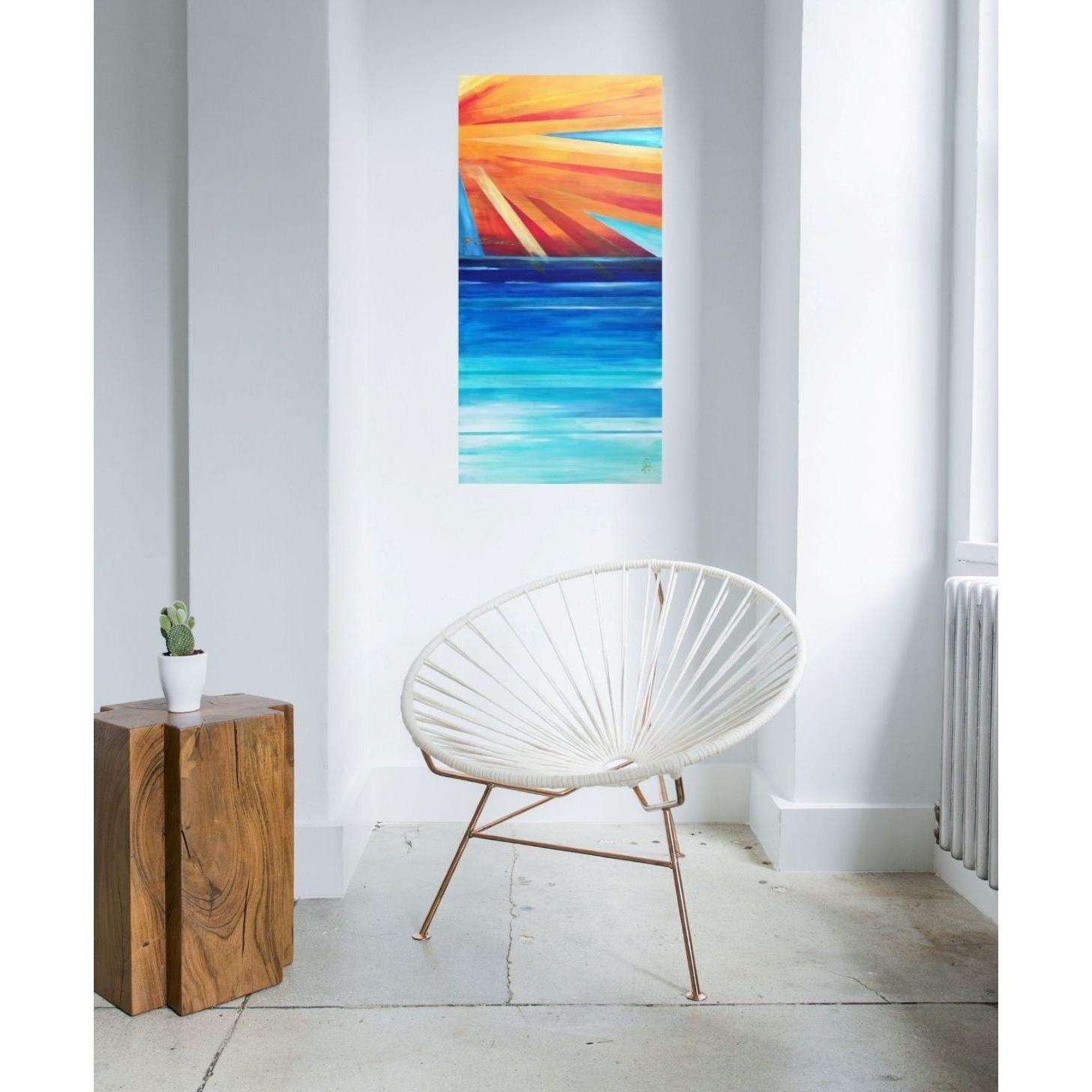 Acrylique sur châssis entoilé. Abstraction sur le thème du coucher de soleil sur la mer, tout en linéarité et en formes géométriques , donnant cet ensemble lumineux, moderne et attractif. Contraste de la partie supérieure en tons chauds principalement, et de la partie inférieure en couleurs froides rafraichissantes. Petites paillettes de feuille miroir or par endroits. Finition vernis.