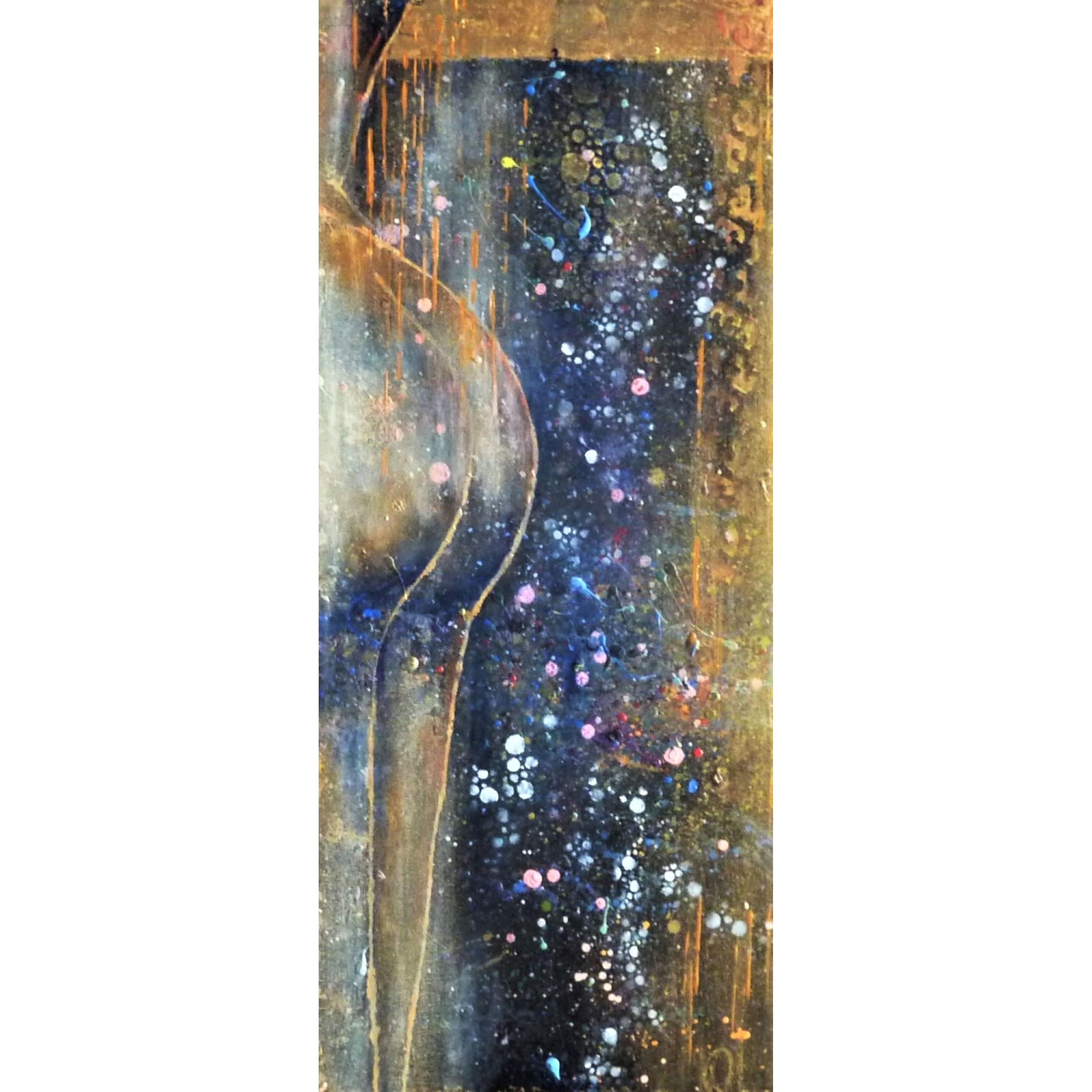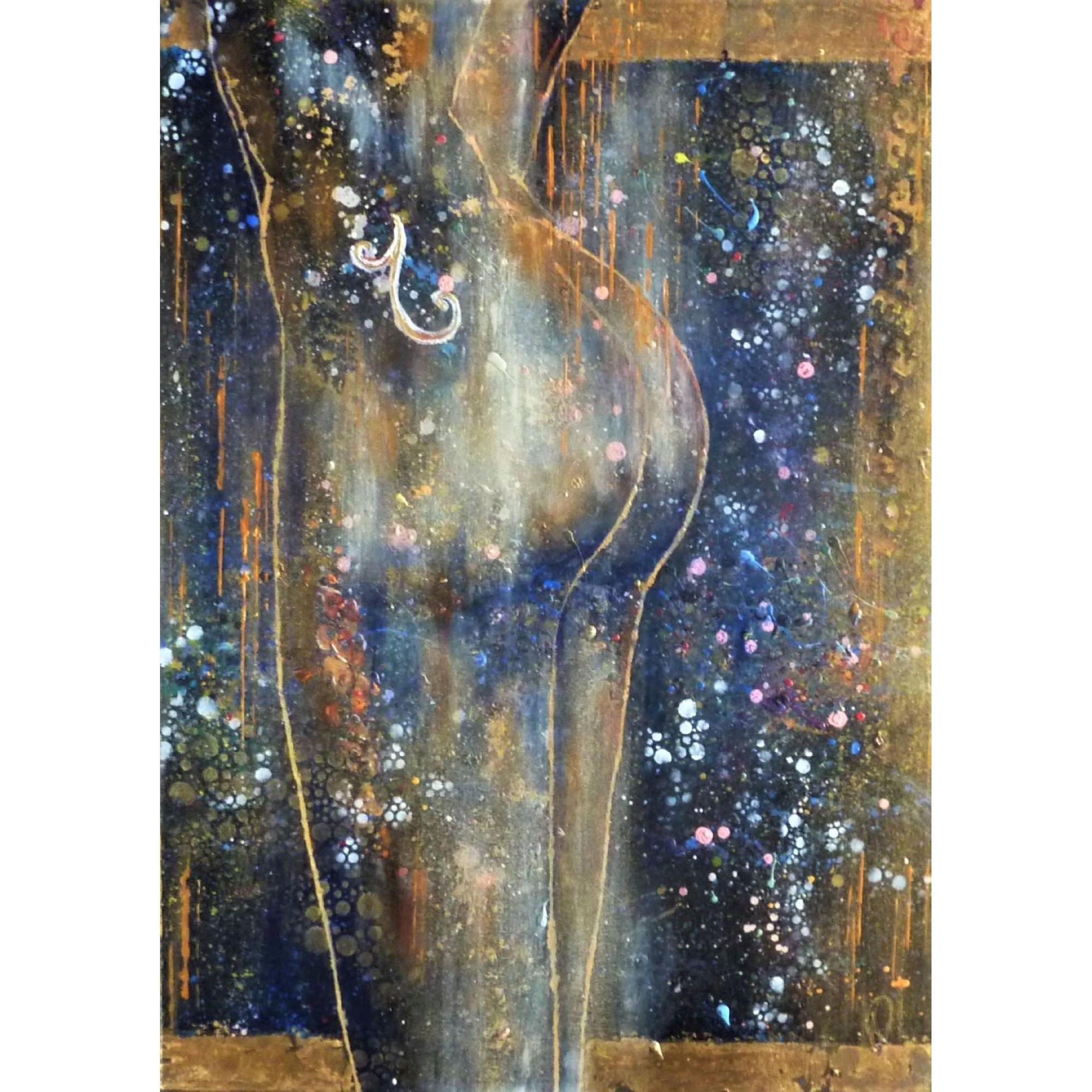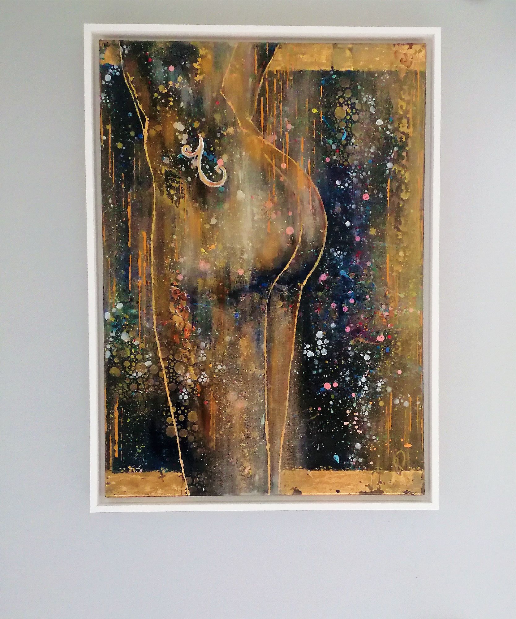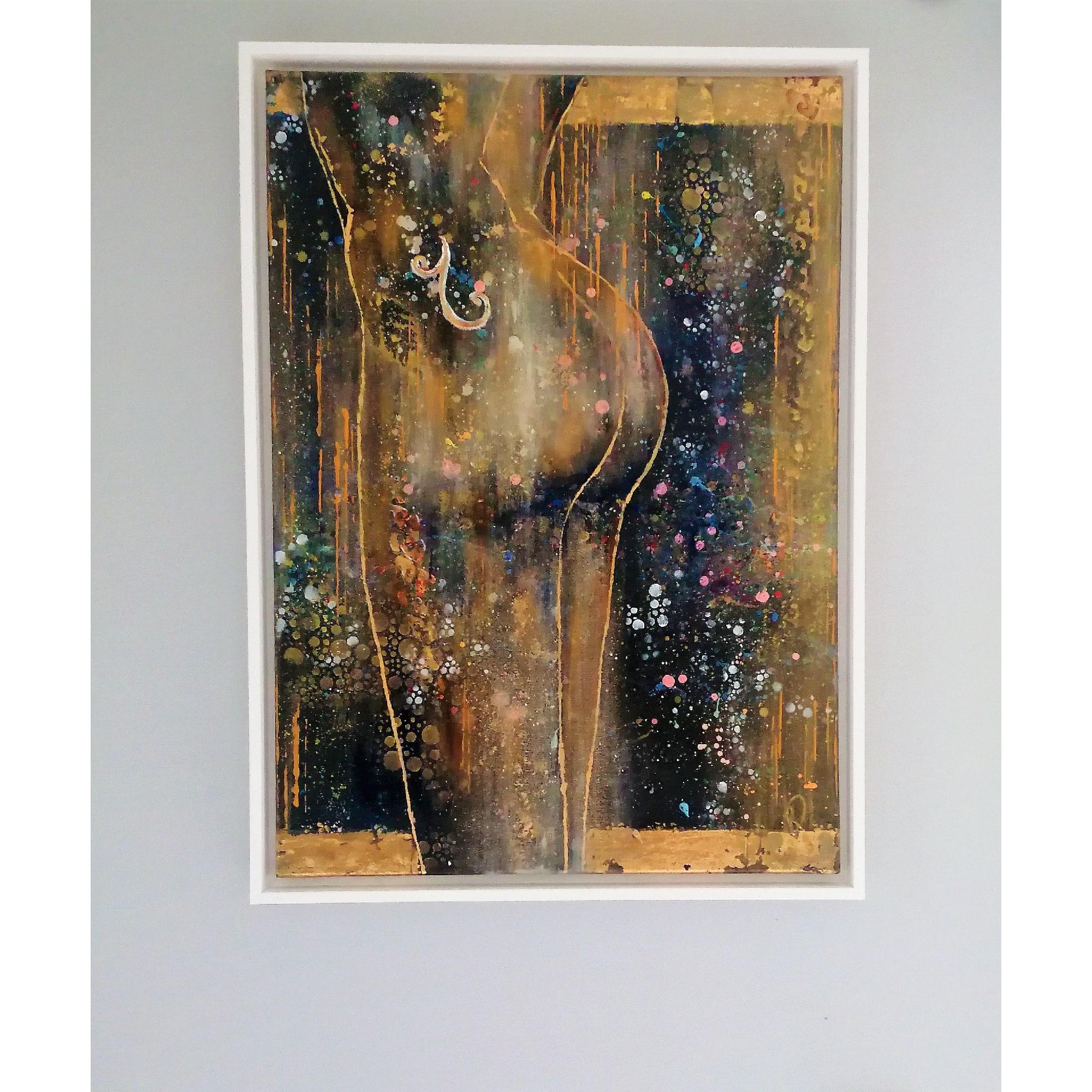Douceur et sensualité comme sous une douche de paillettes de peinture pour cette belle chute de reins. Acrylique, feuille métallique, tonalités douces rehaussées d'or et de cuivre, finition vernis. Encadré dans un cadre américain en bois blanc, dimensions finales 74x54 cm.