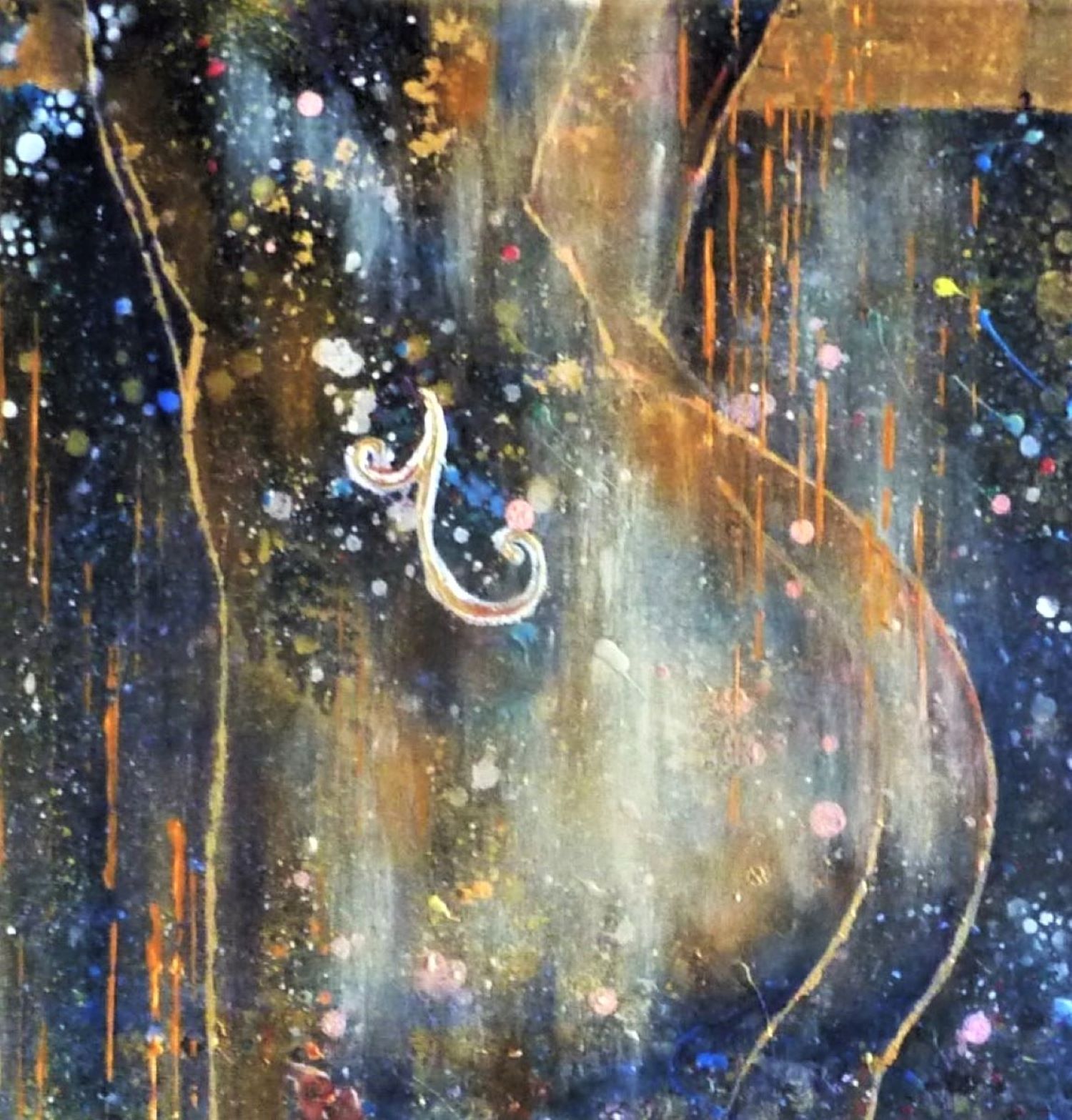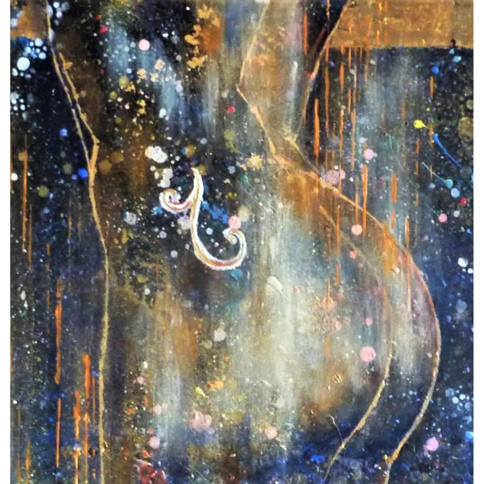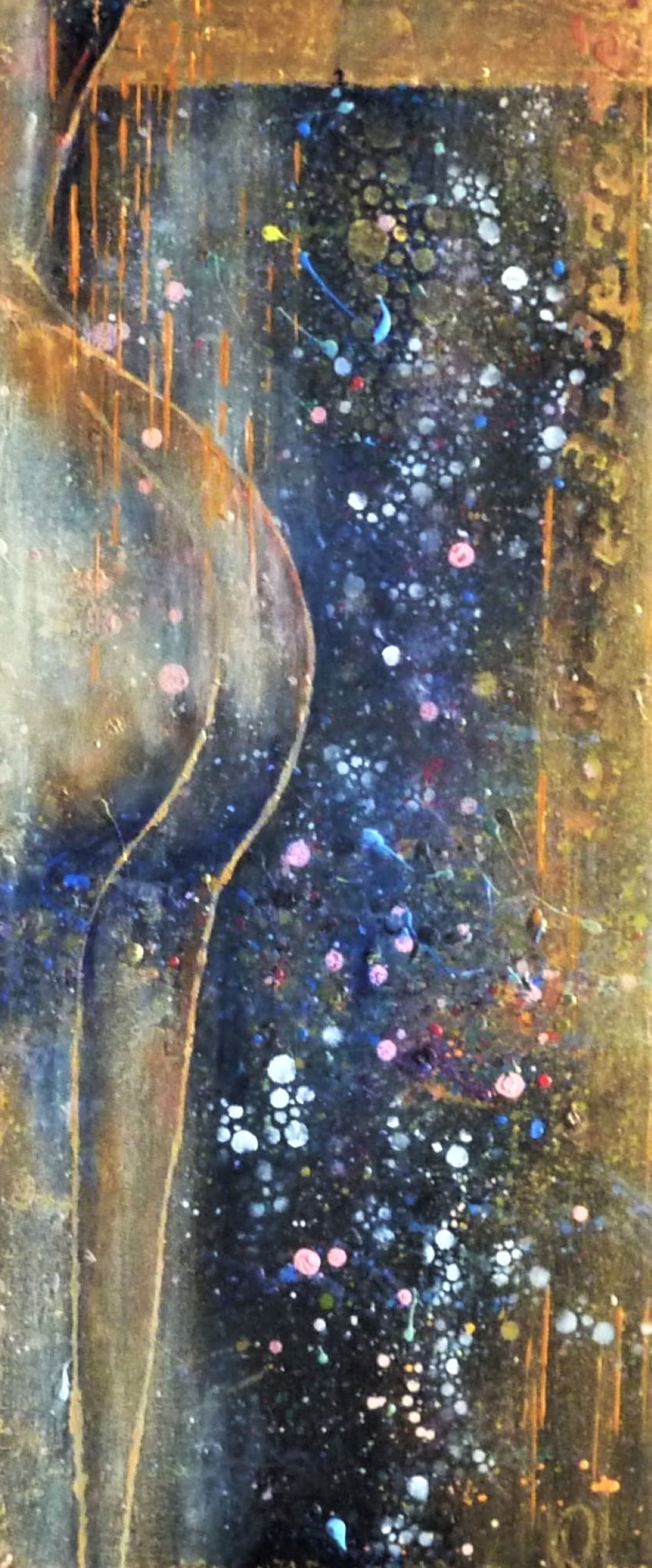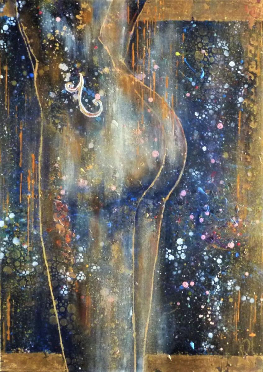 Douceur et sensualité comme sous une douche de paillettes de peinture pour cette belle chute de reins. Acrylique, feuille métallique, tonalités douces rehaussées d'or et de cuivre, finition vernis. Encadré dans un cadre américain en bois blanc, dimensions finales 74x54 cm.