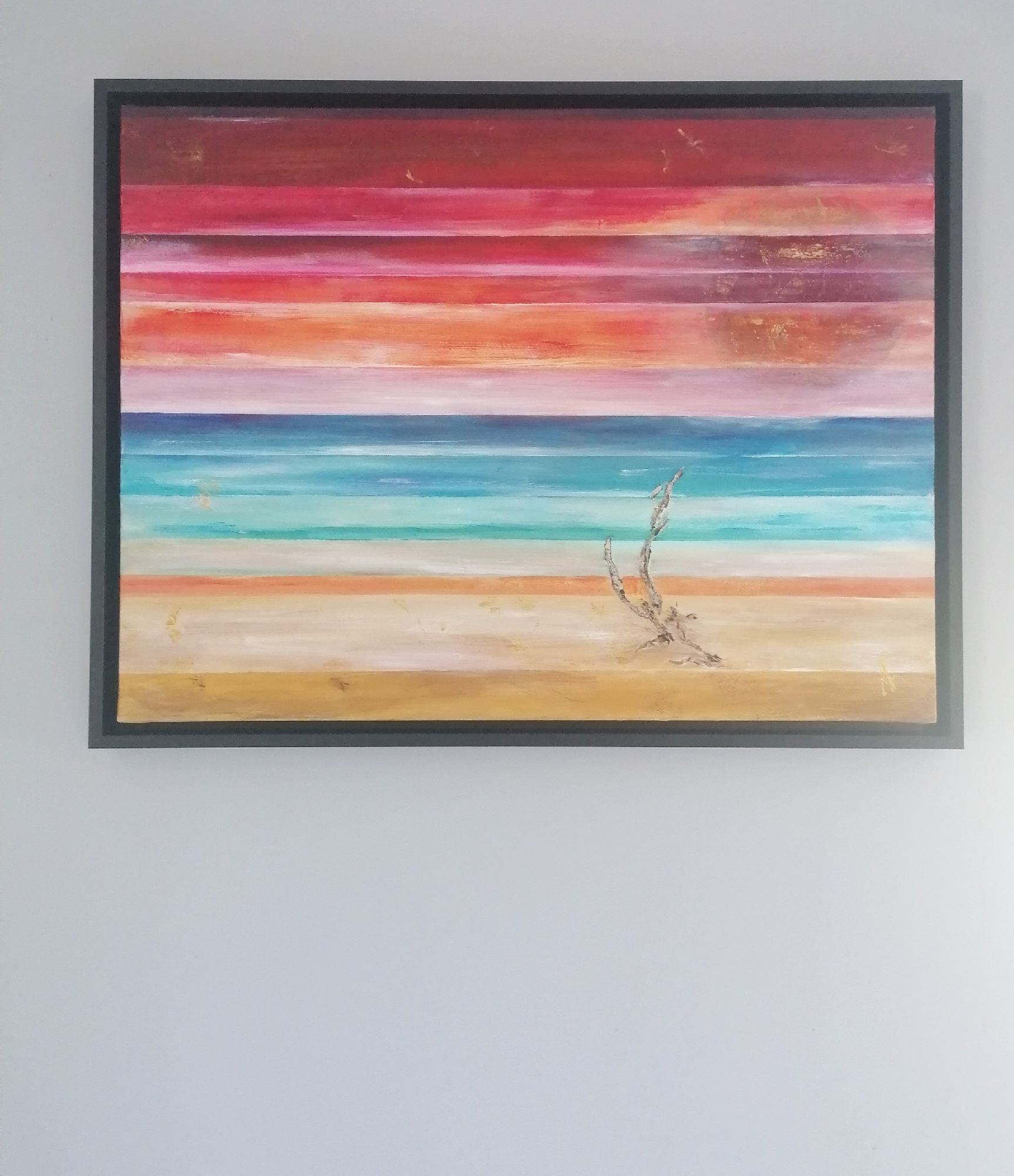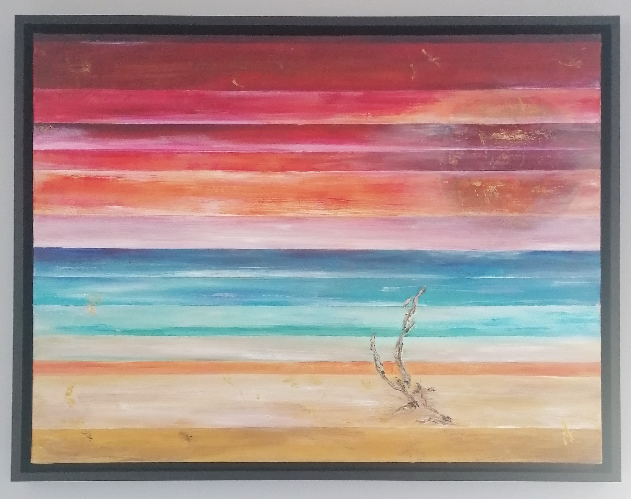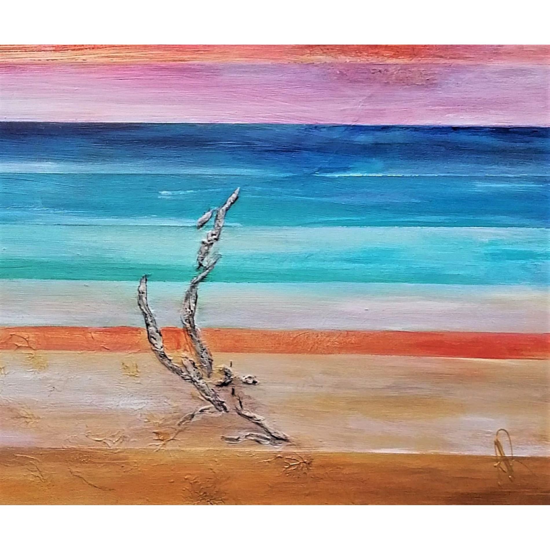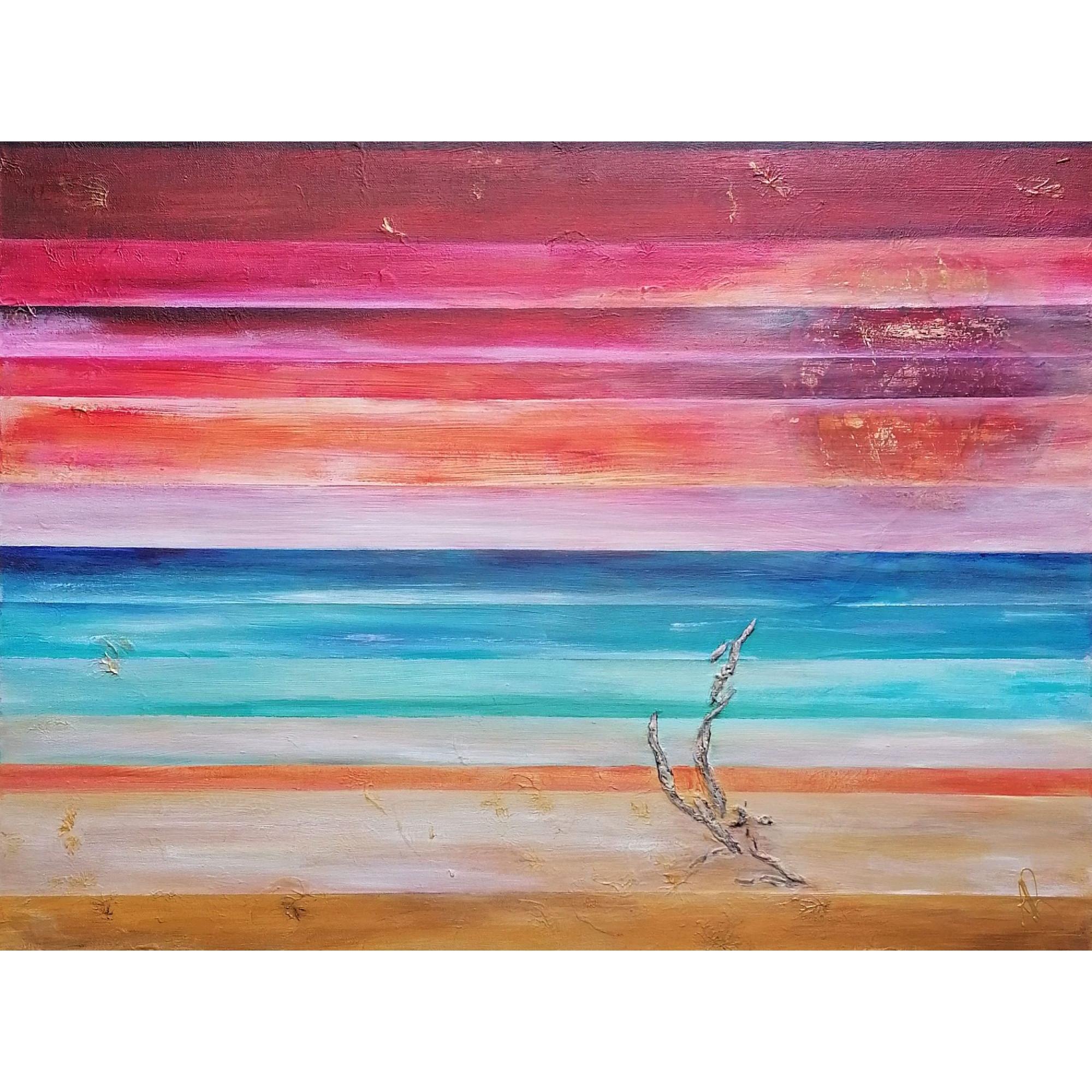 La plage au lever ou au coucher du soleil, lequel est suggéré avec des éclats de feuilles d'or, semblant sortir d'une brume colorée. Quiétude de la plage déserte, avec juste ce morceau de bois flotté. Collage et petits reliefs posés au hasard. Finition vernis. Encadré dans cadre américain en bois noir, dimensions finales 50x65 cm.