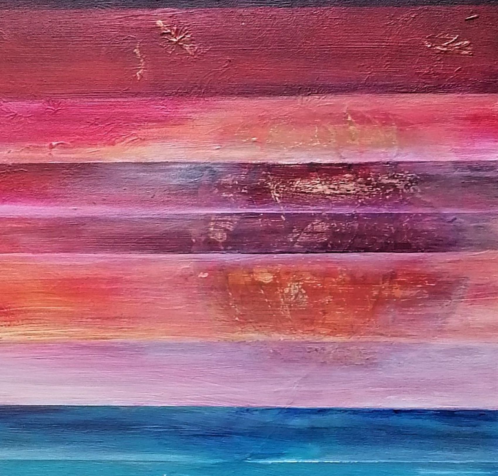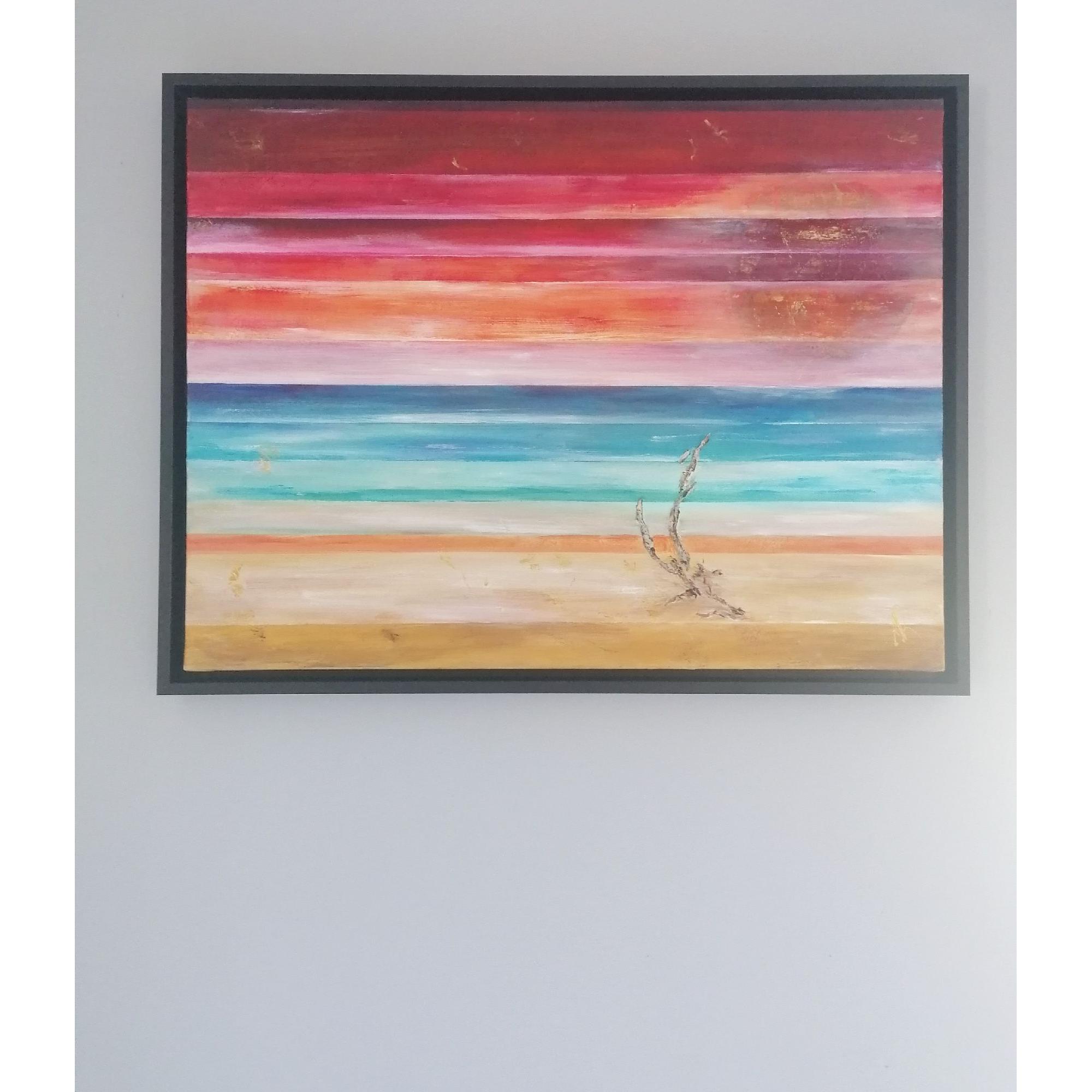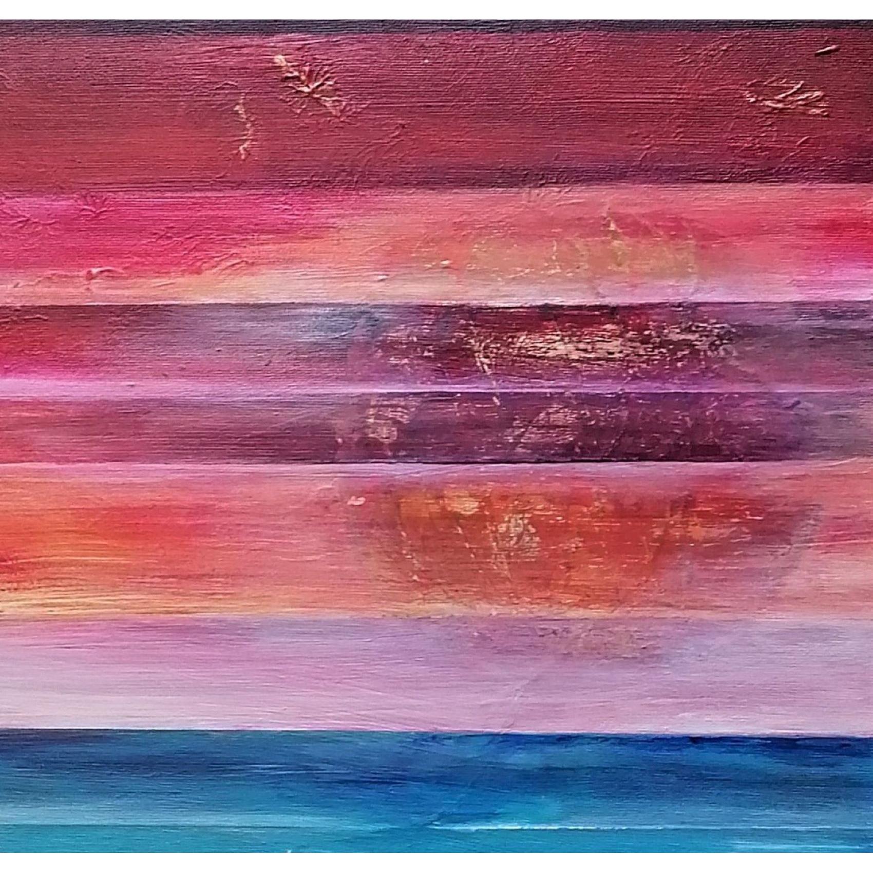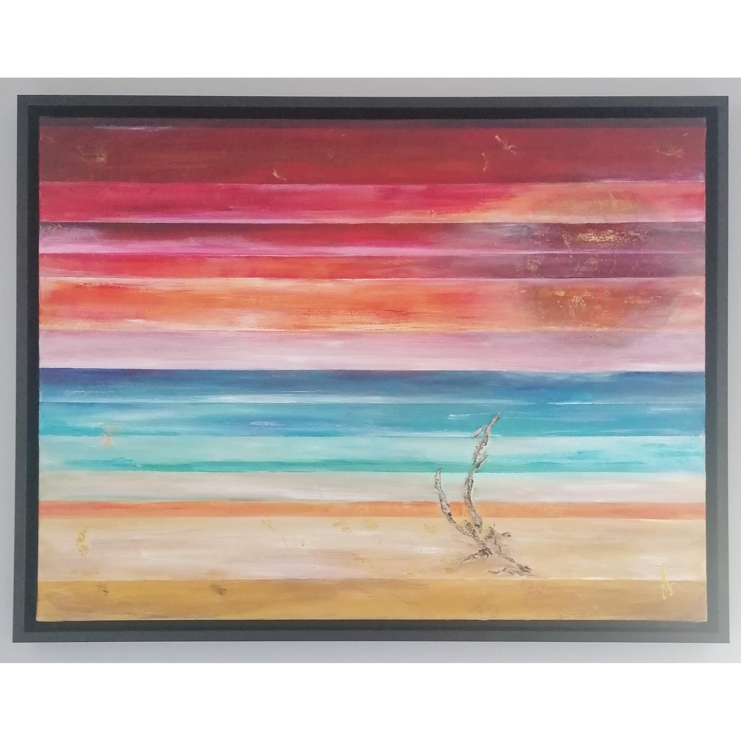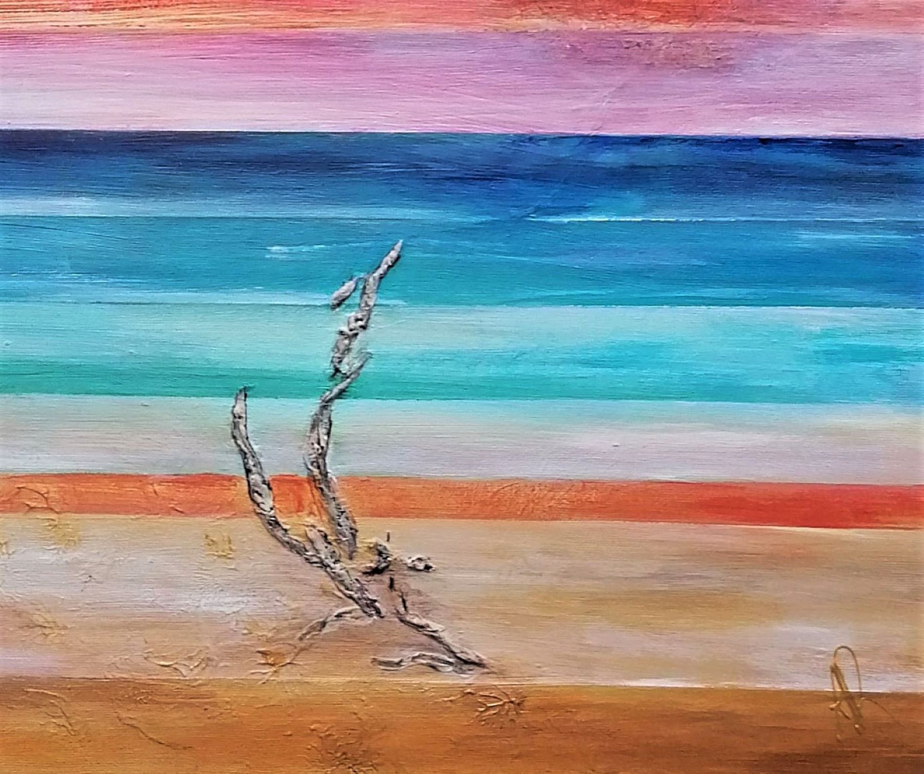 La plage au lever ou au coucher du soleil, lequel est suggéré avec des éclats de feuilles d'or, semblant sortir d'une brume colorée. Quiétude de la plage déserte, avec juste ce morceau de bois flotté. Collage et petits reliefs posés au hasard. Finition vernis. Encadré dans cadre américain en bois noir, dimensions finales 50x65 cm.