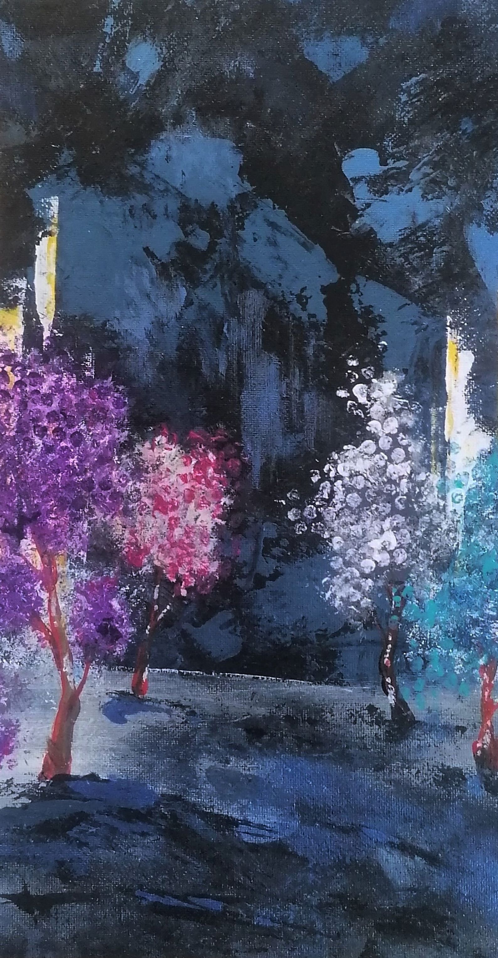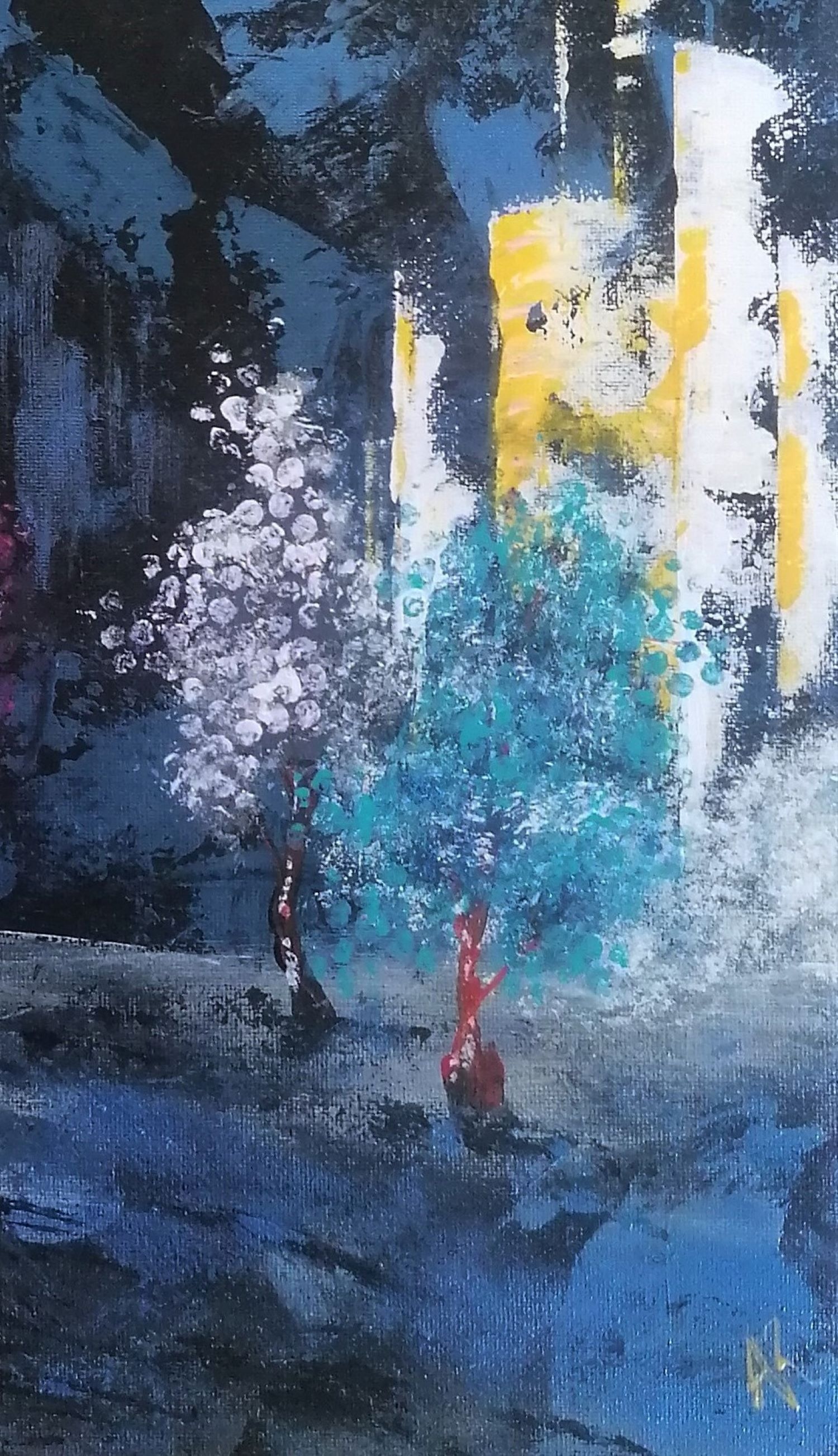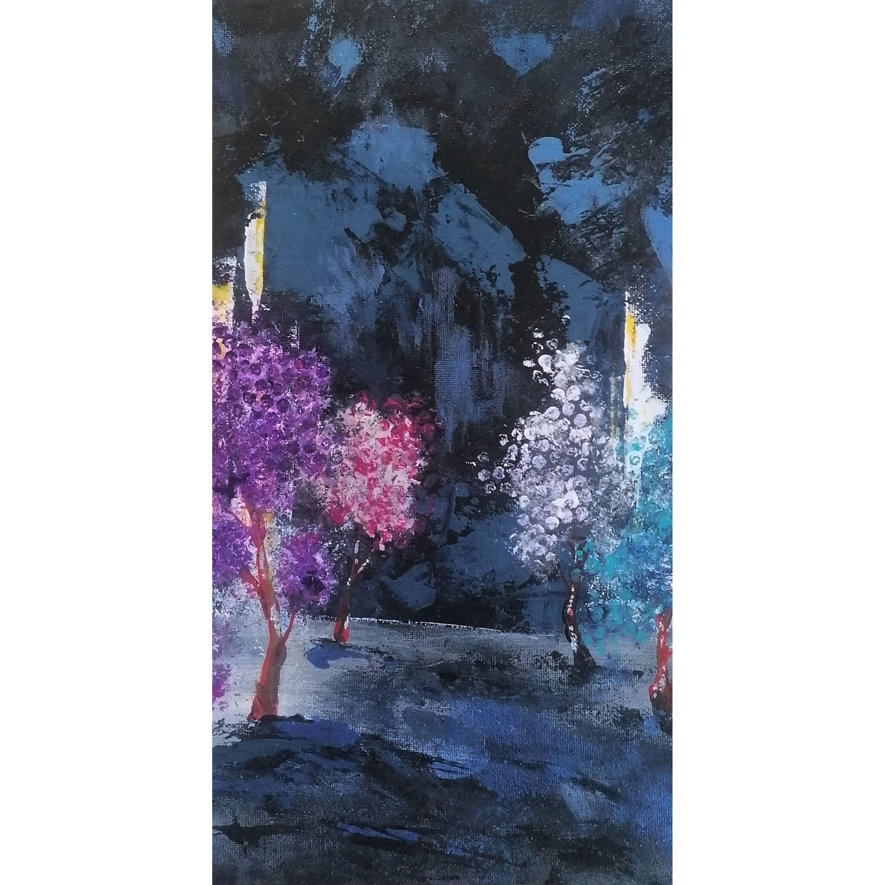 Les tours, les arbres, l'union de l' urbanisation et de la nature sur cette représentation aux tonalités à la fois multicolores et sombres pour évoquer l'atmosphère nocturne en laissant de côté sa froideur. Acrylique sur toile tendue sur une plaque de bois de 30x30 cm, finition vernis.