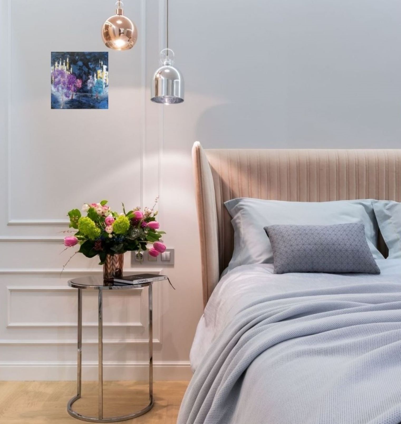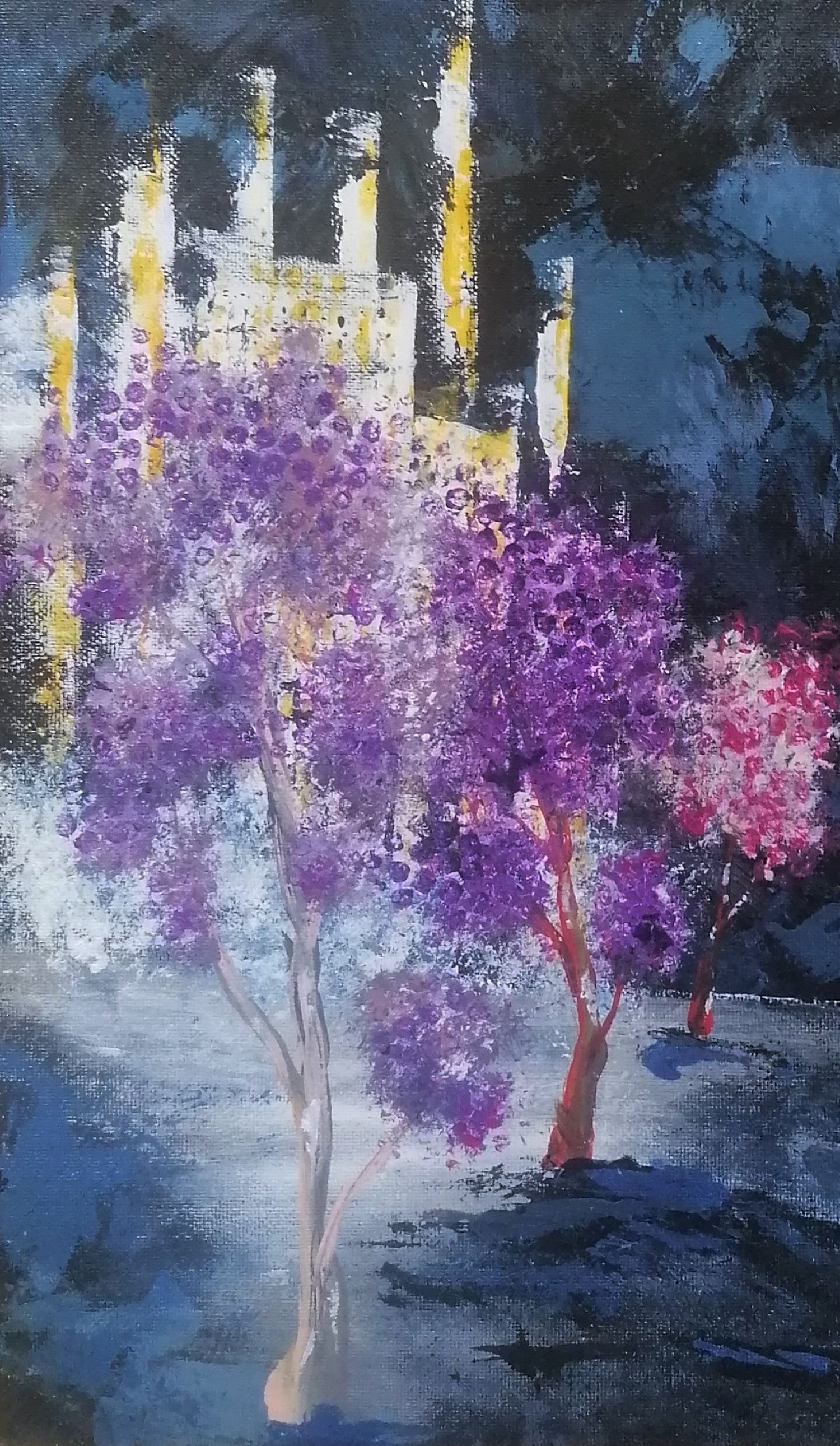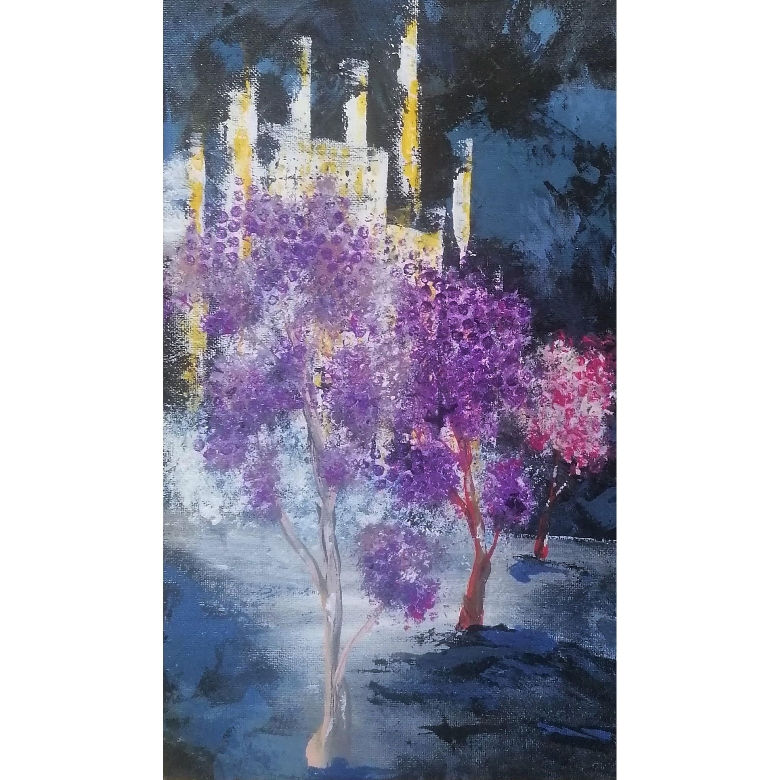 Les tours, les arbres, l'union de l' urbanisation et de la nature sur cette représentation aux tonalités à la fois multicolores et sombres pour évoquer l'atmosphère nocturne en laissant de côté sa froideur. Acrylique sur toile tendue sur une plaque de bois de 30x30 cm, finition vernis.