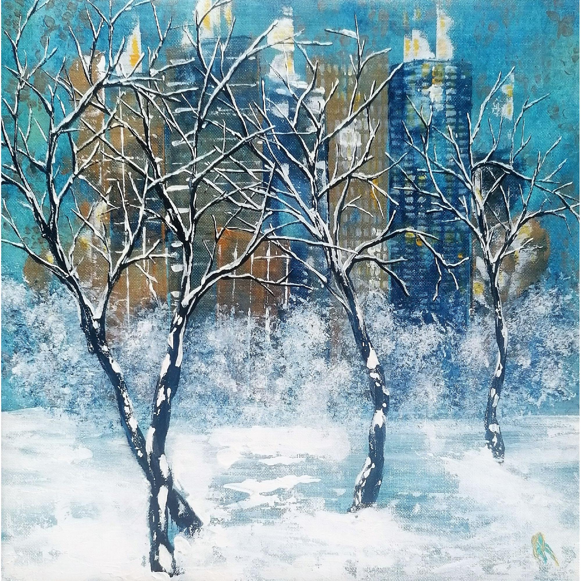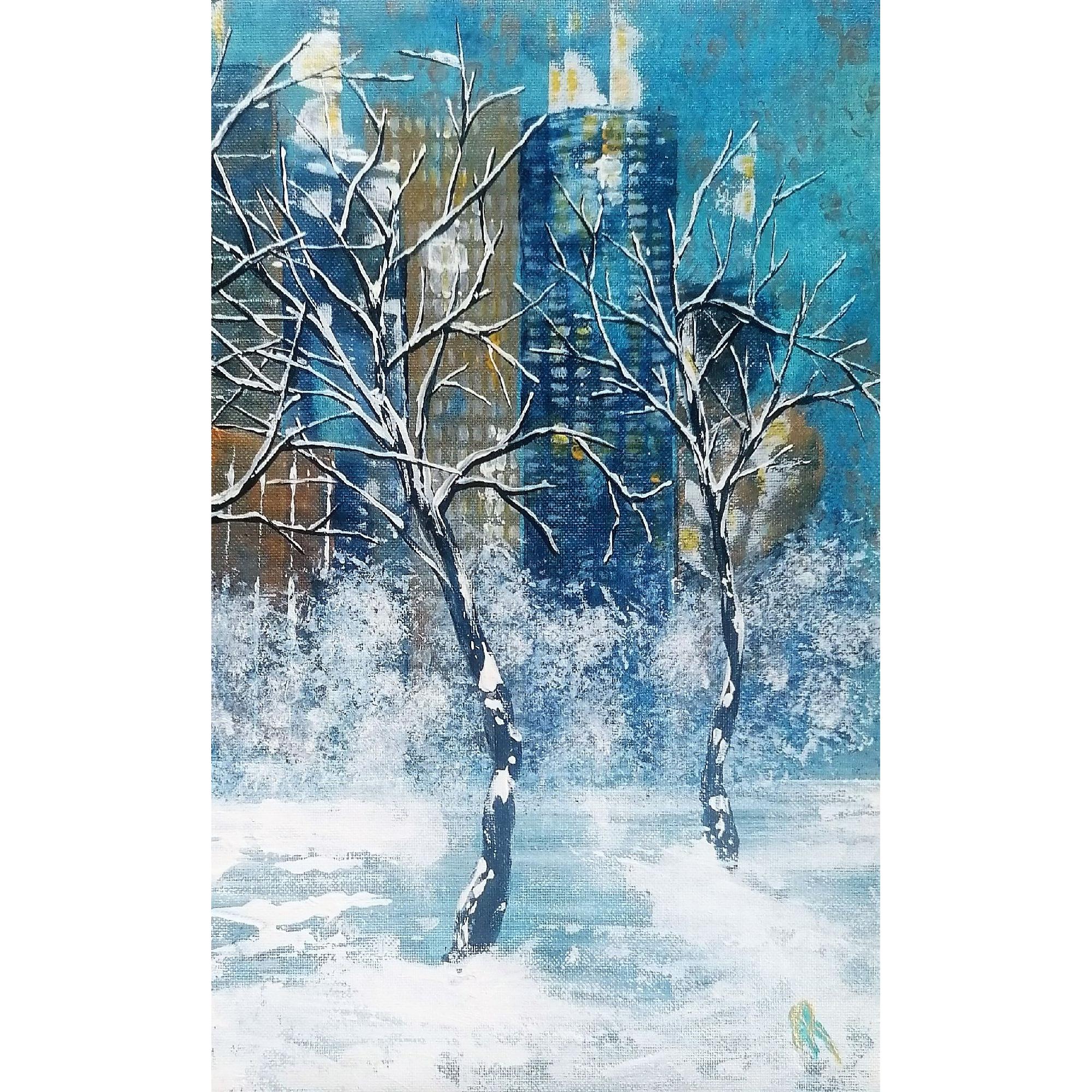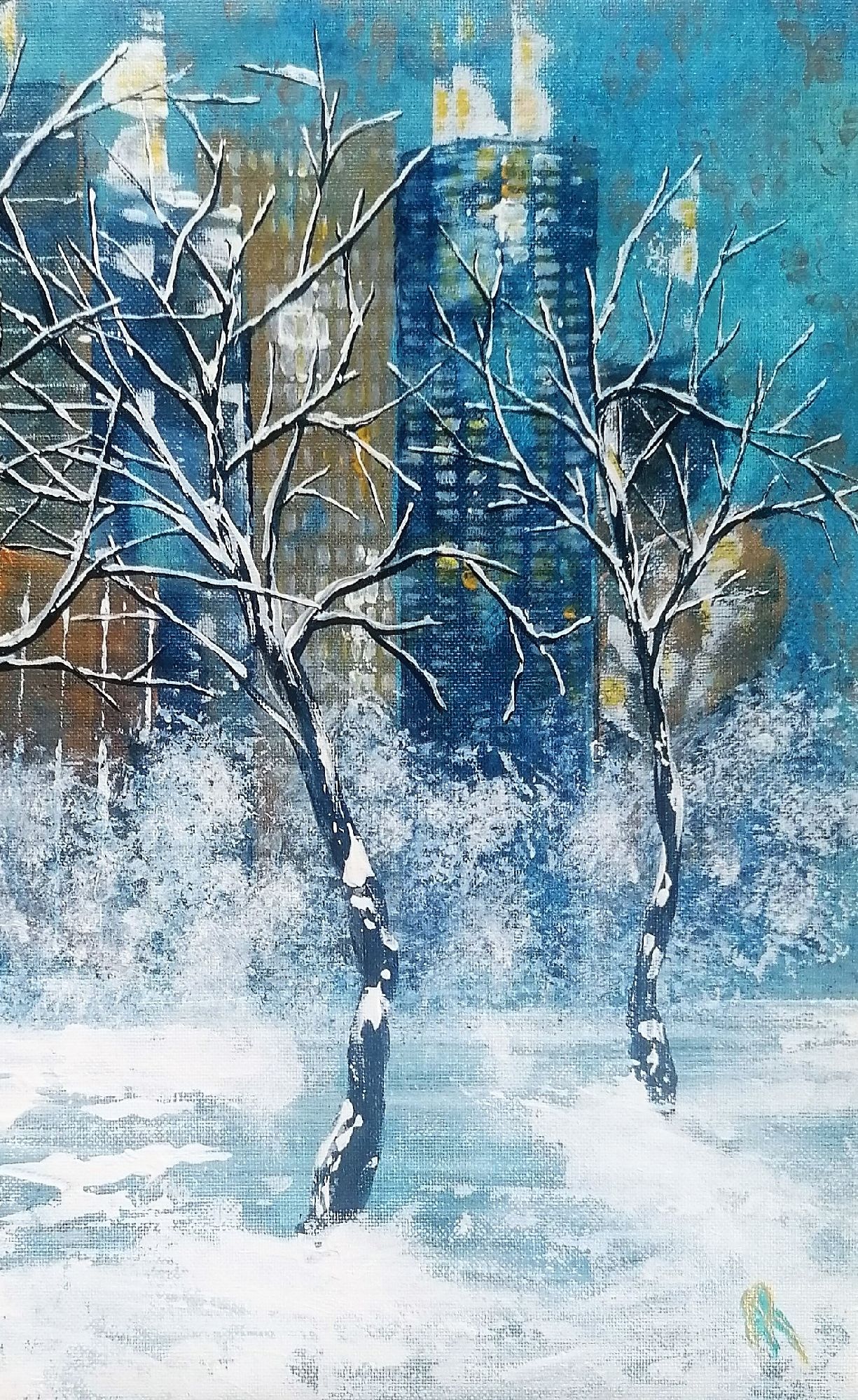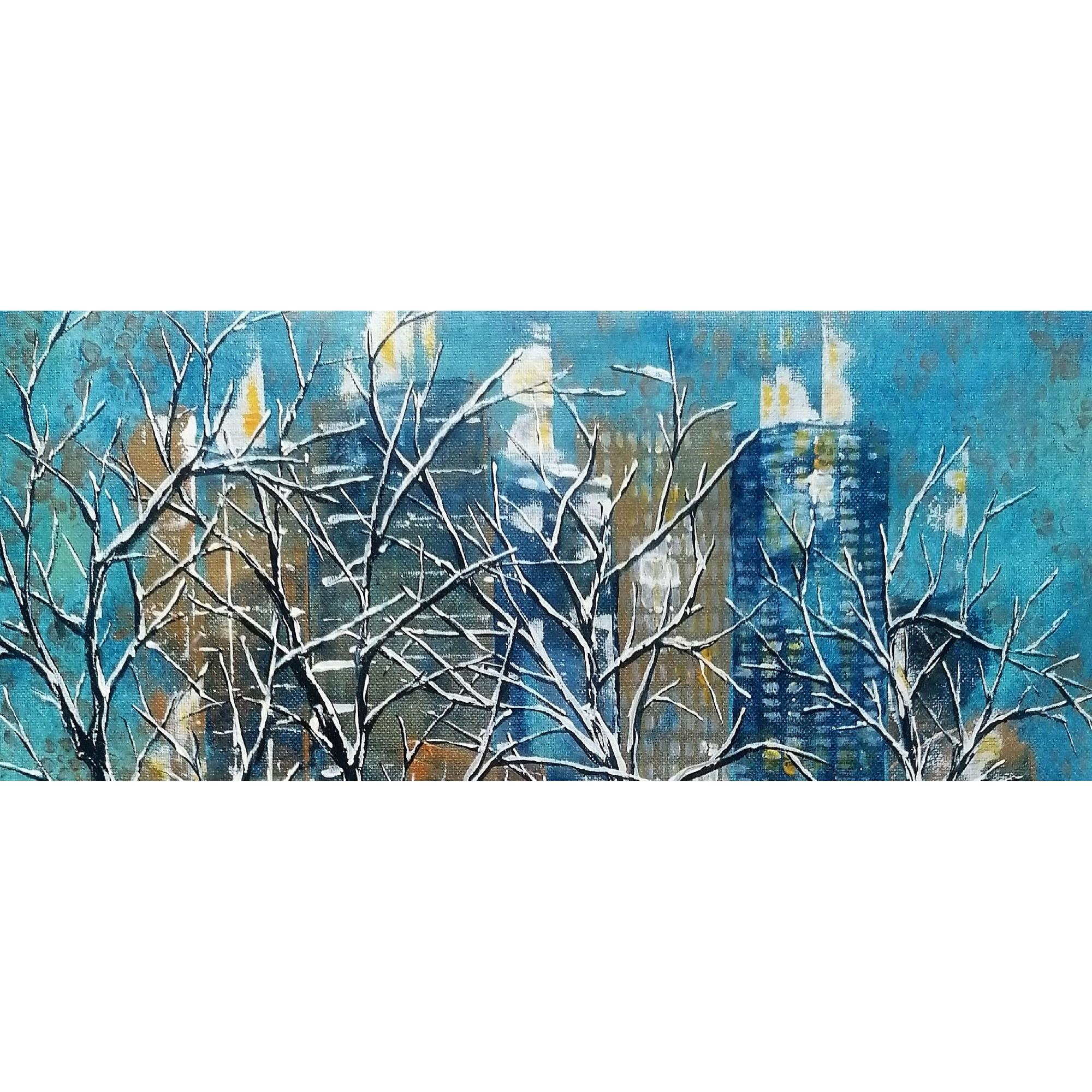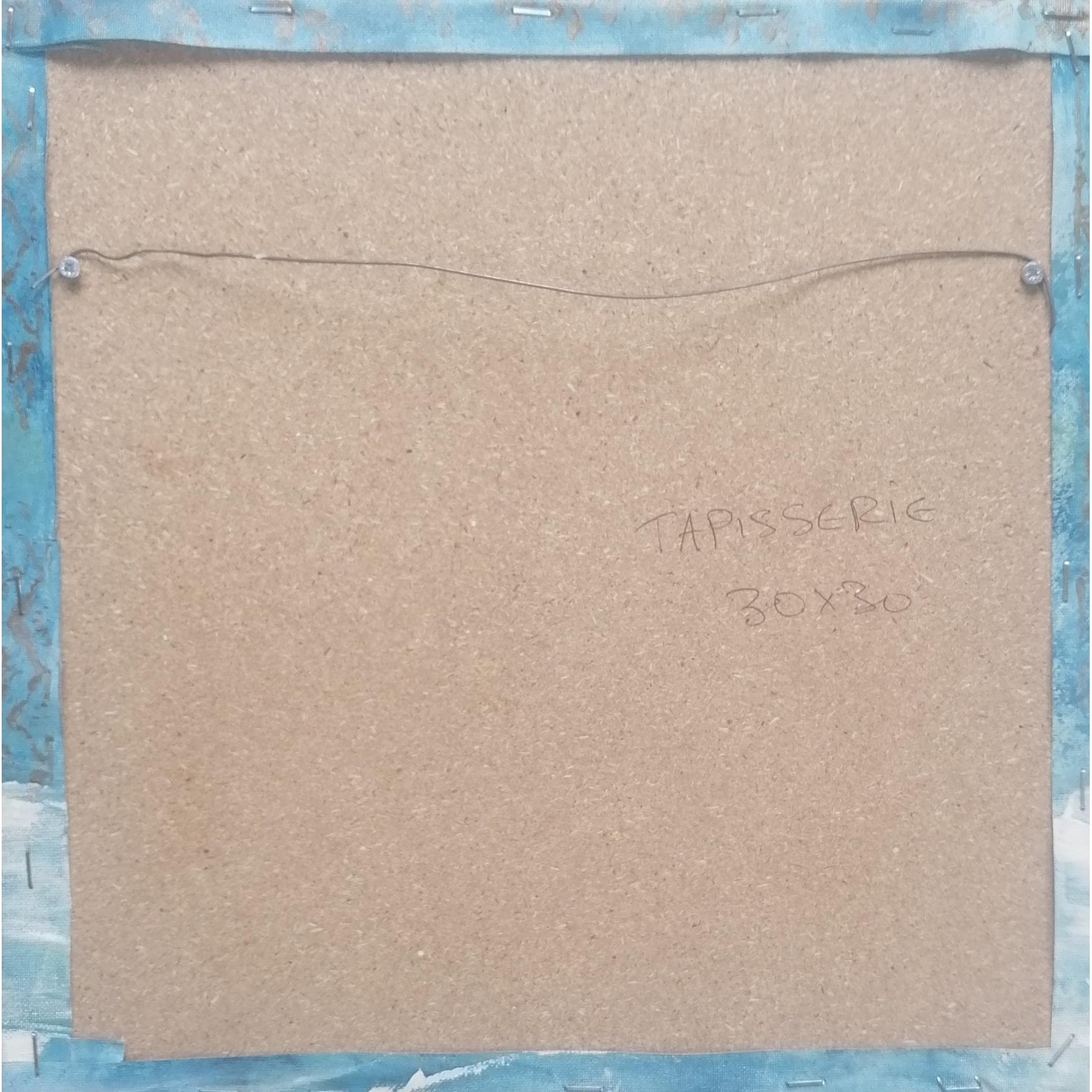 Les tours, les arbres, l'union de l' urbanisation et de la nature sur cette représentation aux tonalités majoritairement bleues, blanches et dorées, qui s'adaptent à toutes sortes de revêtements muraux. Acrylique sur toile tendue sur une plaque de bois de 30x30 cm, cette toile s'appelle Tapisserie en raison des motifs réguliers qui se détachent sur le ciel. Finition vernis.