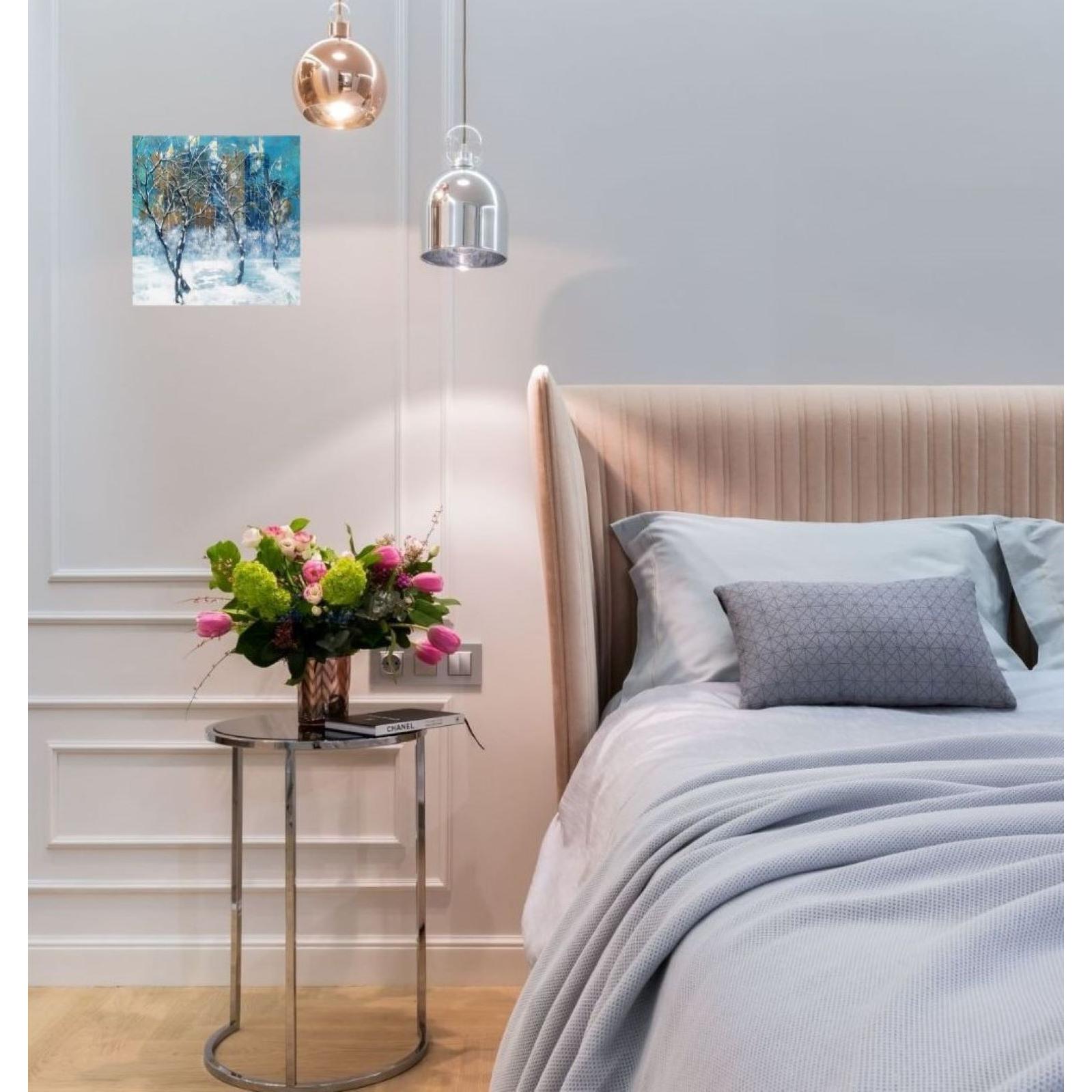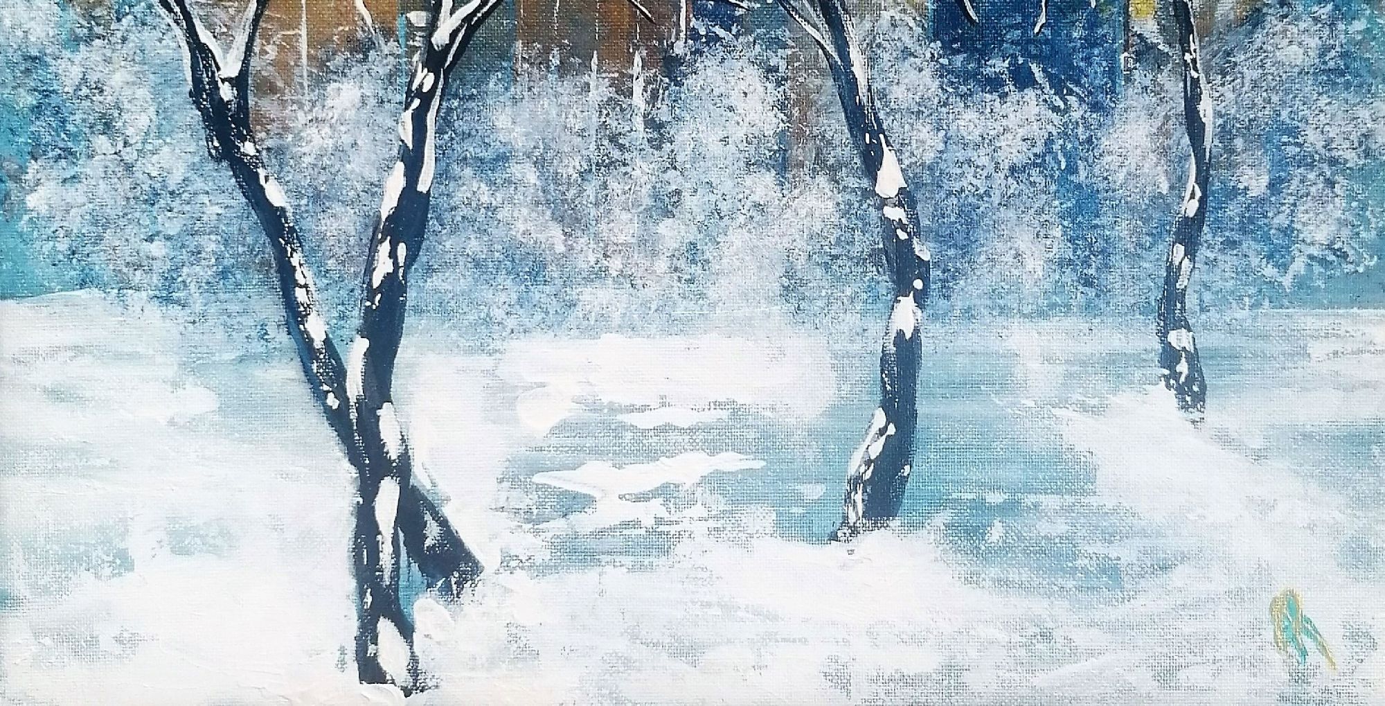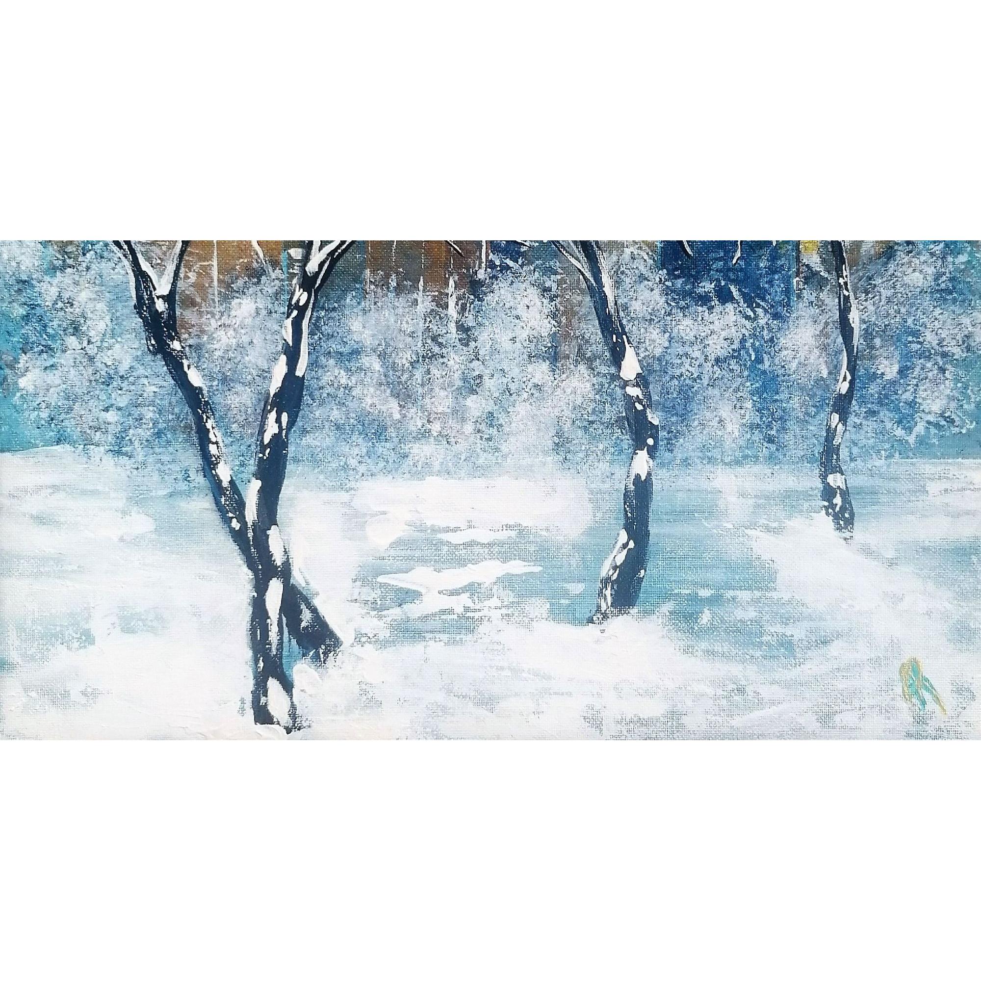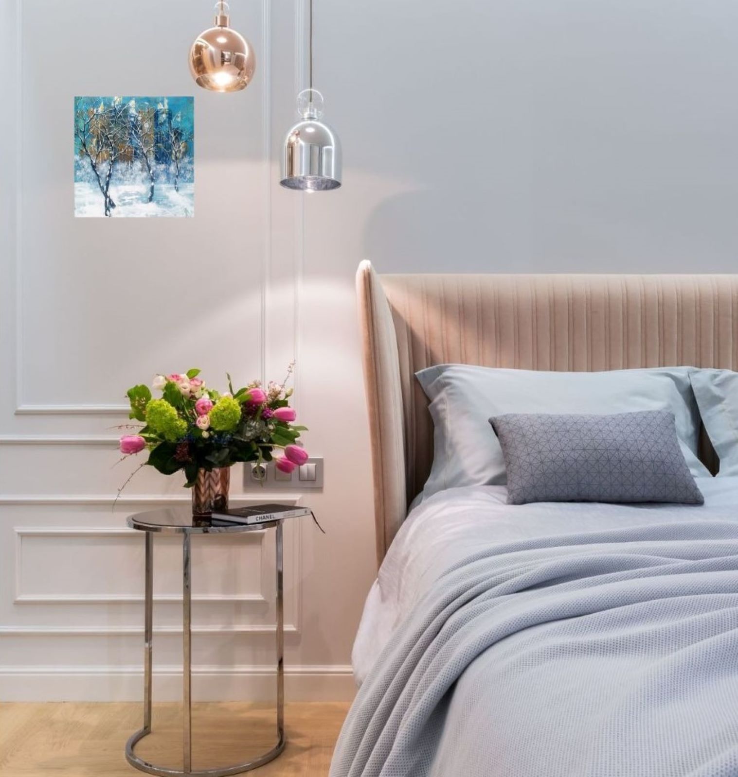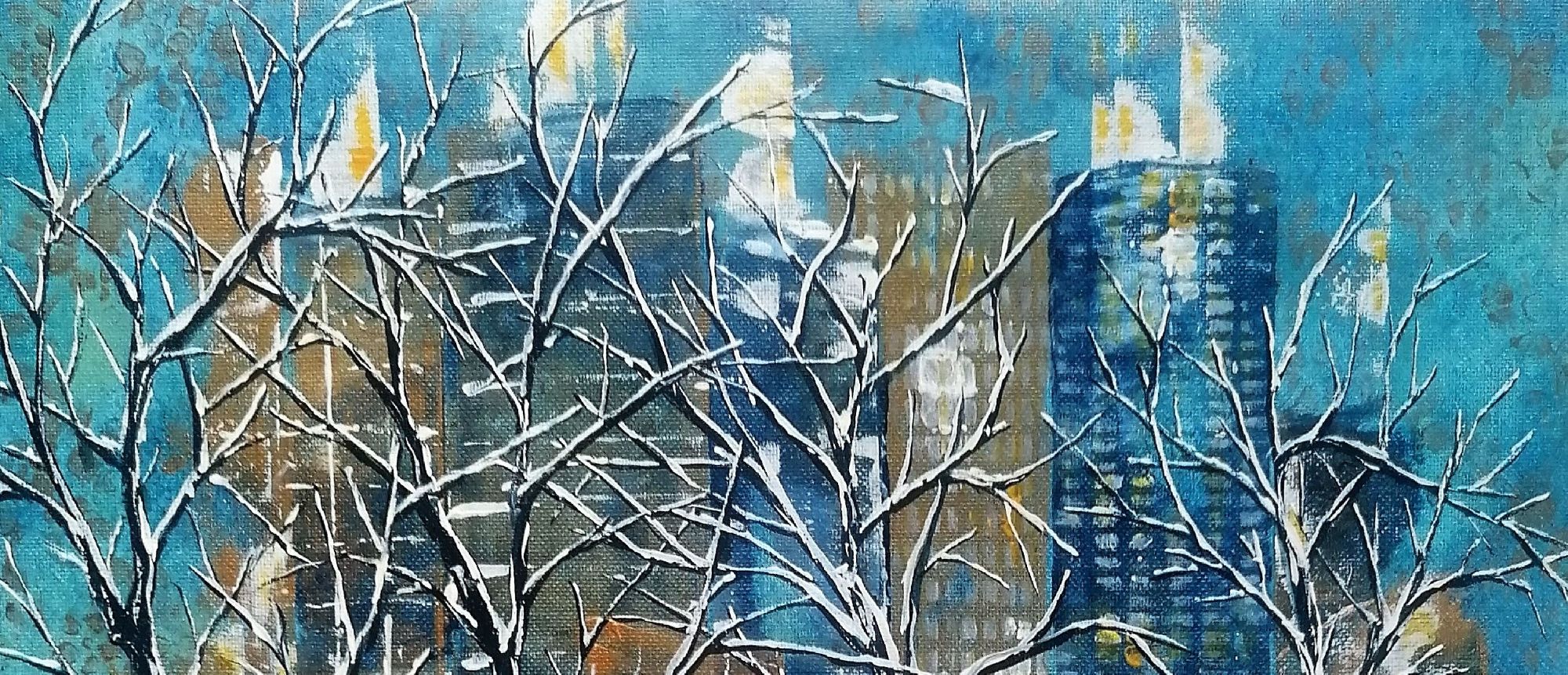 Les tours, les arbres, l'union de l' urbanisation et de la nature sur cette représentation aux tonalités majoritairement bleues, blanches et dorées, qui s'adaptent à toutes sortes de revêtements muraux. Acrylique sur toile tendue sur une plaque de bois de 30x30 cm, cette toile s'appelle Tapisserie en raison des motifs réguliers qui se détachent sur le ciel. Finition vernis.