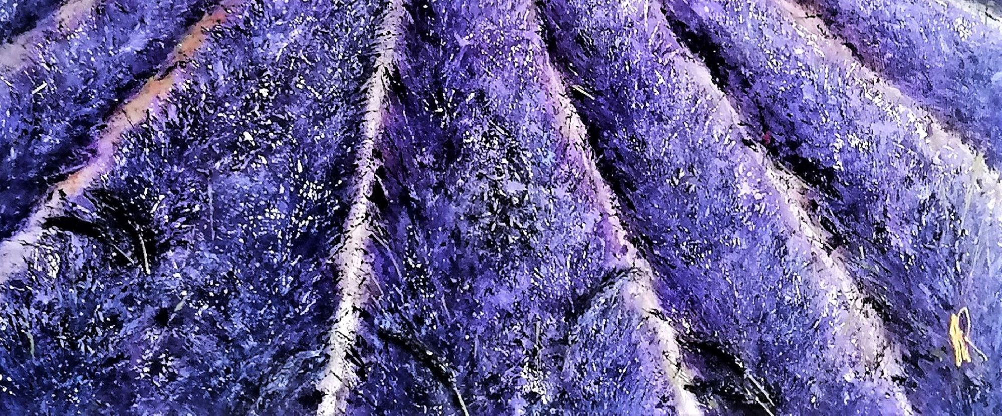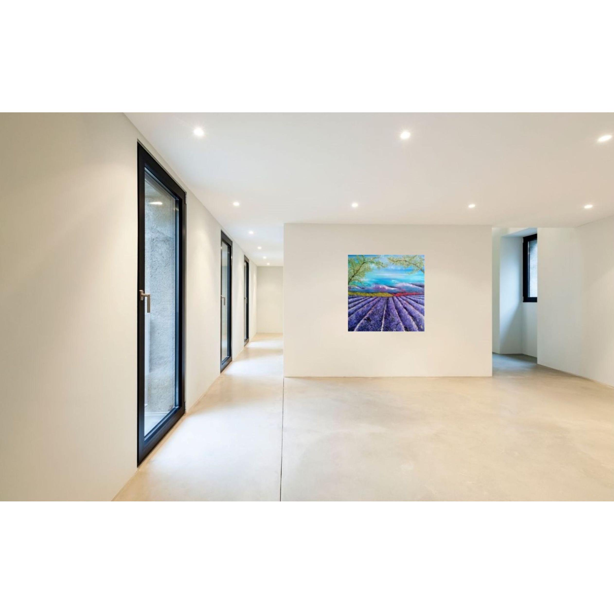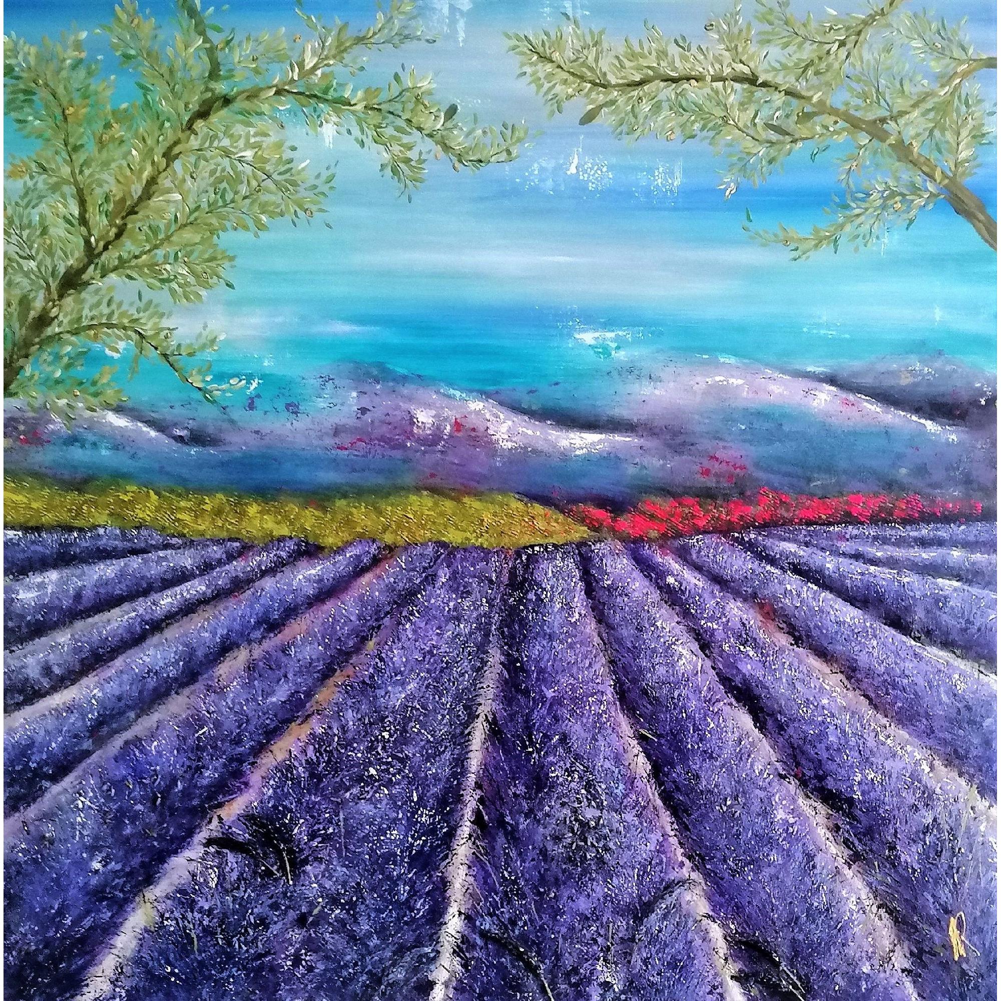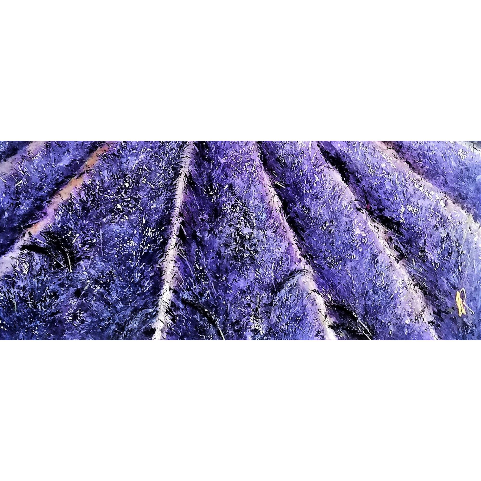 Les dégradés de bleus et violets de la provence l'été, le spectacle des champs de lavande avec au fond les montagnes qui se dessinent. Toile sur chassis 3D de 80x80x4 cm, peinture acrylique, petits reliefs par endroits, collage de quelques brins de véritable lavande, de quelques feuilles d'olivier, légères touches de feuilles miroir dorées. Finition vernis.