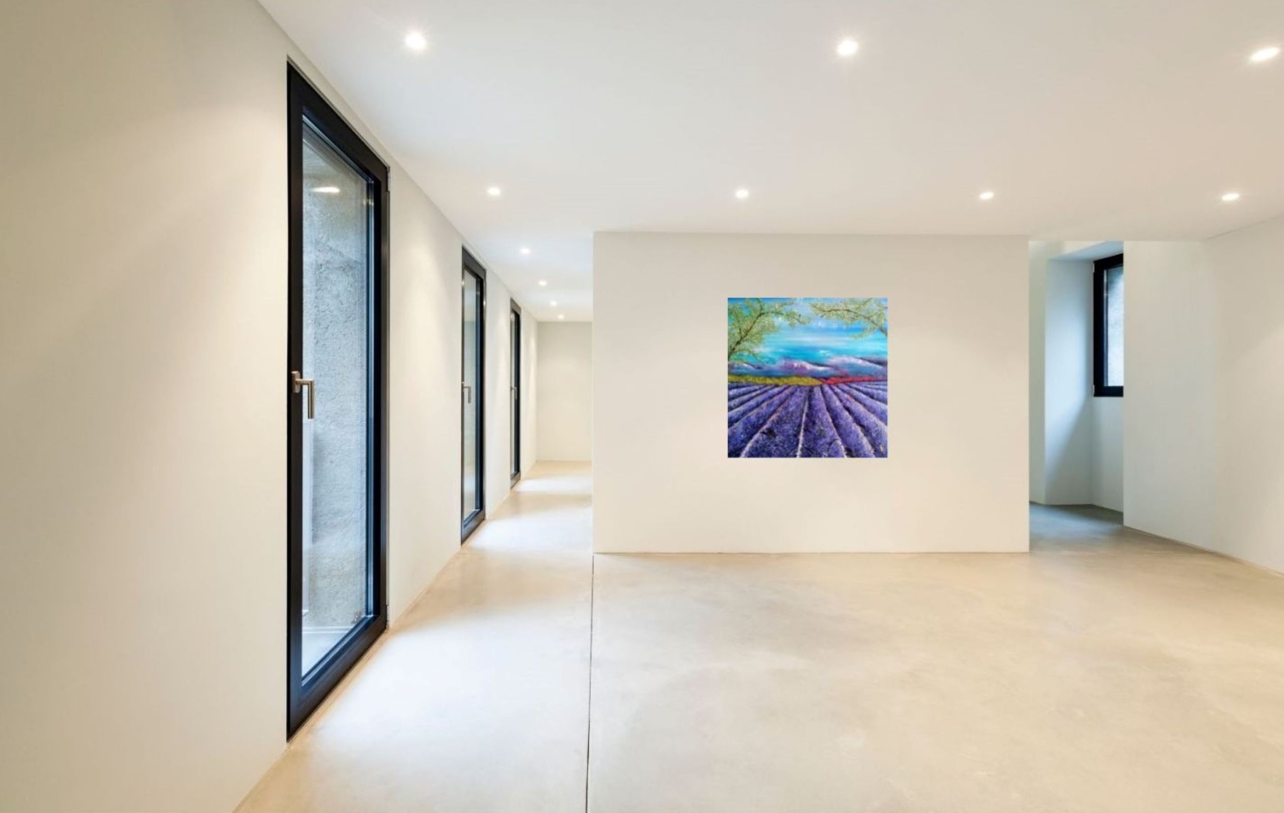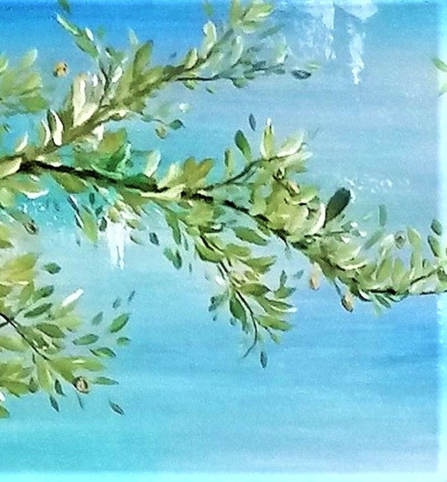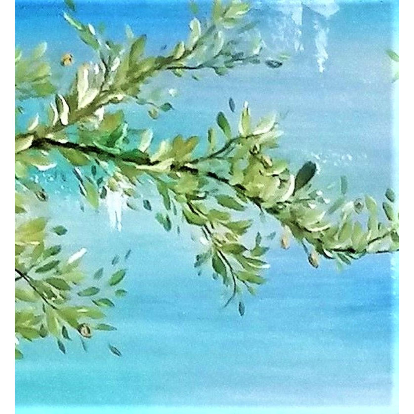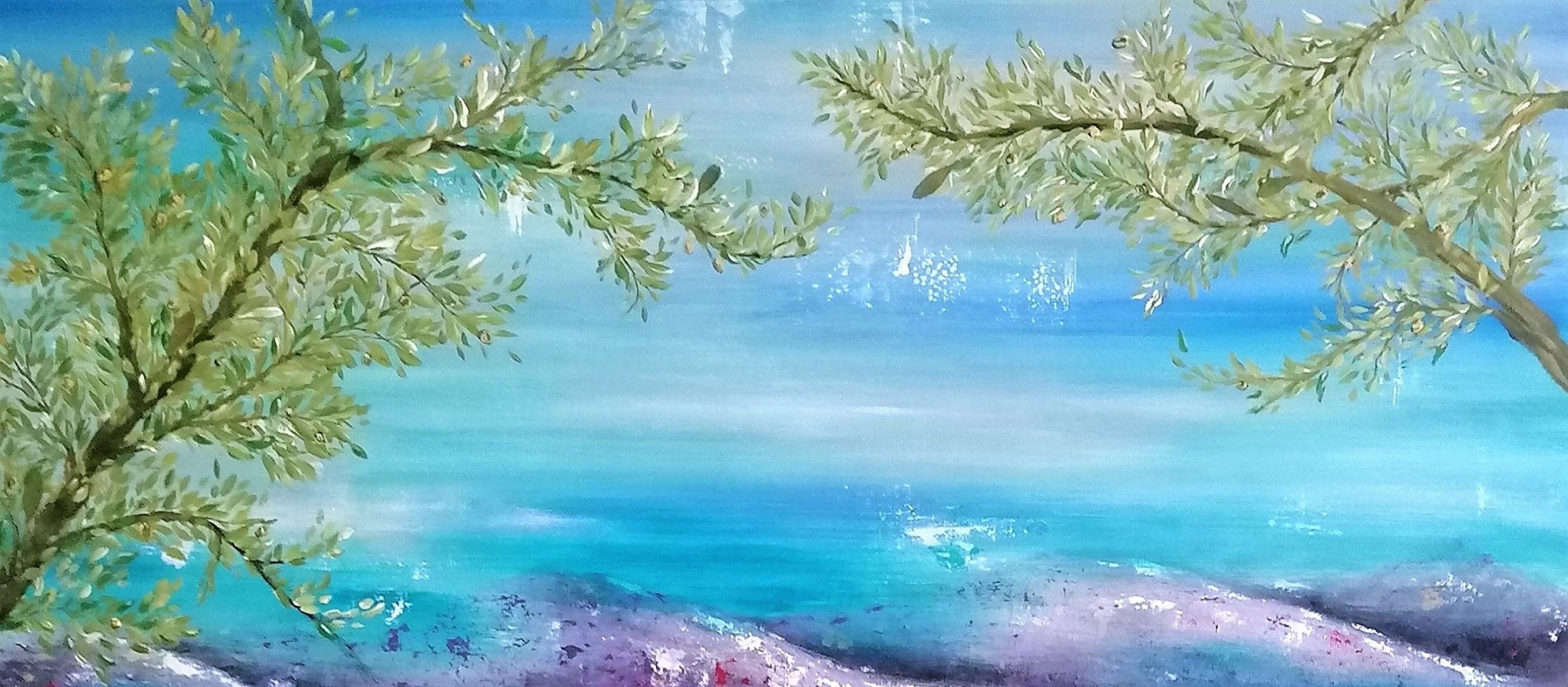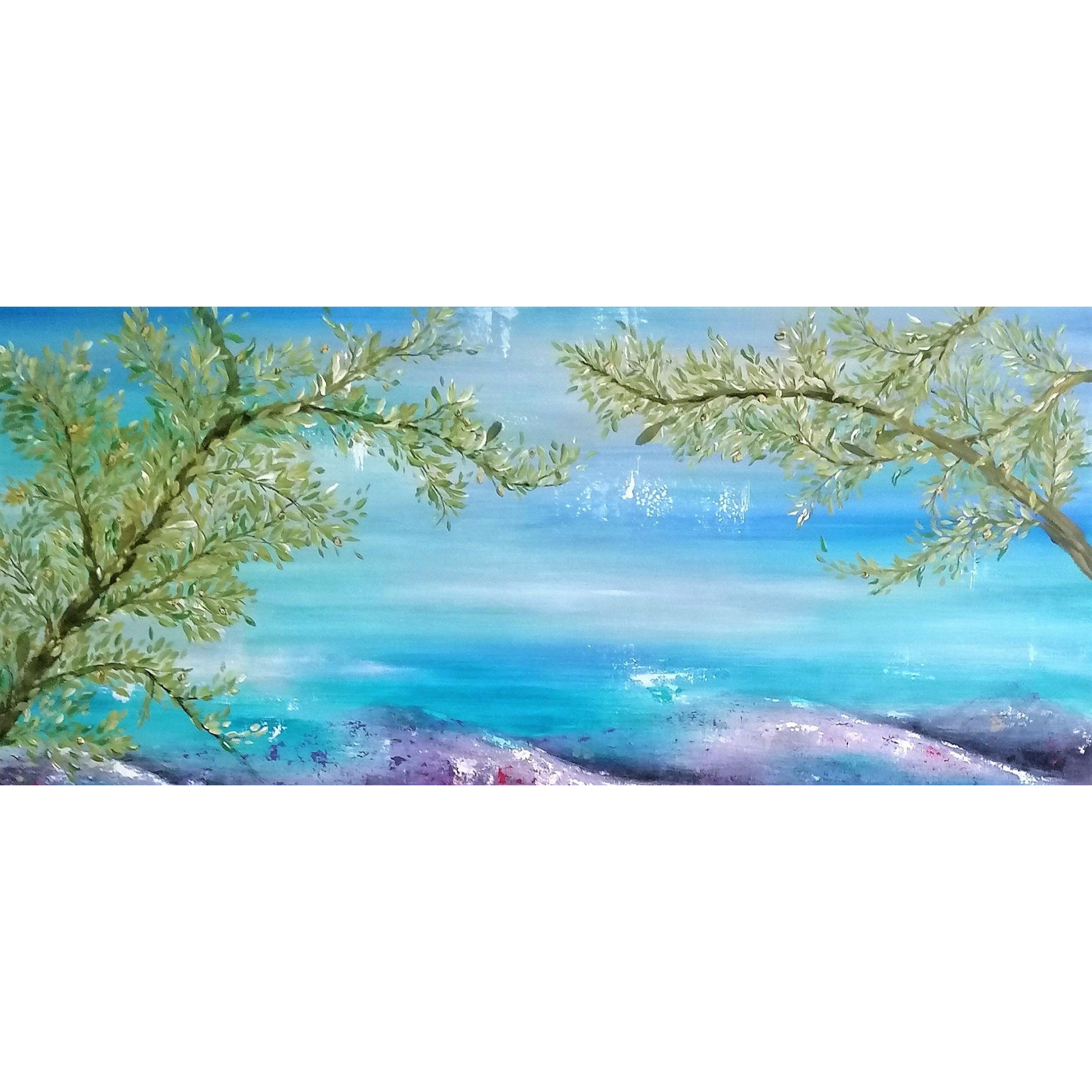 Les dégradés de bleus et violets de la provence l'été, le spectacle des champs de lavande avec au fond les montagnes qui se dessinent. Toile sur chassis 3D de 80x80x4 cm, peinture acrylique, petits reliefs par endroits, collage de quelques brins de véritable lavande, de quelques feuilles d'olivier, légères touches de feuilles miroir dorées. Finition vernis.