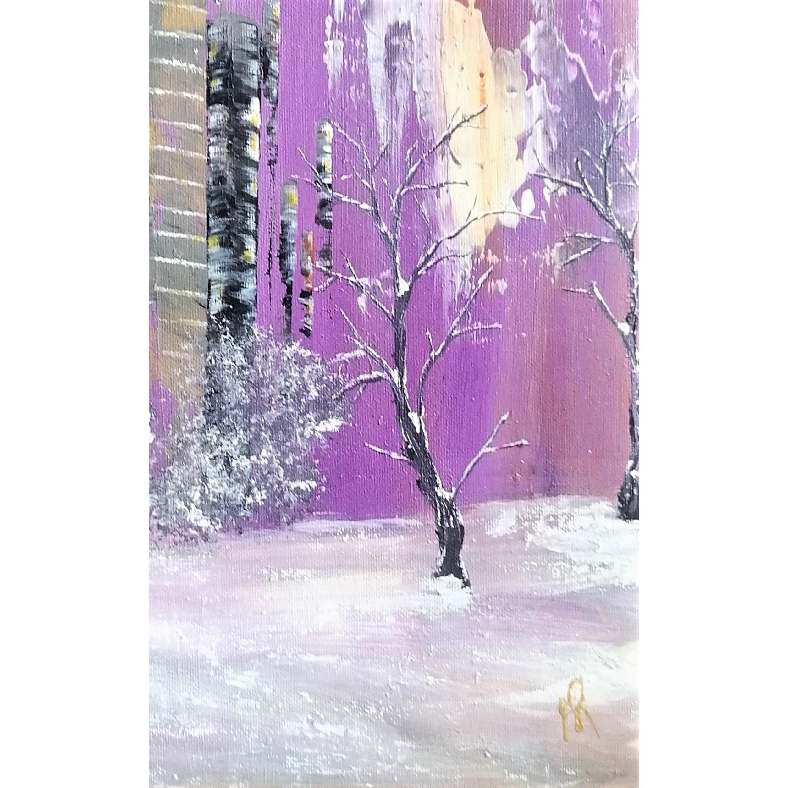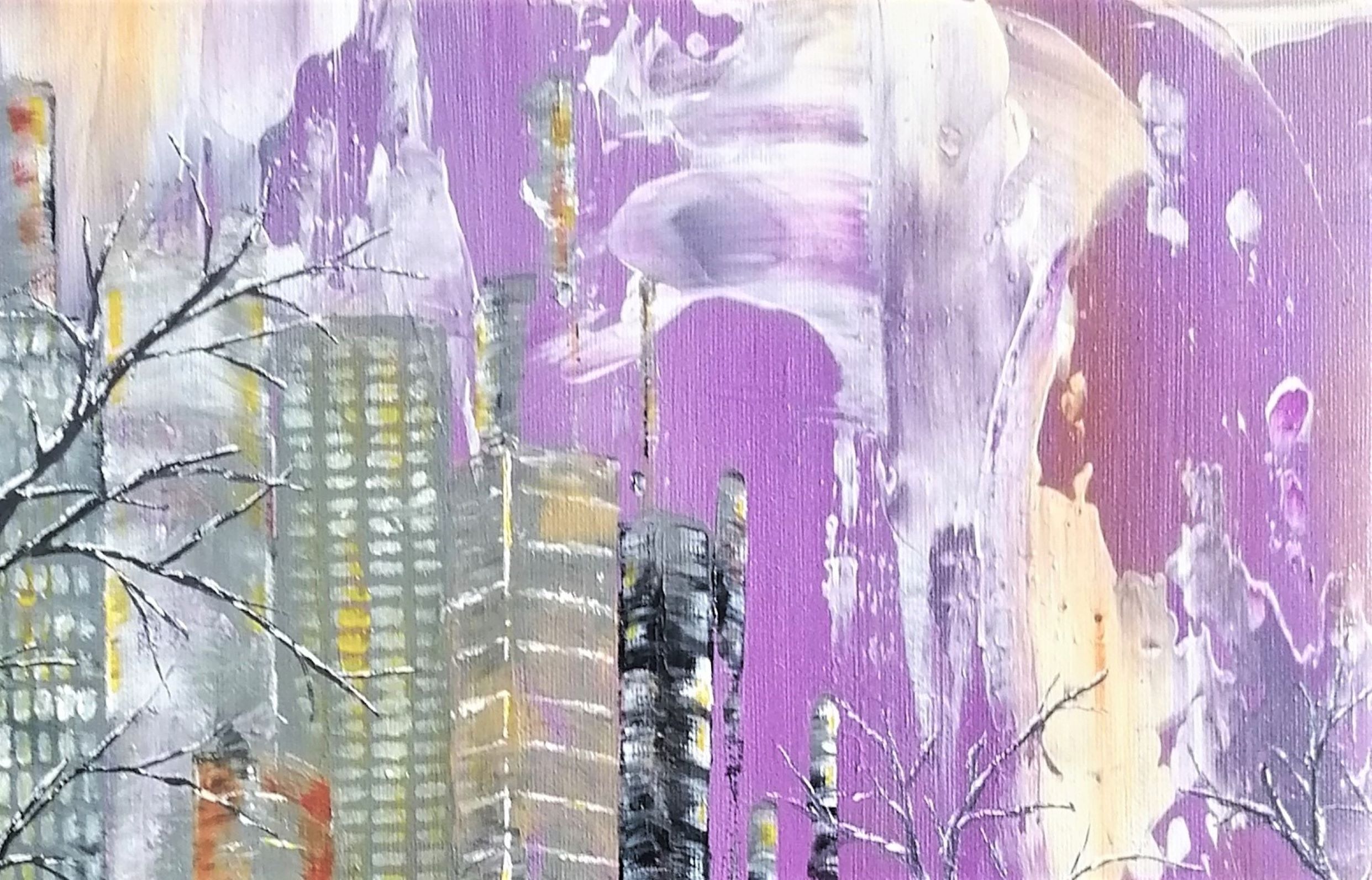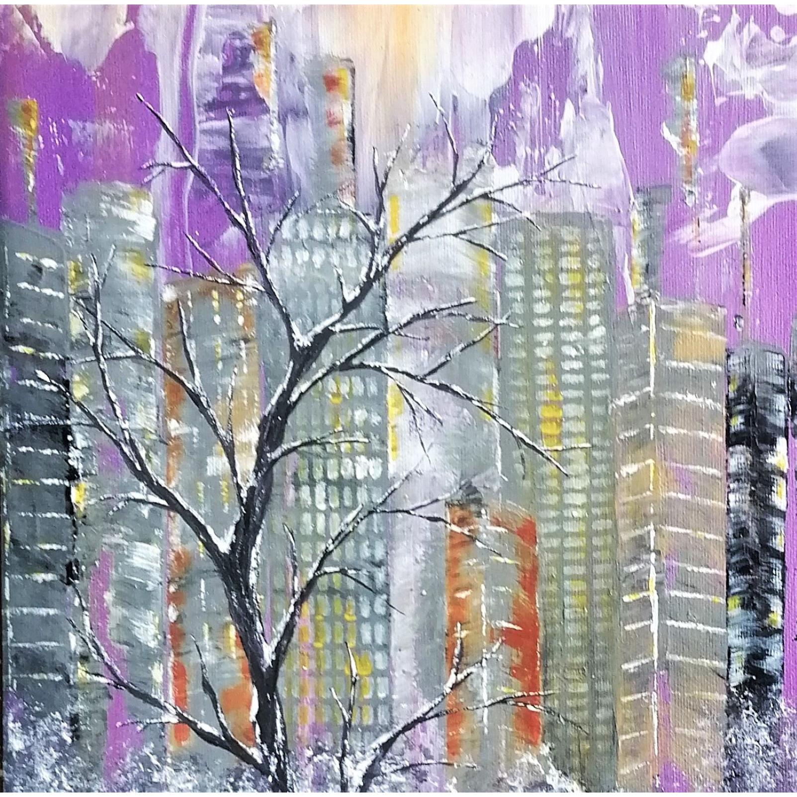 Les tours, les arbres, l'union de l' urbanisation et de la nature sur cette représentation aux tonalités tournant autour du rose et du violet s'accordant avec le gris et constrastant avec le blanc pour évoquer l'atmosphère hivernale en laissant de côté sa froideur. Acrylique sur toile tendue sur une plaque de bois de 30x30 cm, finition vernis.
