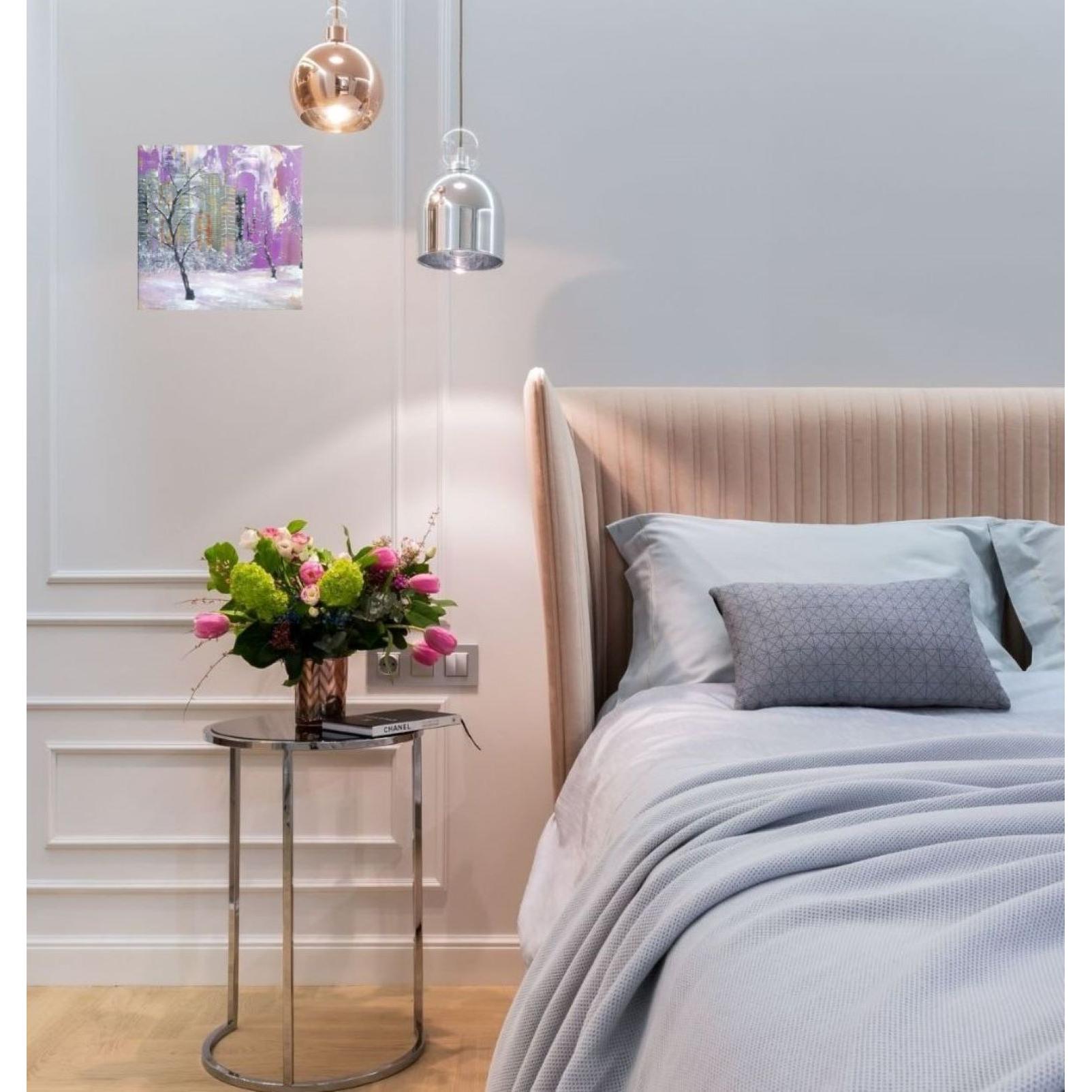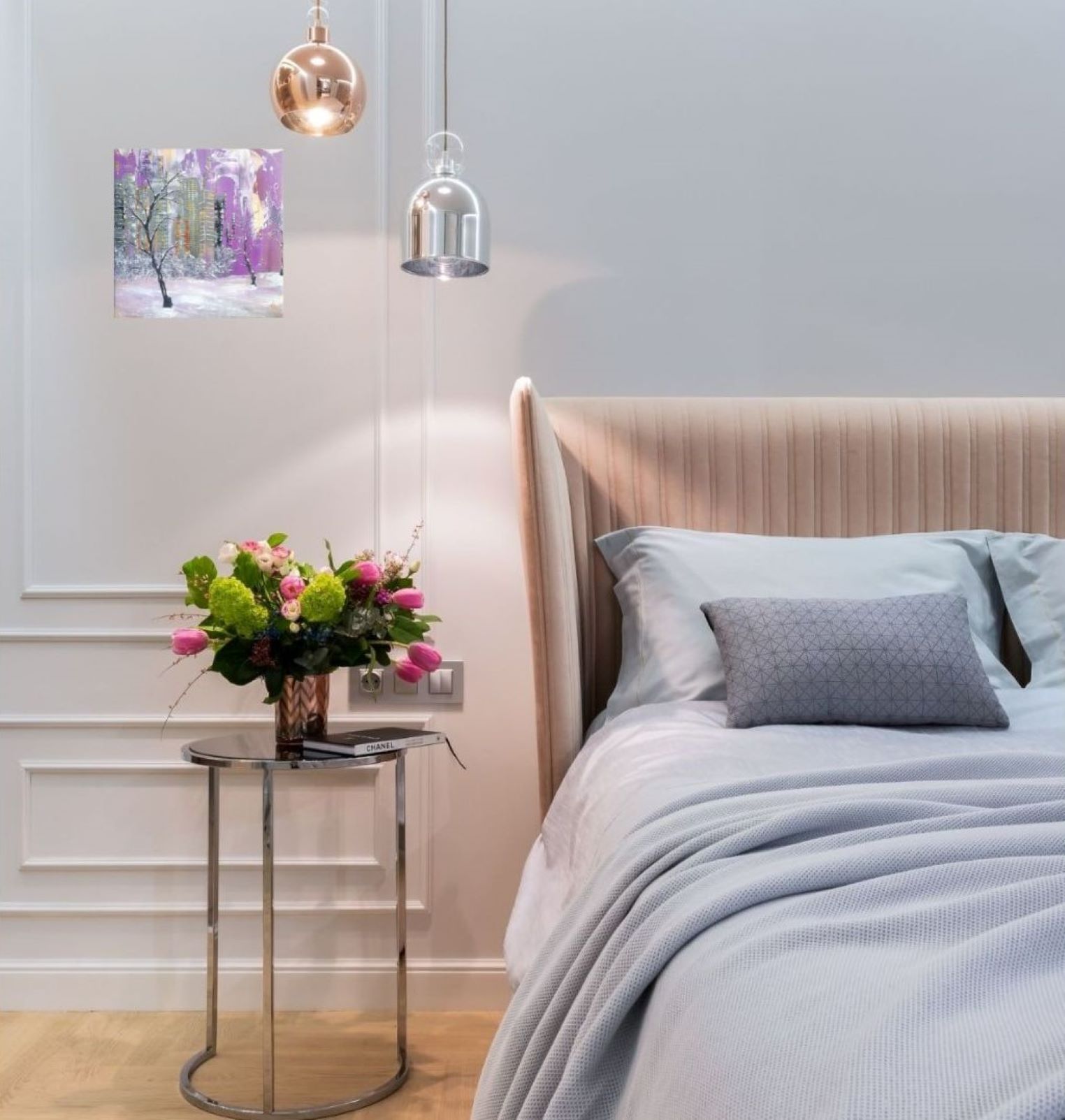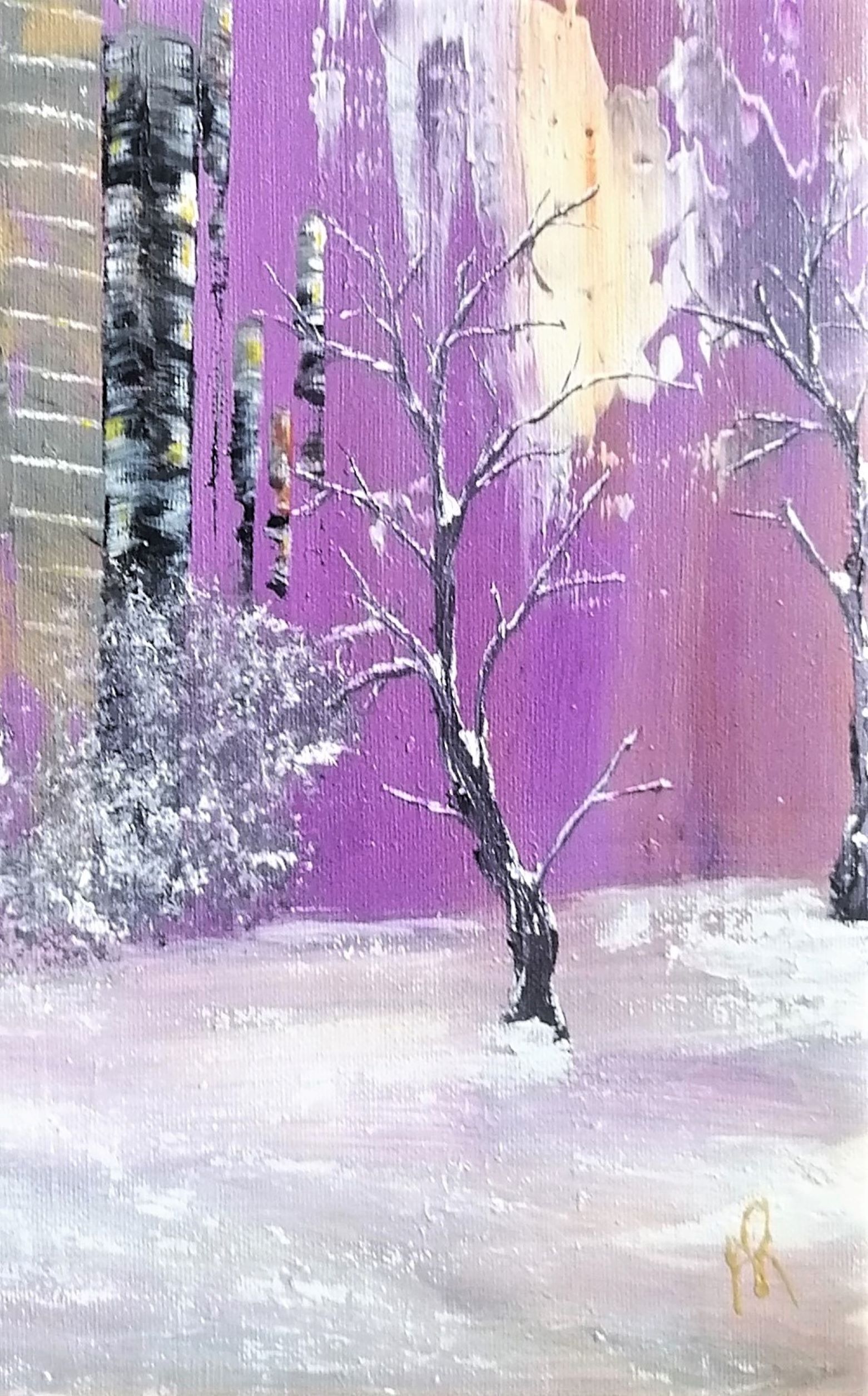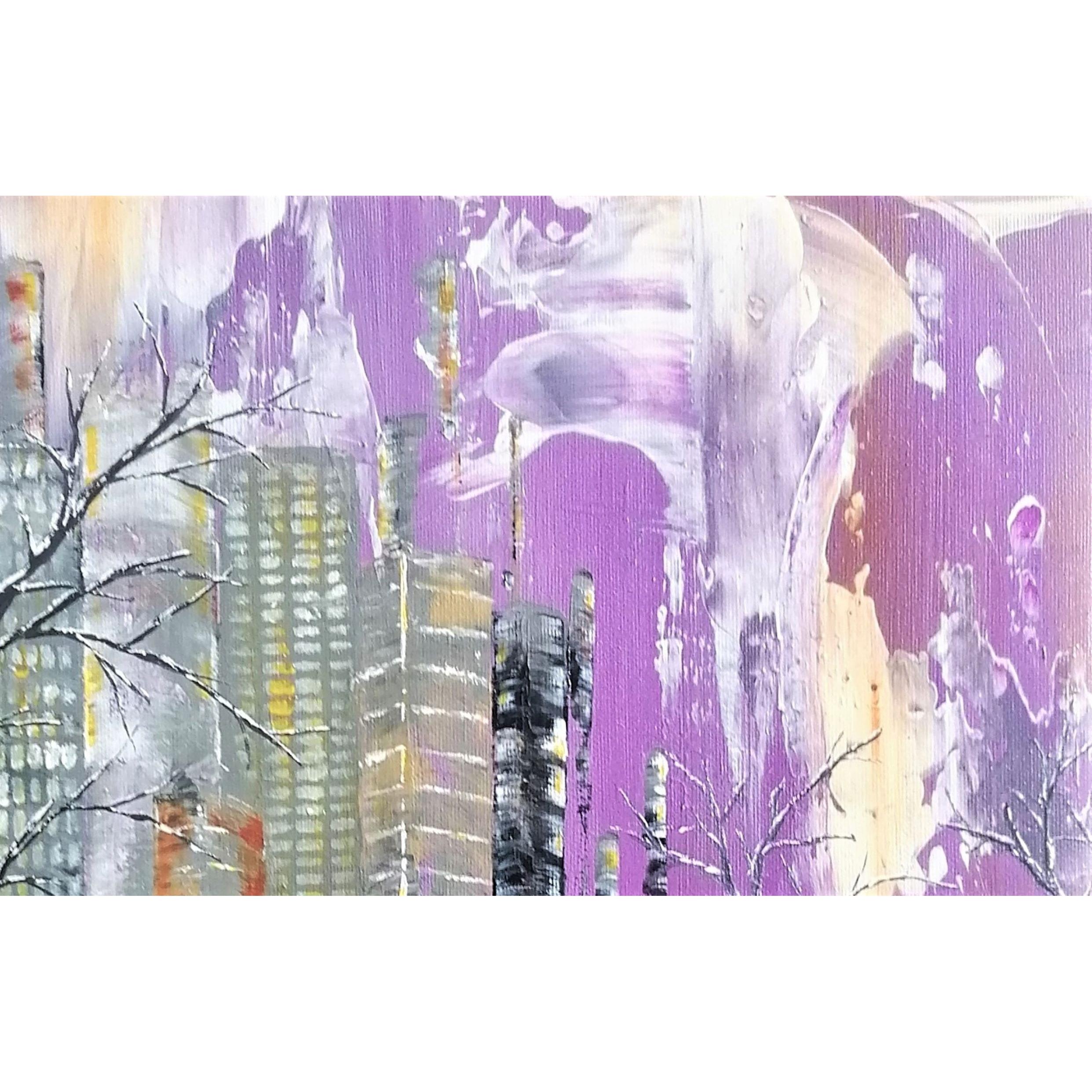 Les tours, les arbres, l'union de l' urbanisation et de la nature sur cette représentation aux tonalités tournant autour du rose et du violet s'accordant avec le gris et constrastant avec le blanc pour évoquer l'atmosphère hivernale en laissant de côté sa froideur. Acrylique sur toile tendue sur une plaque de bois de 30x30 cm, finition vernis.