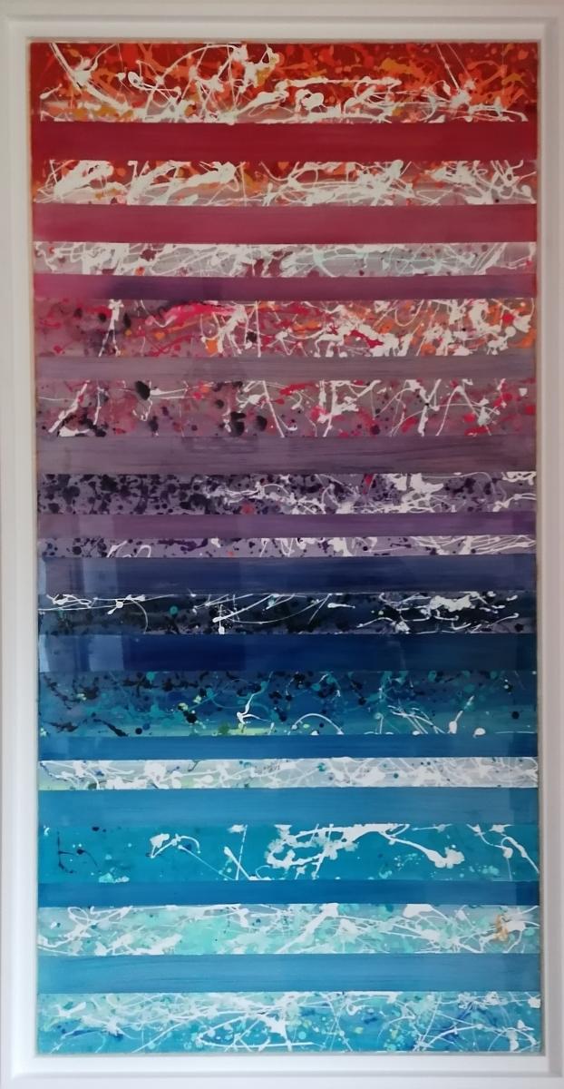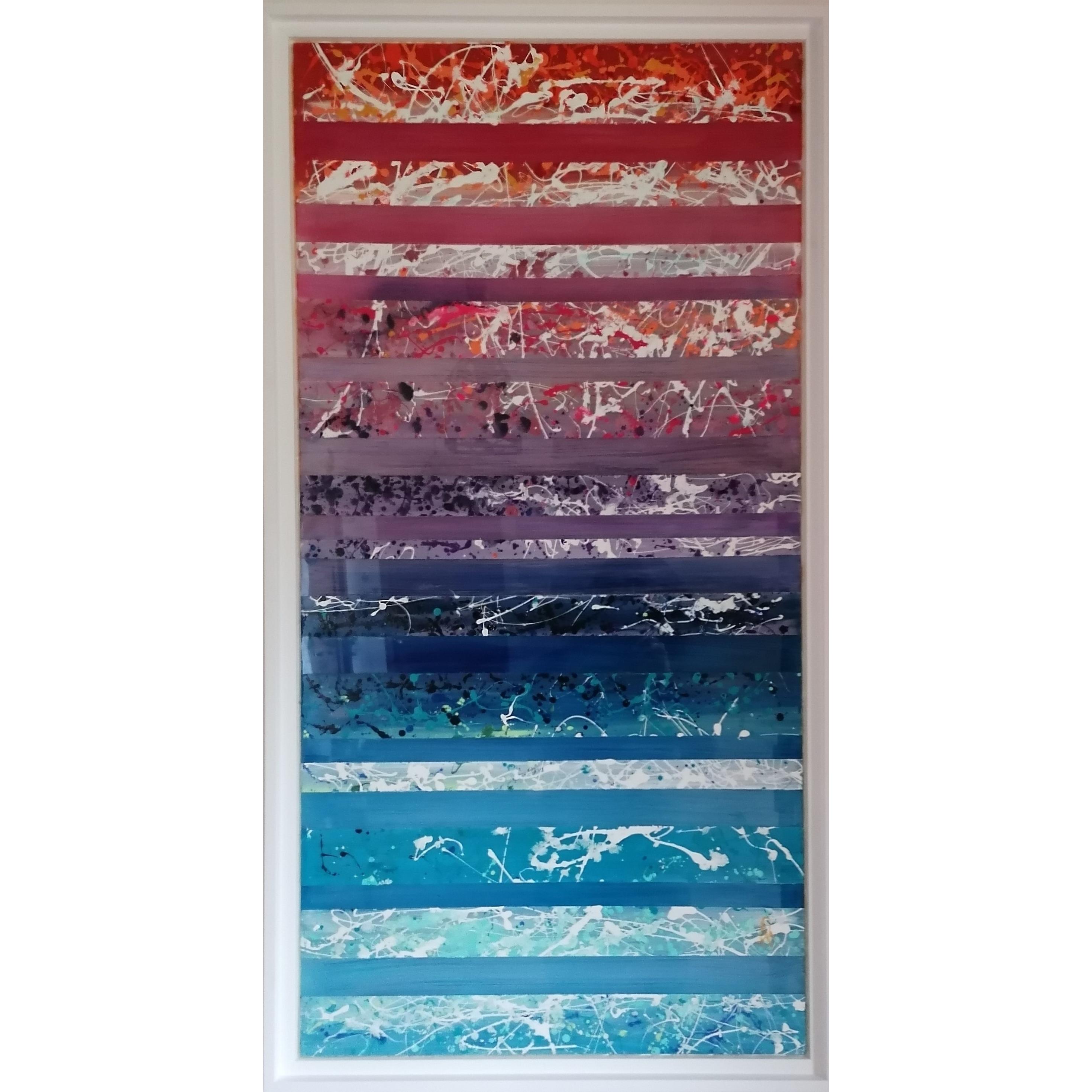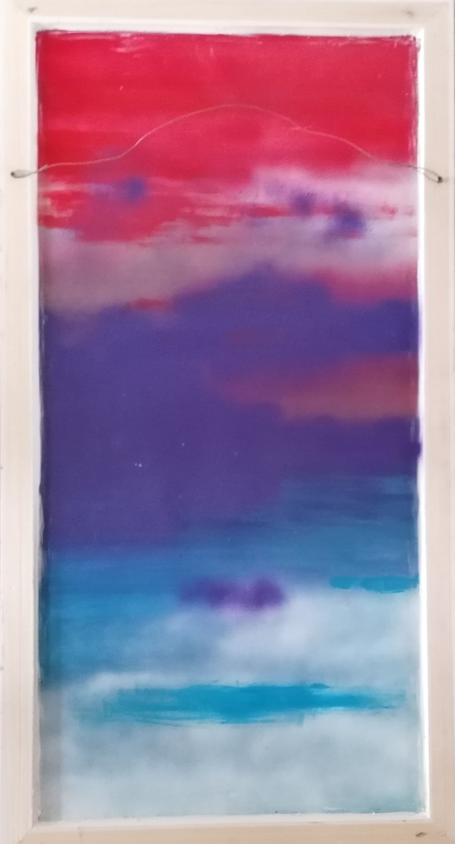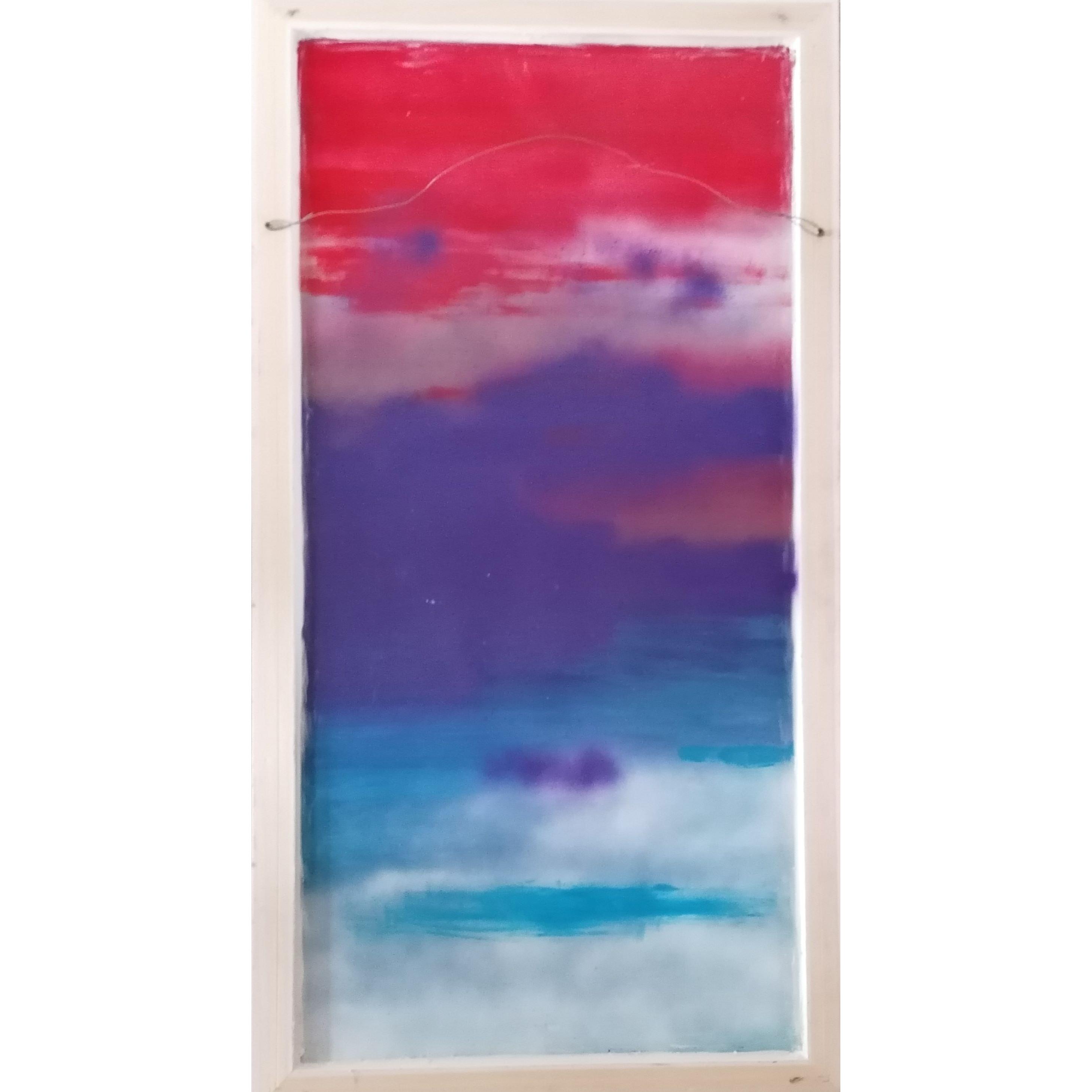 Cette réalisation très colorée est en peinture acrylique sur plaque de plexiglas de 100x50 cm, peinte en technique de dripping sur le devant, et teintée de couleurs sur le verso, tout en conservant les transparences et la brillance.Elle est encadrée dans un cadre américain en bois blanc. Dimensions finales 105x56 cm.Les couleurs vives, chaudes et froides, évoquent de manière abstraite la rêverie d'un soir devant le soleil se couchant sur l'océan. Finition vernis.
