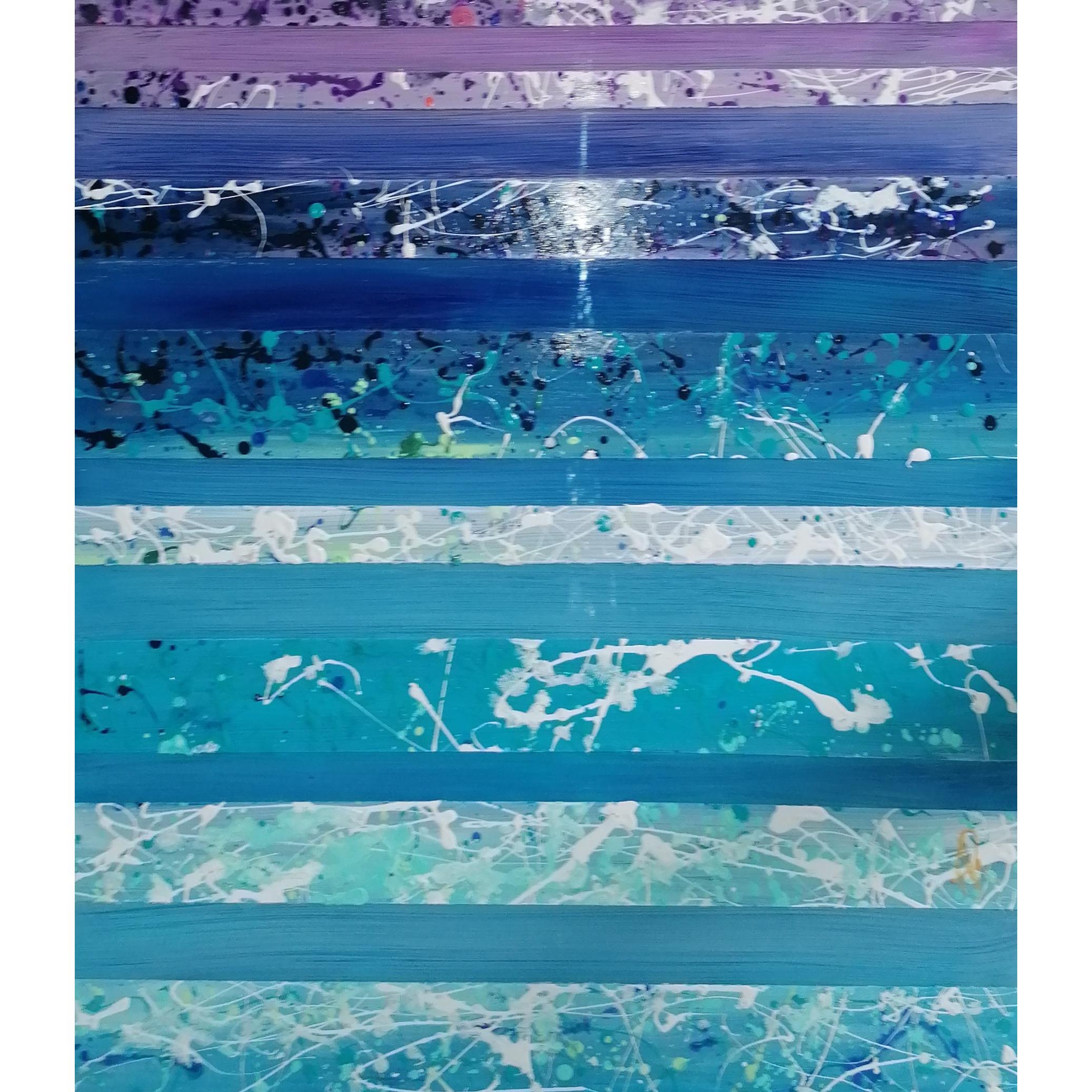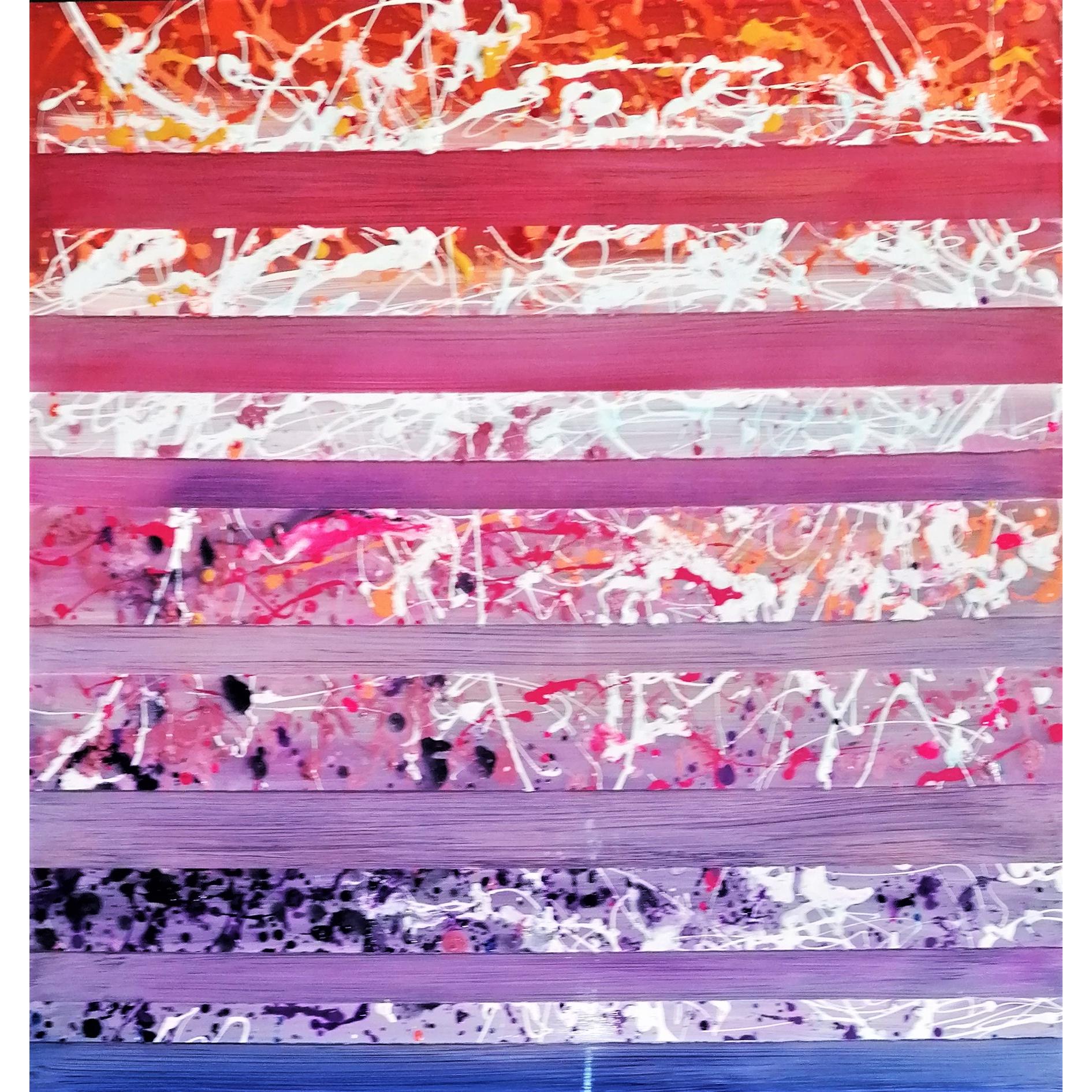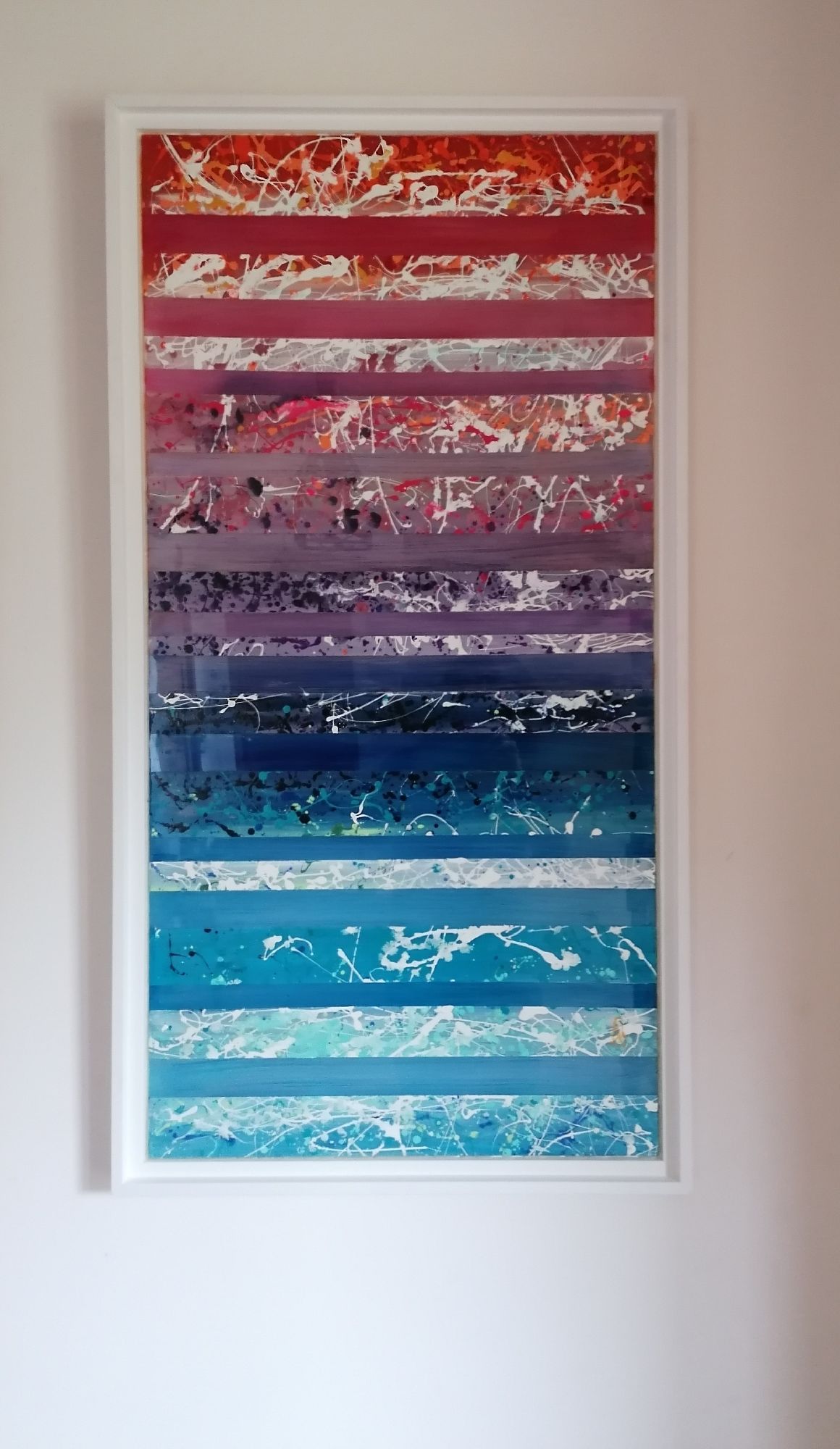 Cette réalisation très colorée est en peinture acrylique sur plaque de plexiglas de 100x50 cm, peinte en technique de dripping sur le devant, et teintée de couleurs sur le verso, tout en conservant les transparences et la brillance.Elle est encadrée dans un cadre américain en bois blanc. Dimensions finales 105x56 cm.Les couleurs vives, chaudes et froides, évoquent de manière abstraite la rêverie d'un soir devant le soleil se couchant sur l'océan. Finition vernis.