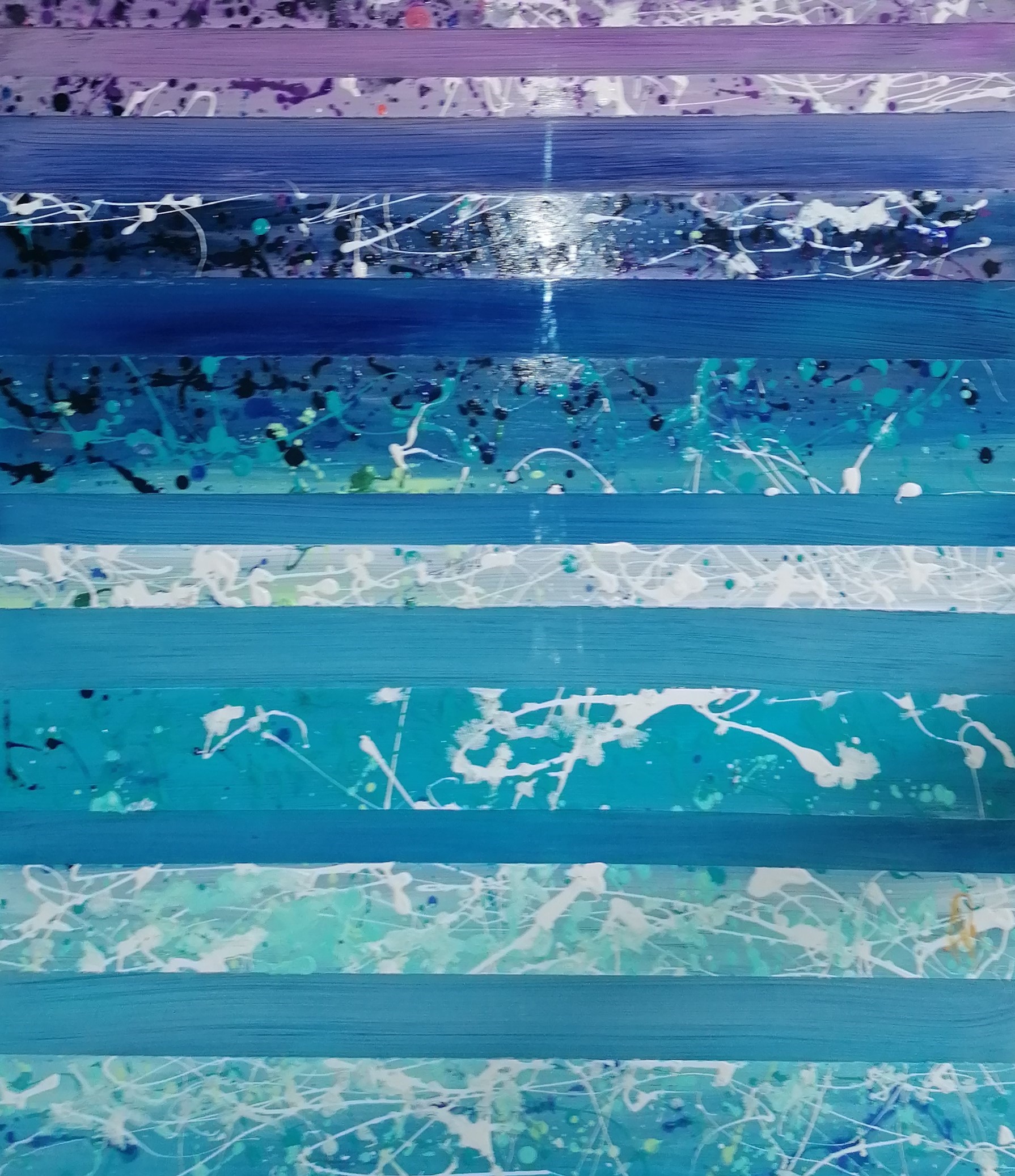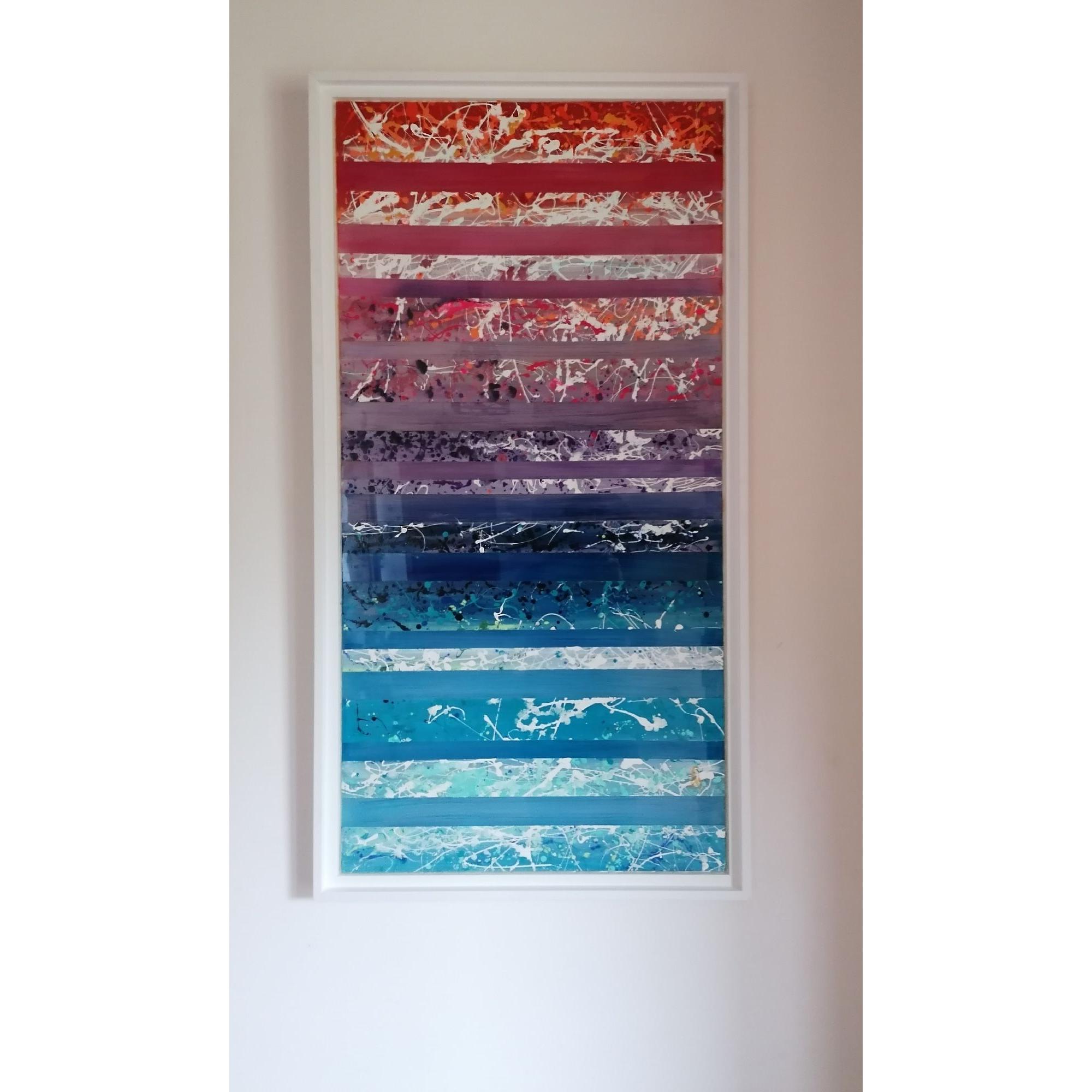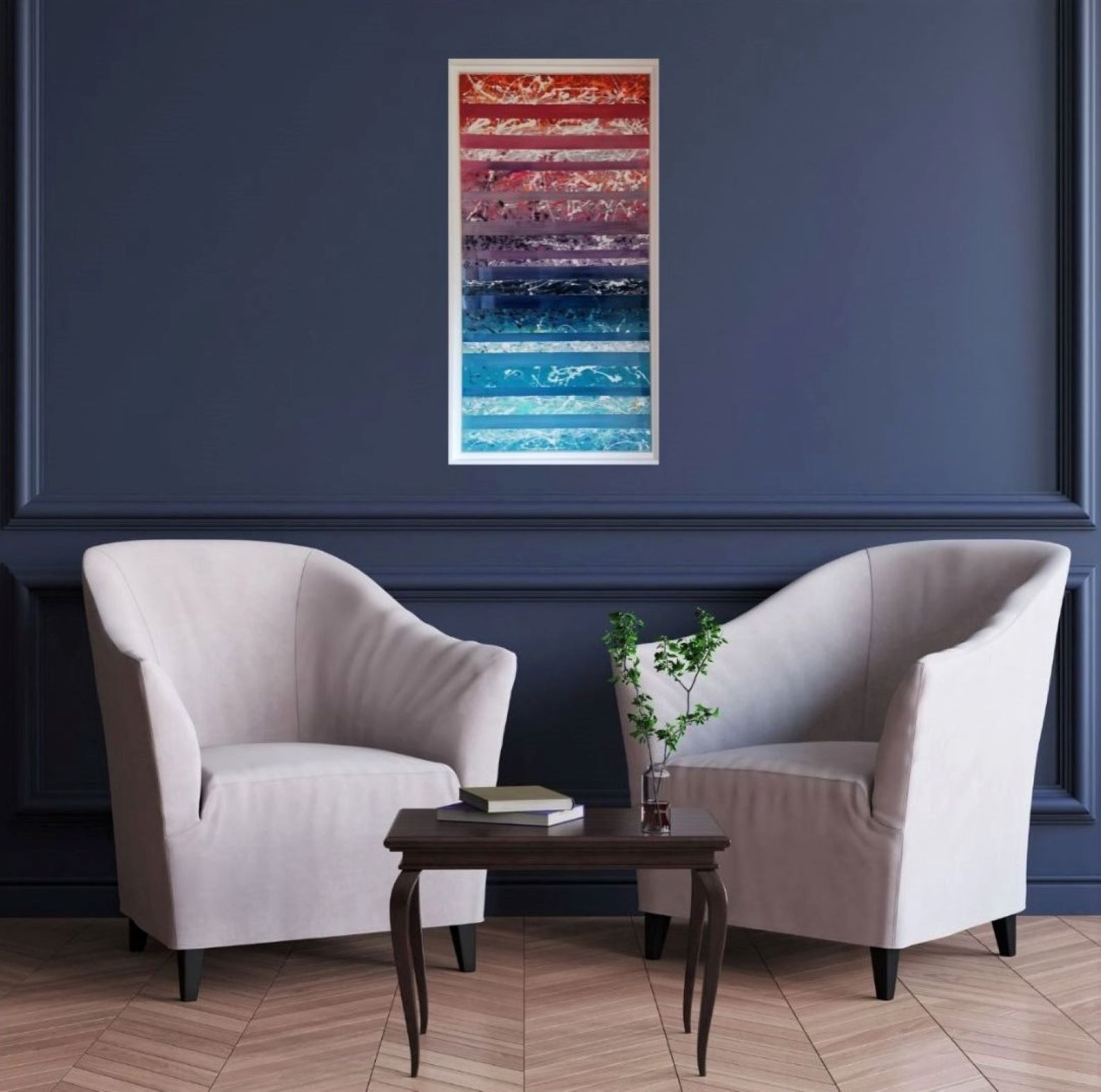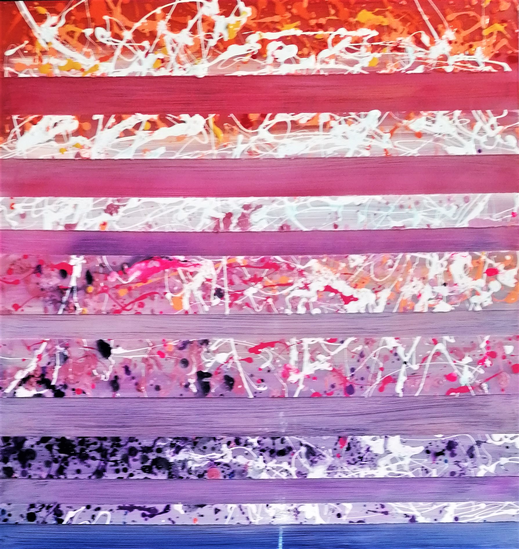 Cette réalisation très colorée est en peinture acrylique sur plaque de plexiglas de 100x50 cm, peinte en technique de dripping sur le devant, et teintée de couleurs sur le verso, tout en conservant les transparences et la brillance.Elle est encadrée dans un cadre américain en bois blanc. Dimensions finales 105x56 cm.Les couleurs vives, chaudes et froides, évoquent de manière abstraite la rêverie d'un soir devant le soleil se couchant sur l'océan. Finition vernis.