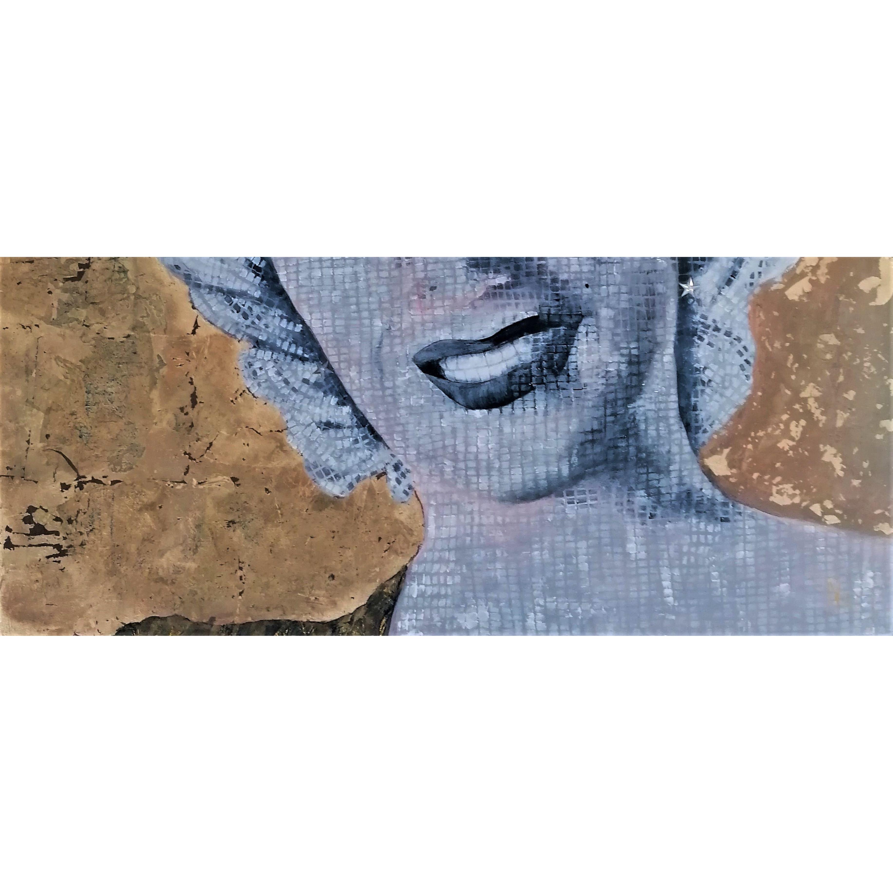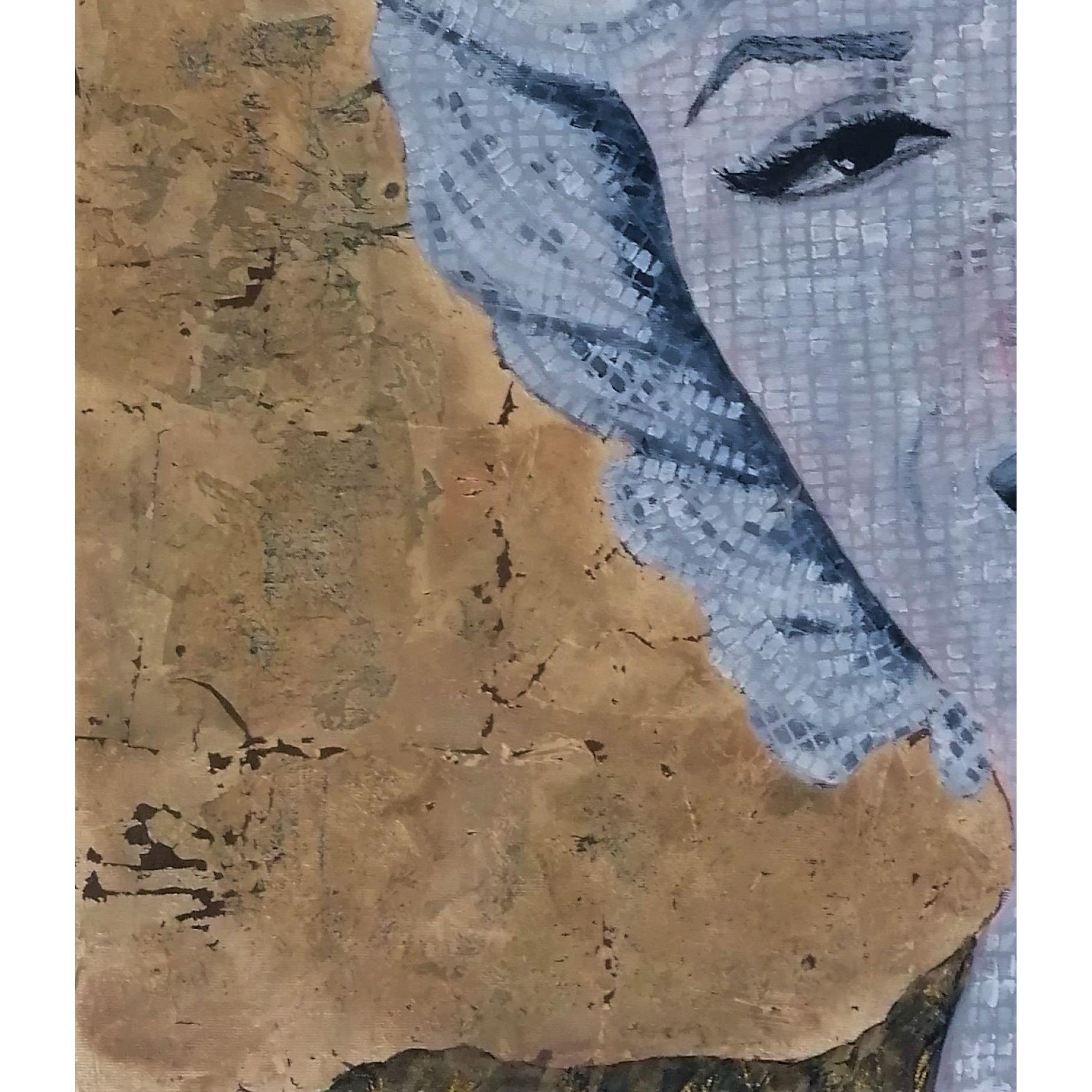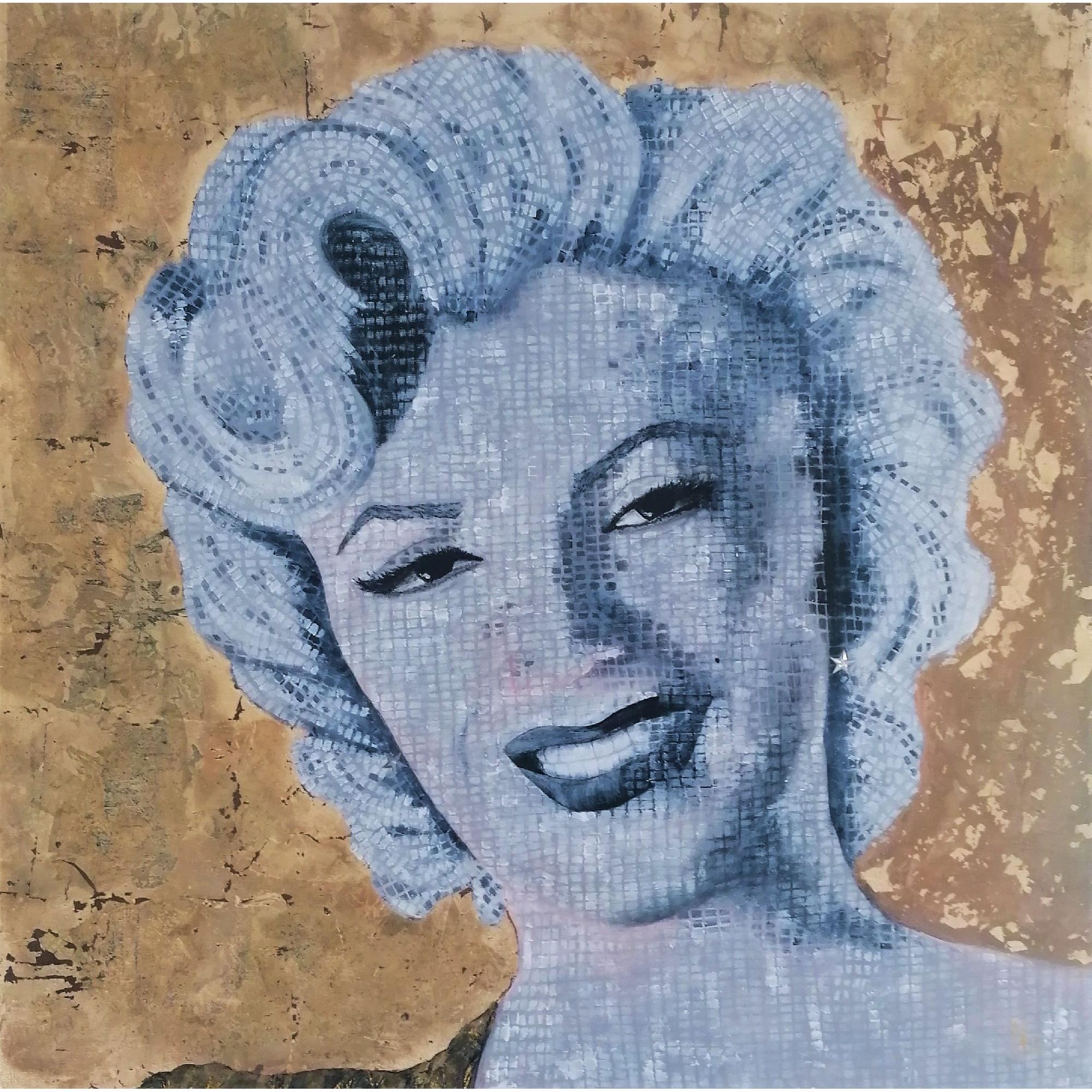 Ce portrait de Marylin, lumineuse et tout sourire, est réalisé à la façon d'une mosaique sur une toile tendue sur châssis de 80x80x4 cm, en acrylique, feuille d'or métallique oxydée par endroits, et petits collages (papier de soie, faux diamants). Finition vernis