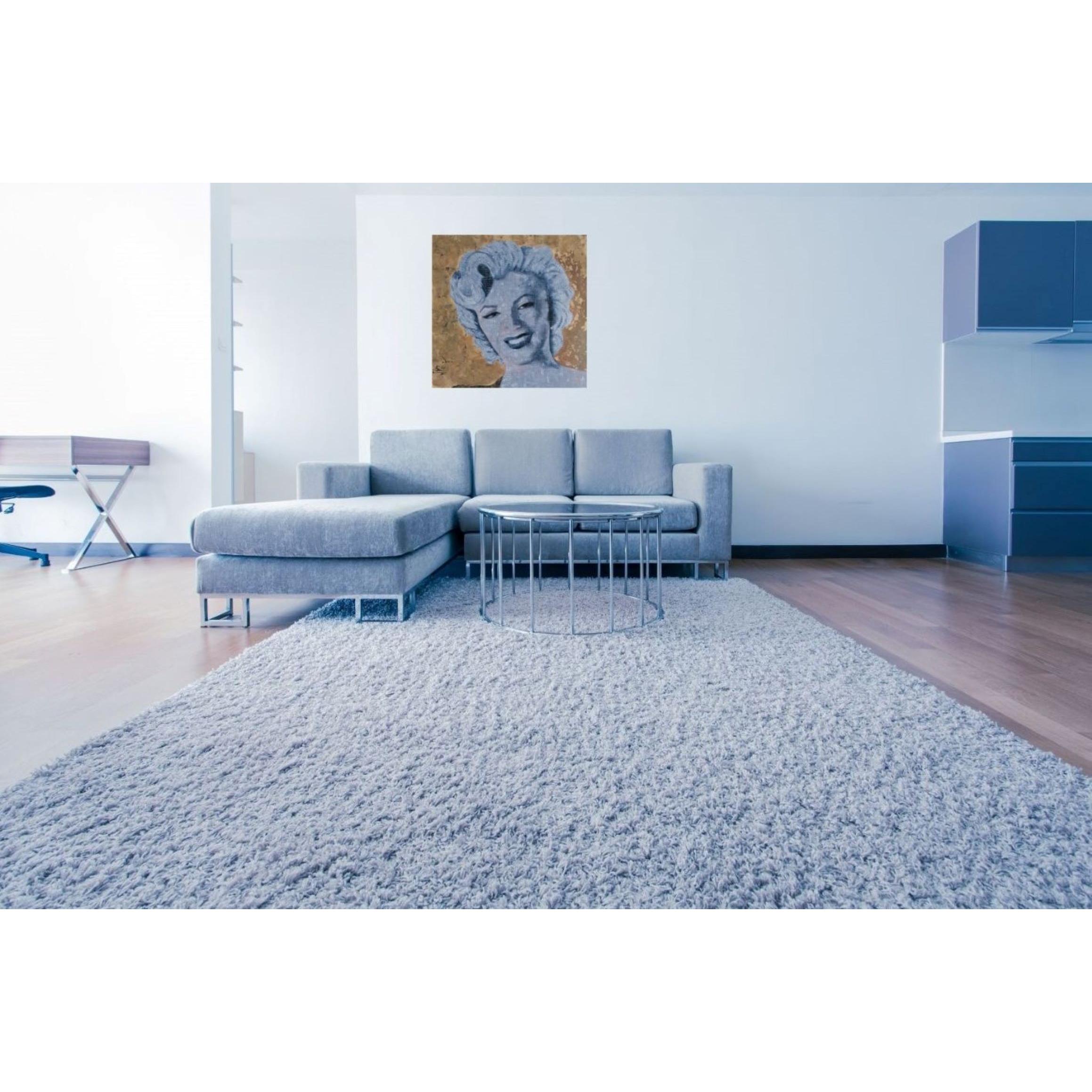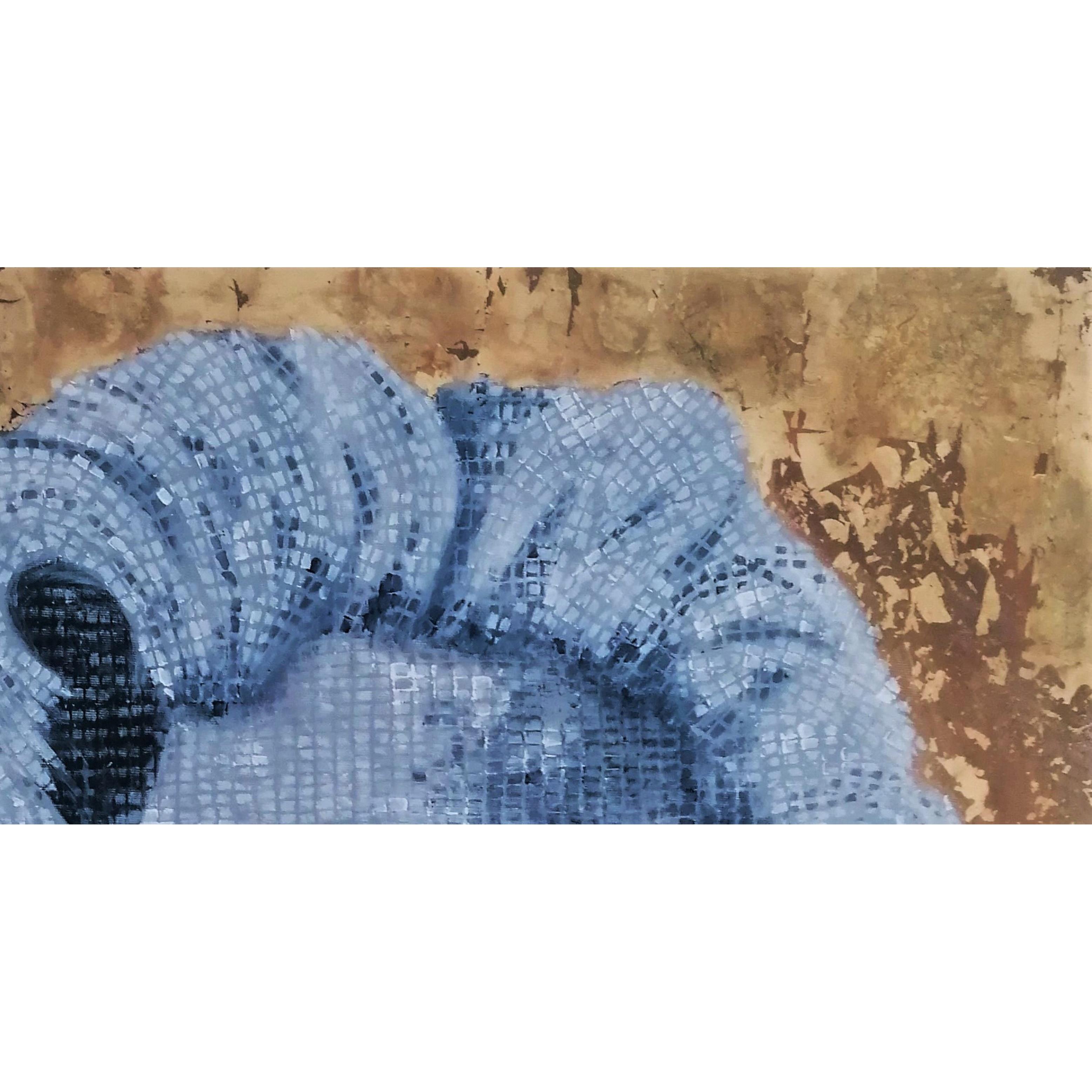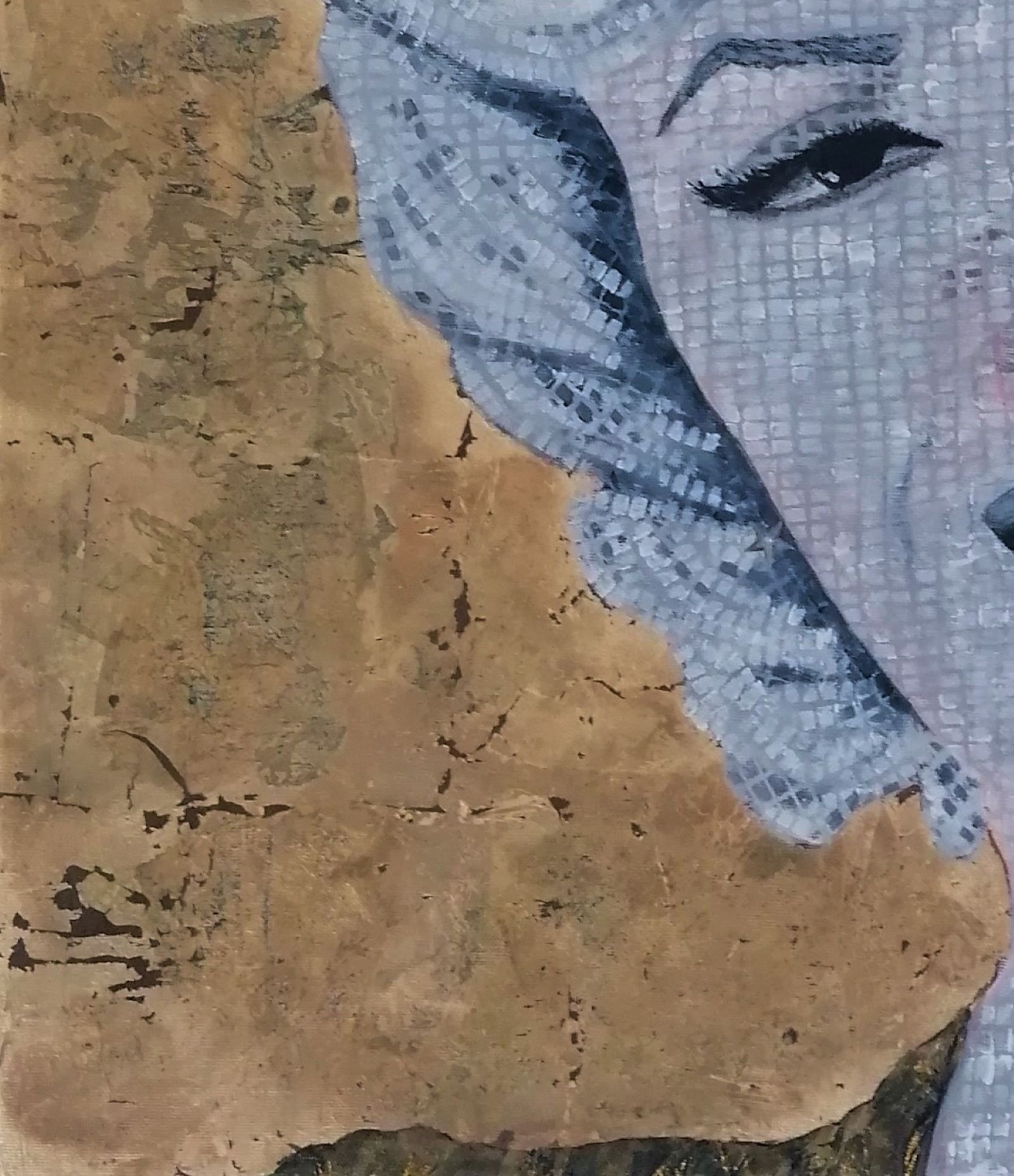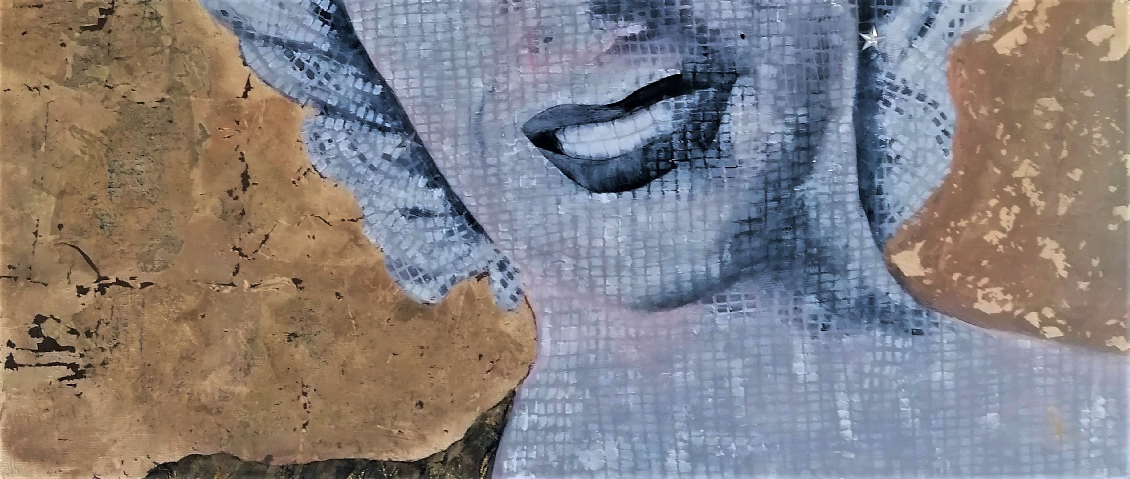 Ce portrait de Marylin, lumineuse et tout sourire, est réalisé à la façon d'une mosaique sur une toile tendue sur châssis de 80x80x4 cm, en acrylique, feuille d'or métallique oxydée par endroits, et petits collages (papier de soie, faux diamants). Finition vernis